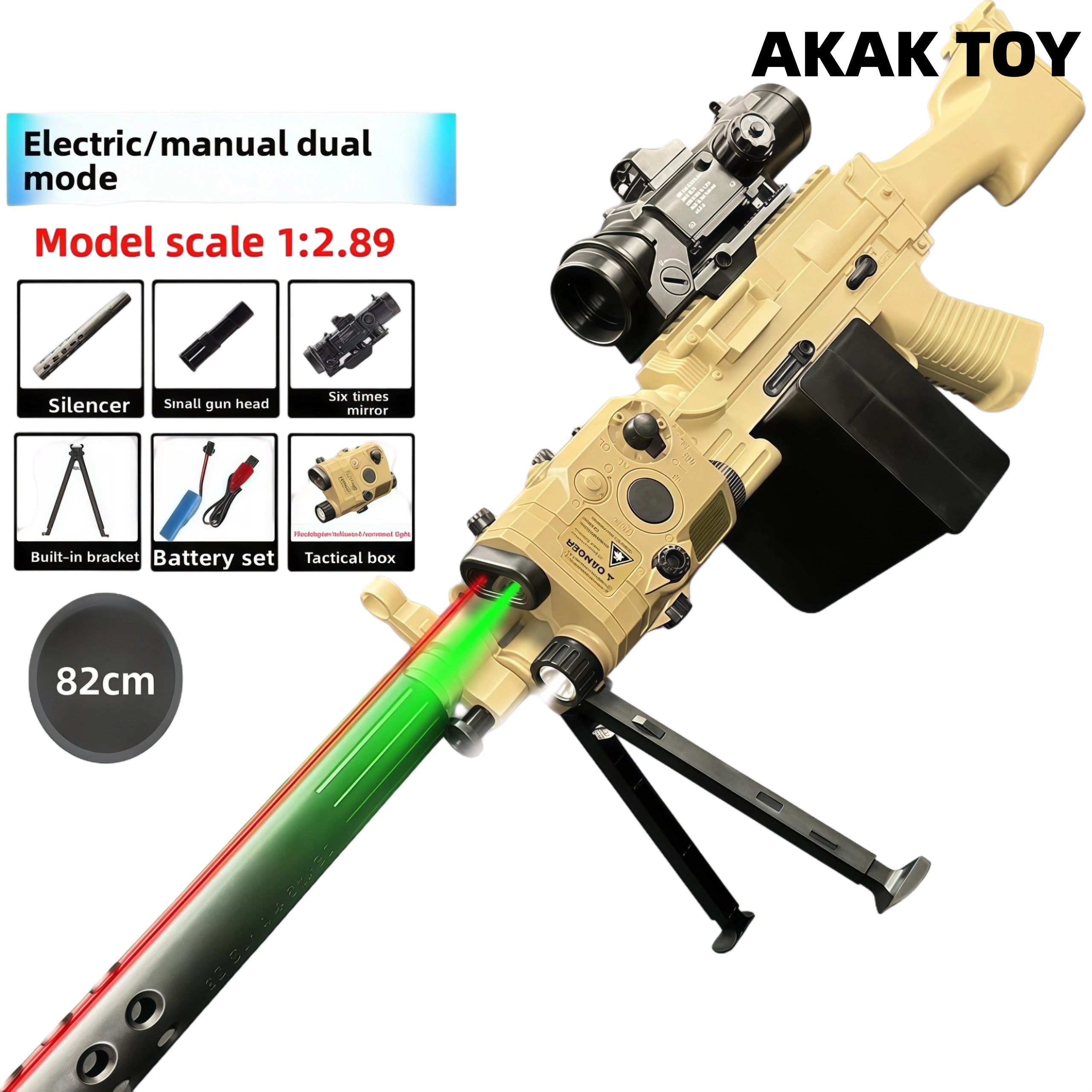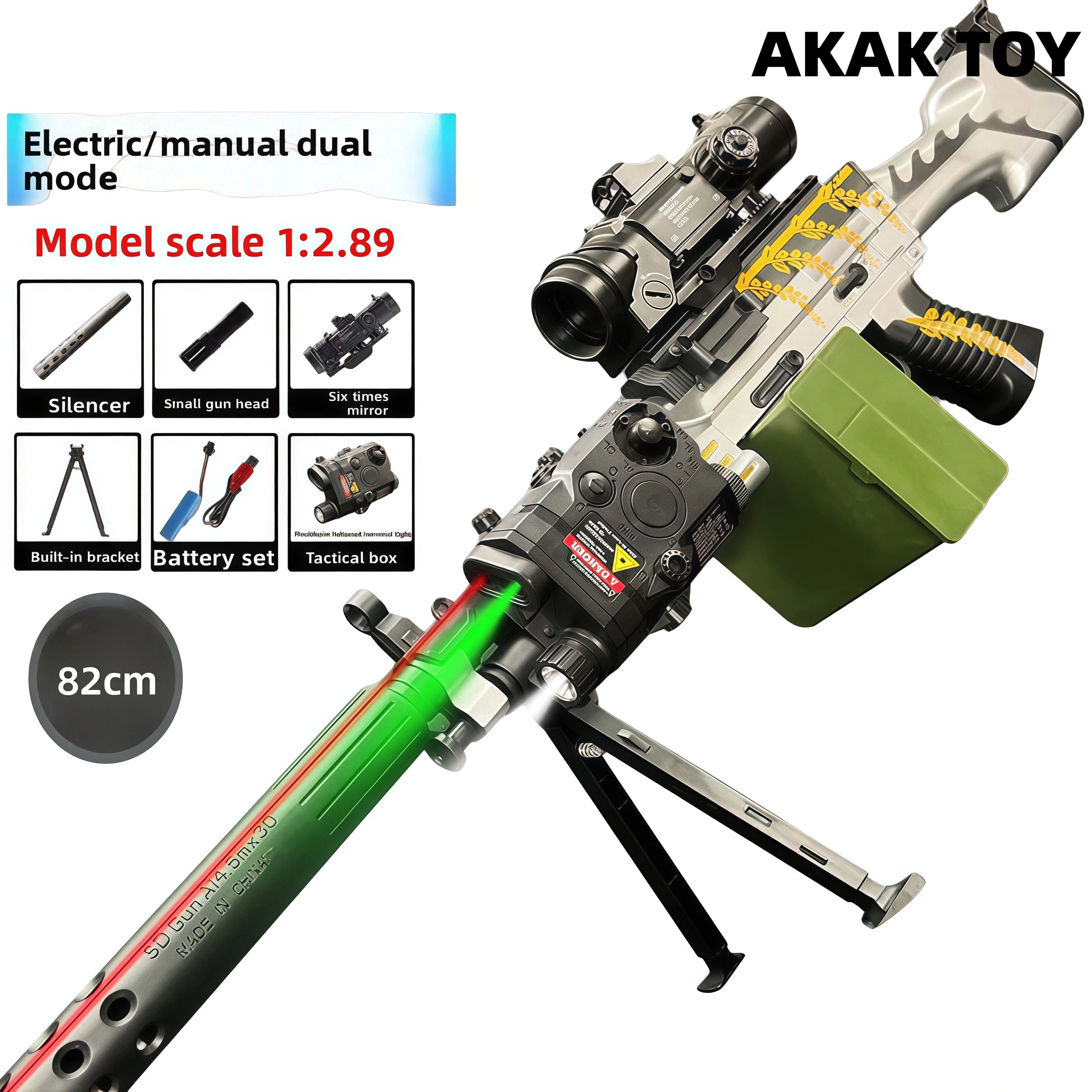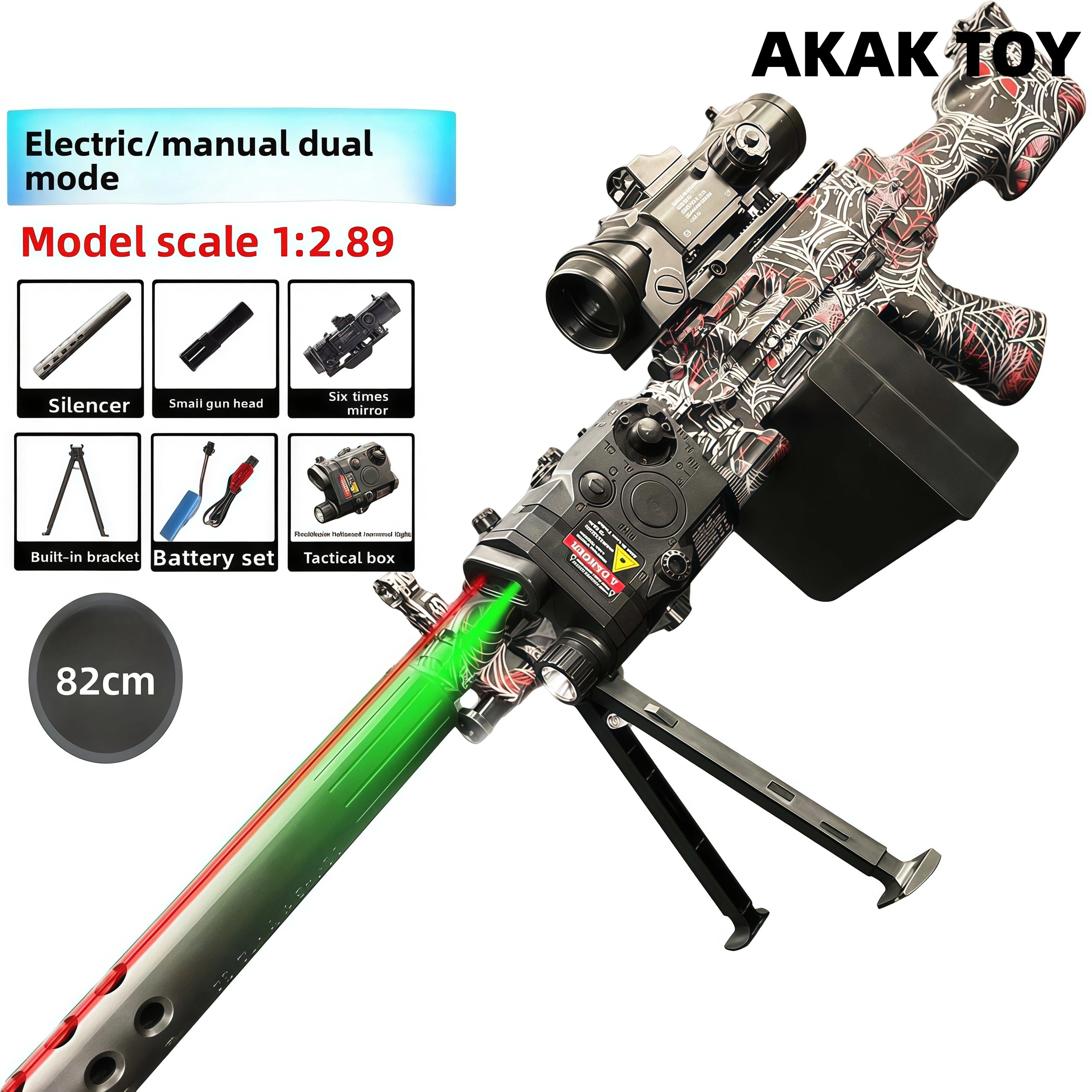-This M249 V4 features a 1:1 scale replica, delivering a realistic and immersive shooting experience. -Supports both electric and manual modes, allowing for easy switching between smooth strafing and precise bursts, satisfying diverse playstyles. -Equipped with an extra-large magazine, it holds 800-1000 gel marbles at a time, allowing for smooth bursts without frequent reloads. Features:1. Removable accessories, lower magazine feed2. Fire rate: 260 FPS3. Range: 20-25 meters4. Material: Nylon5. Shooting mode: Electric/Manual6. Ammunition type: 7-8mm gel balls7. Size: 82 cm Packing List:1 * M249 gel gun1 * silencer1 * small gun head1 * 6x scope1 * built-in stand1 * tactical case1 * rechargeable 7.4V battery1 * USB charging cable1 * gel balls (10,000 pieces)