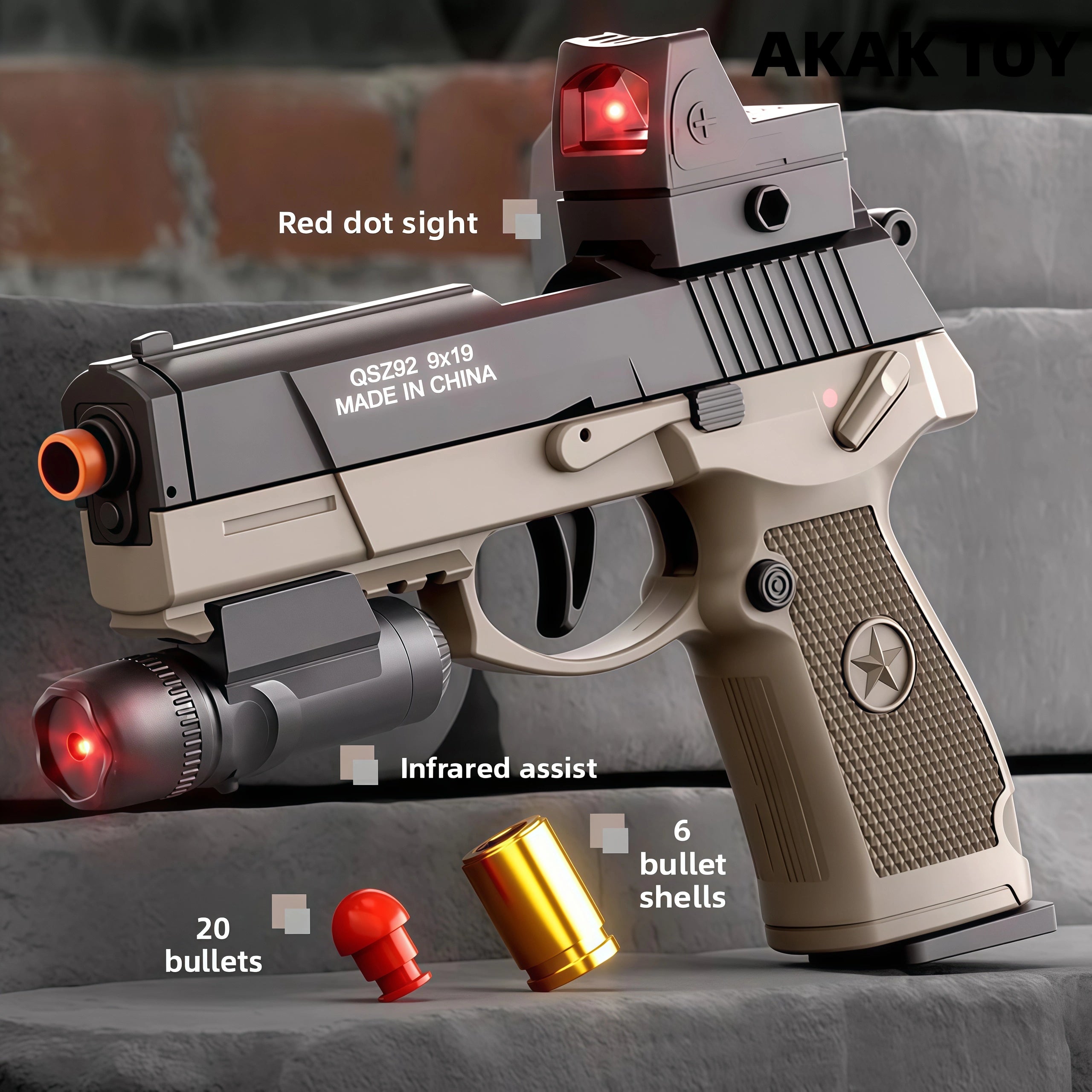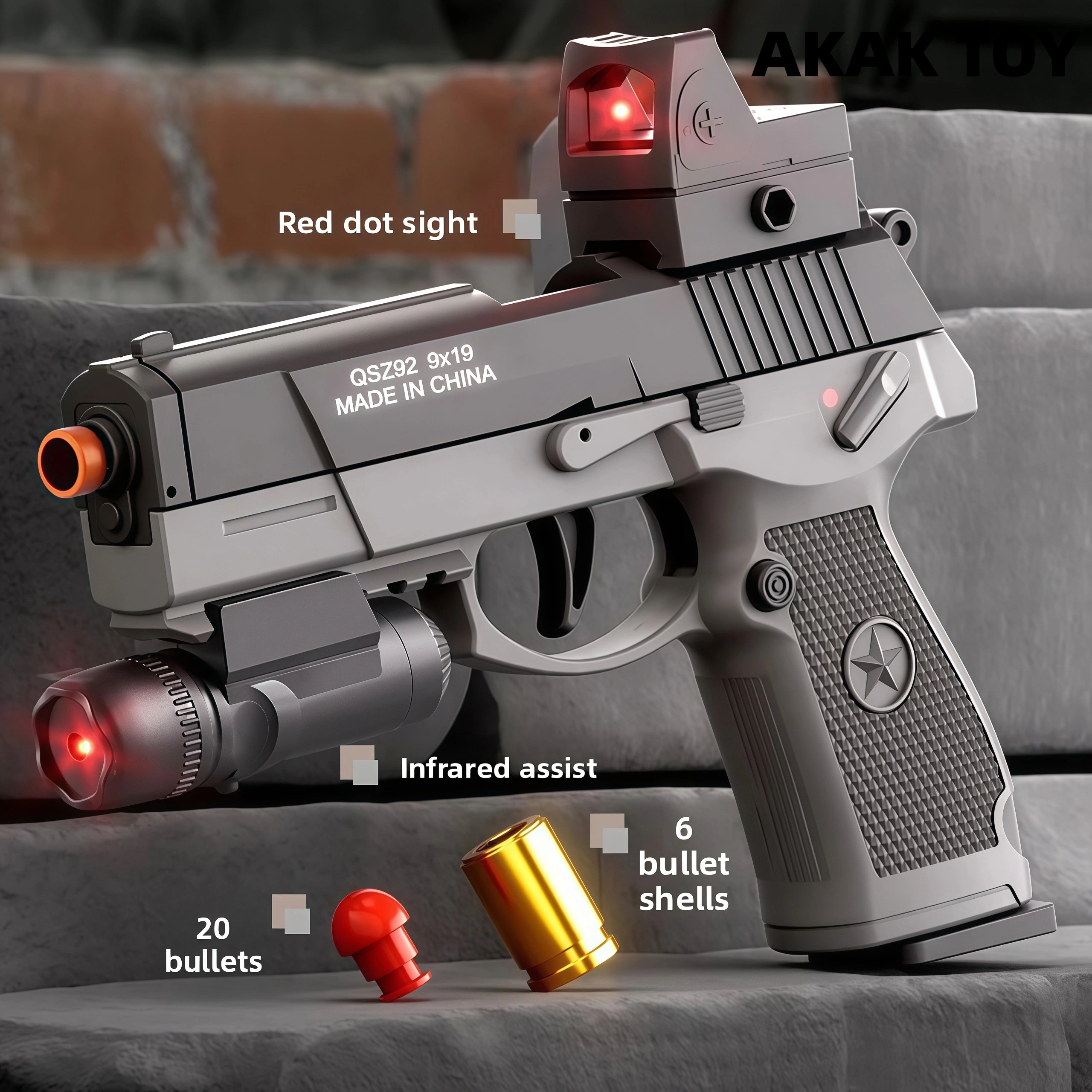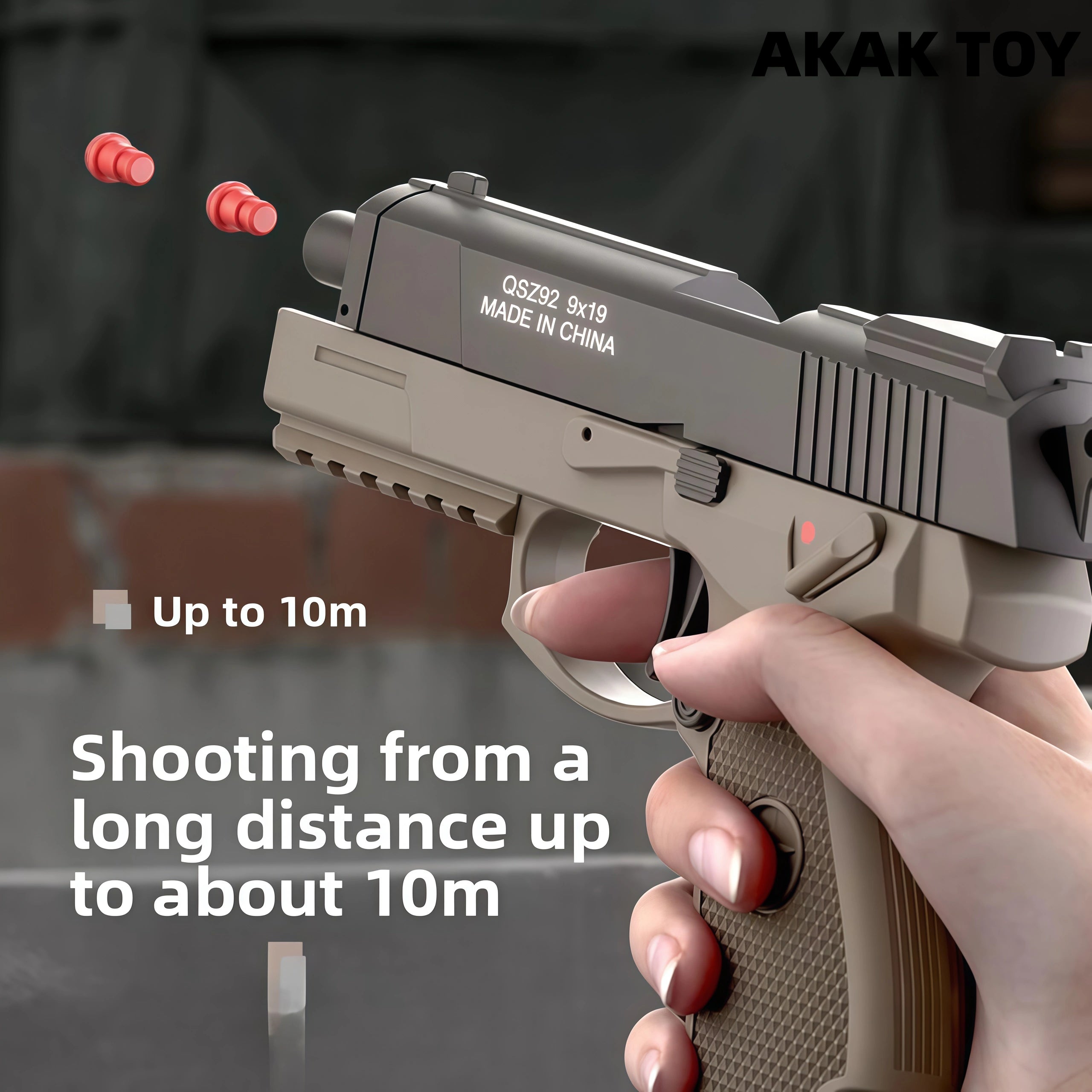 Mechanical burst fire: No need to reload the chamber, just pull the trigger to fire. One-touch ejection: Just pull the trigger to eject. Empty chamber lock: Enters empty chamber lock mode when the magazine is empty. Down-feed clip: Smooth feeding without jamming, holds 6 bullets. Long-range shooting: Up to 15 meters for precise targeting. Equipped with a tactical rail for easy assembly with various accessories. Features:1. Removable accessories, down-feed clip, empty chamber lock2. Shooting mode: Manual3. Range: 10-15 meters4. Dimensions: 19*4*14cm Packing List:1*QSZ92 Dart Gun1* Magazine1* Infrared Sight1* Red Dot Sight6* Shells20* Bullets