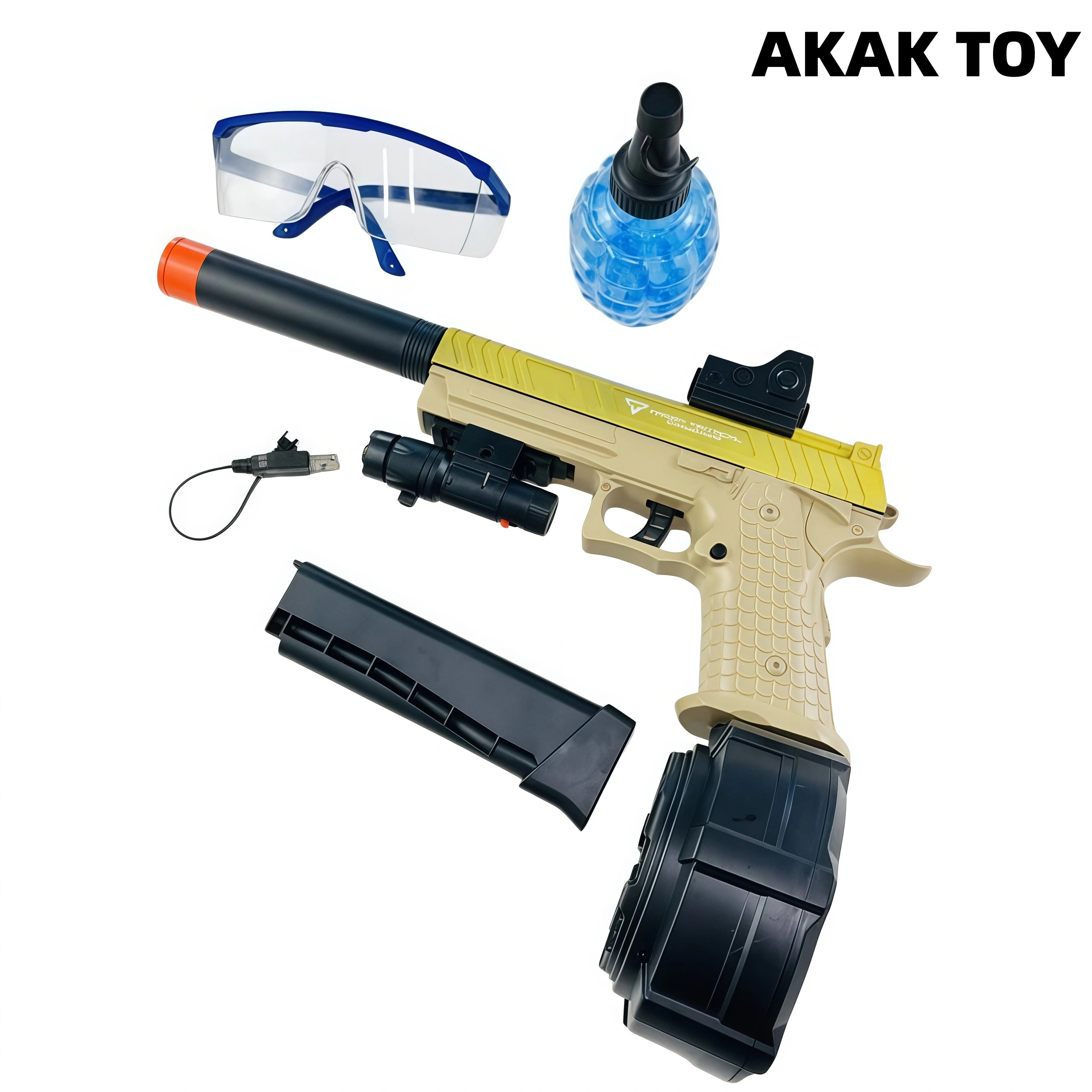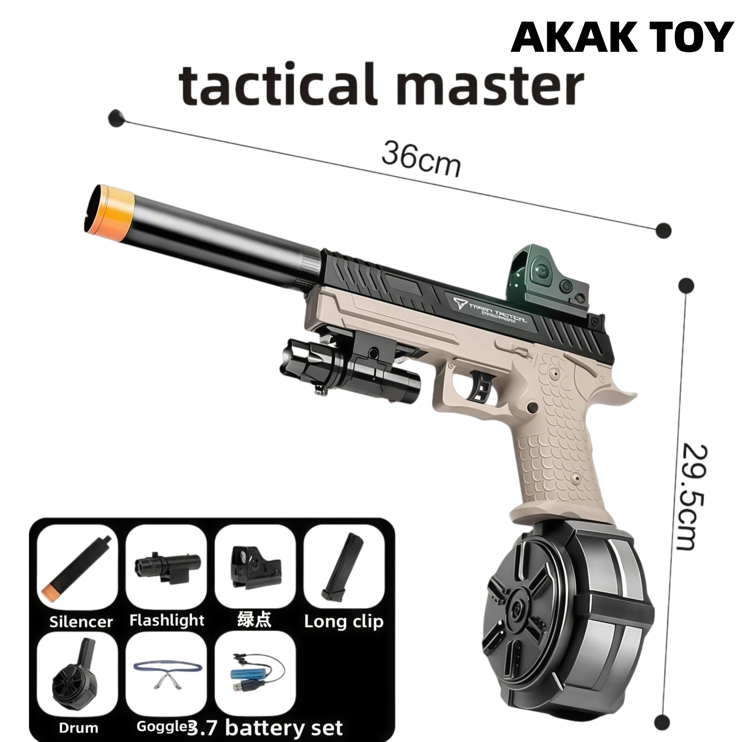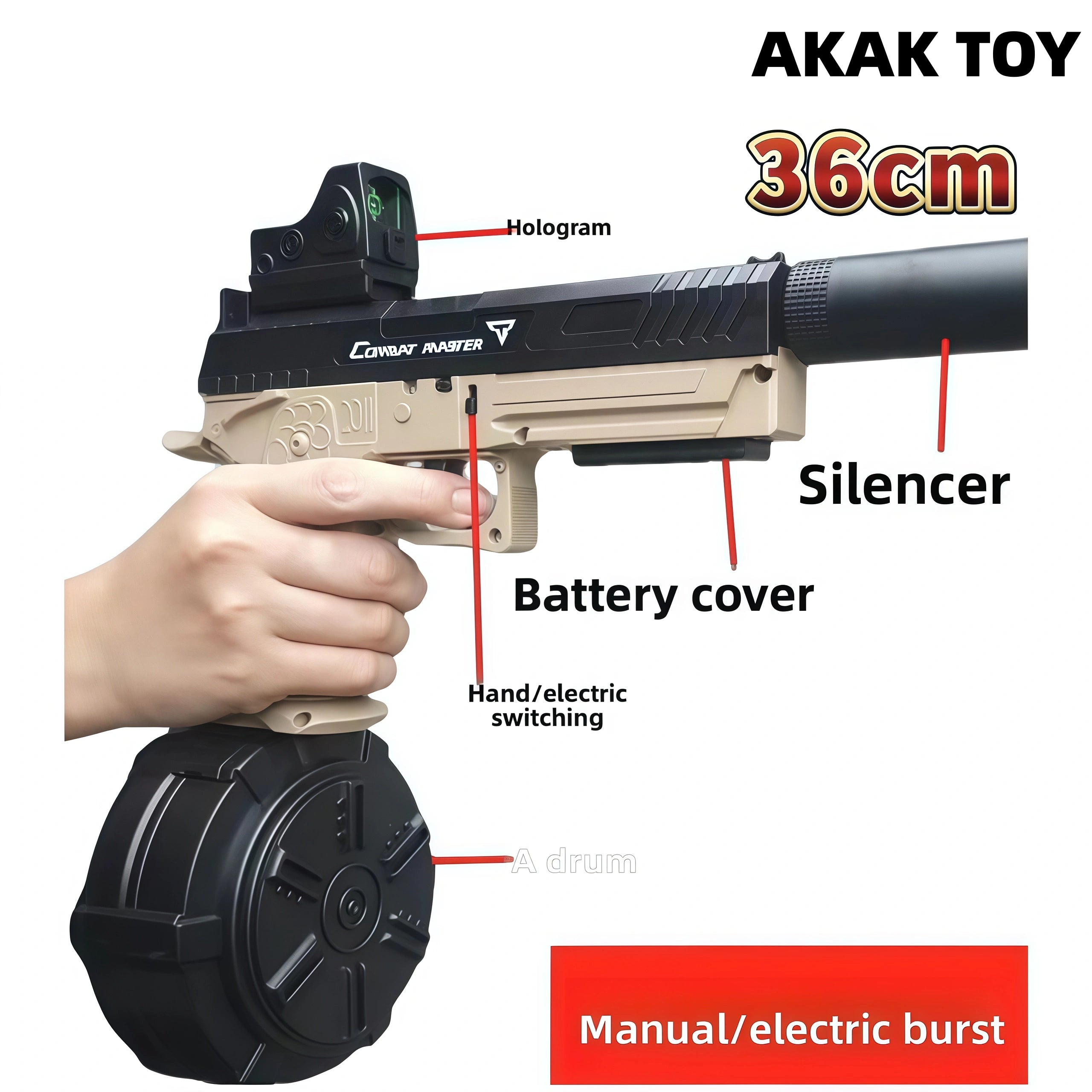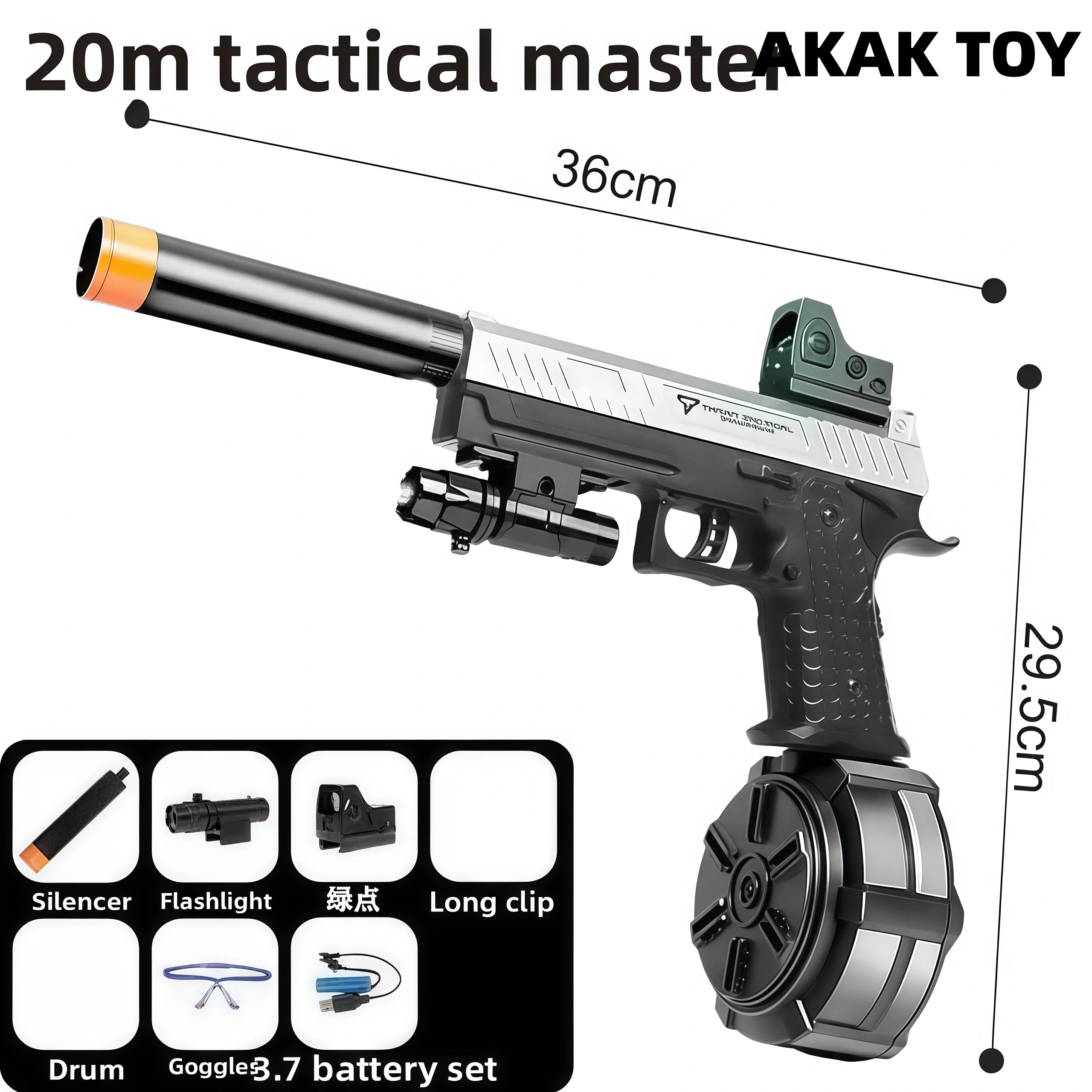 2011 Battle Master gel gun, supports full-auto/manual mode, large-capacity drum magazine brings long-lasting combat fun. Comes with its own battery, effective range 15-20 meters. Features:1. Removable accessories2. Magazine feeding3. Shooting range: 15 meters+4. FPS: 100+5. Shooting mode: manual/full-automatic6. Size: 36 cm7.Battery: 7.4v lithium battery Packing list:1*2011 gel blaster1*silencer1*flashlight1*green dot sight1*long magazine1*drum magazine1*goggles1*rechargeable battery1*gel ball (10000 pcs)1*USB charging cable
