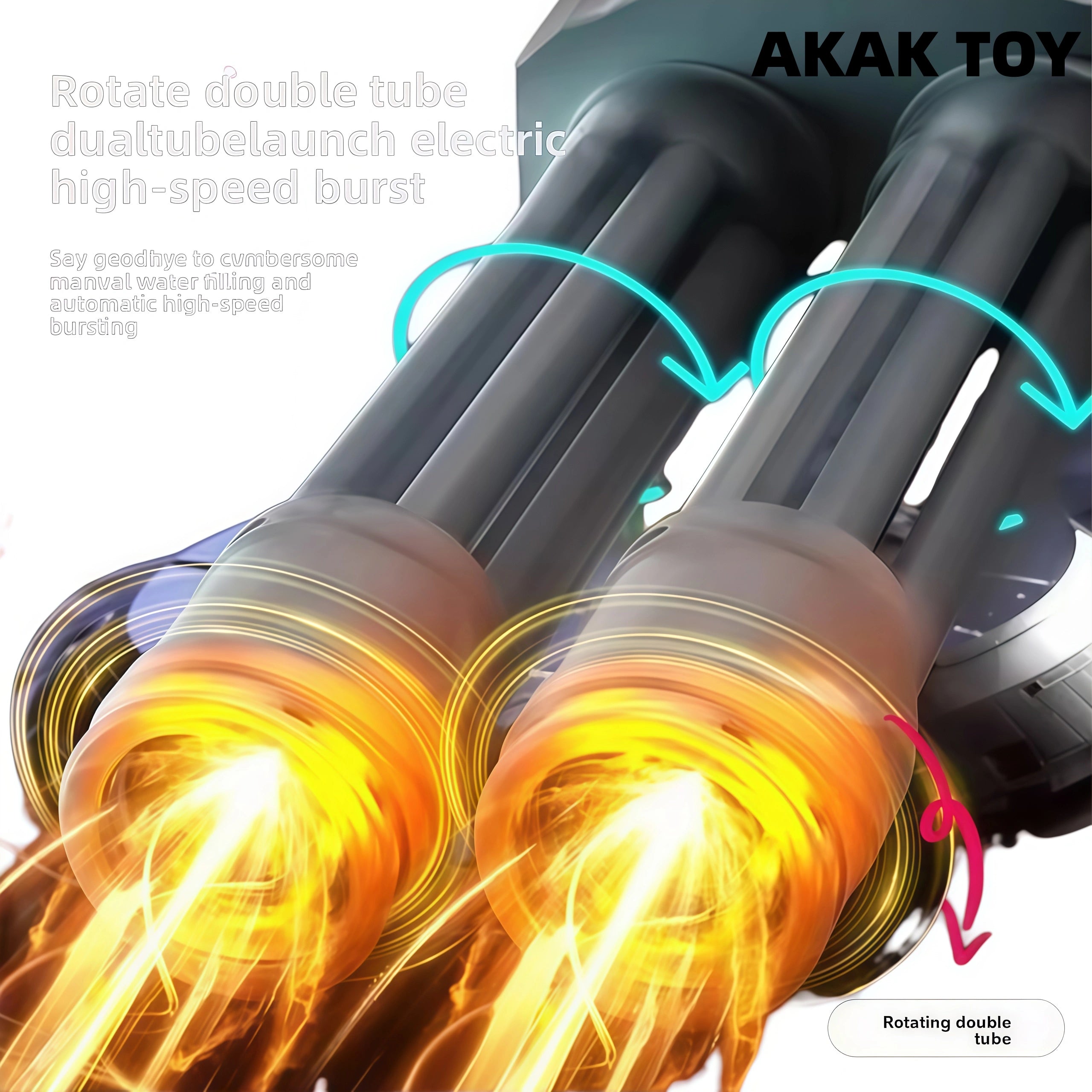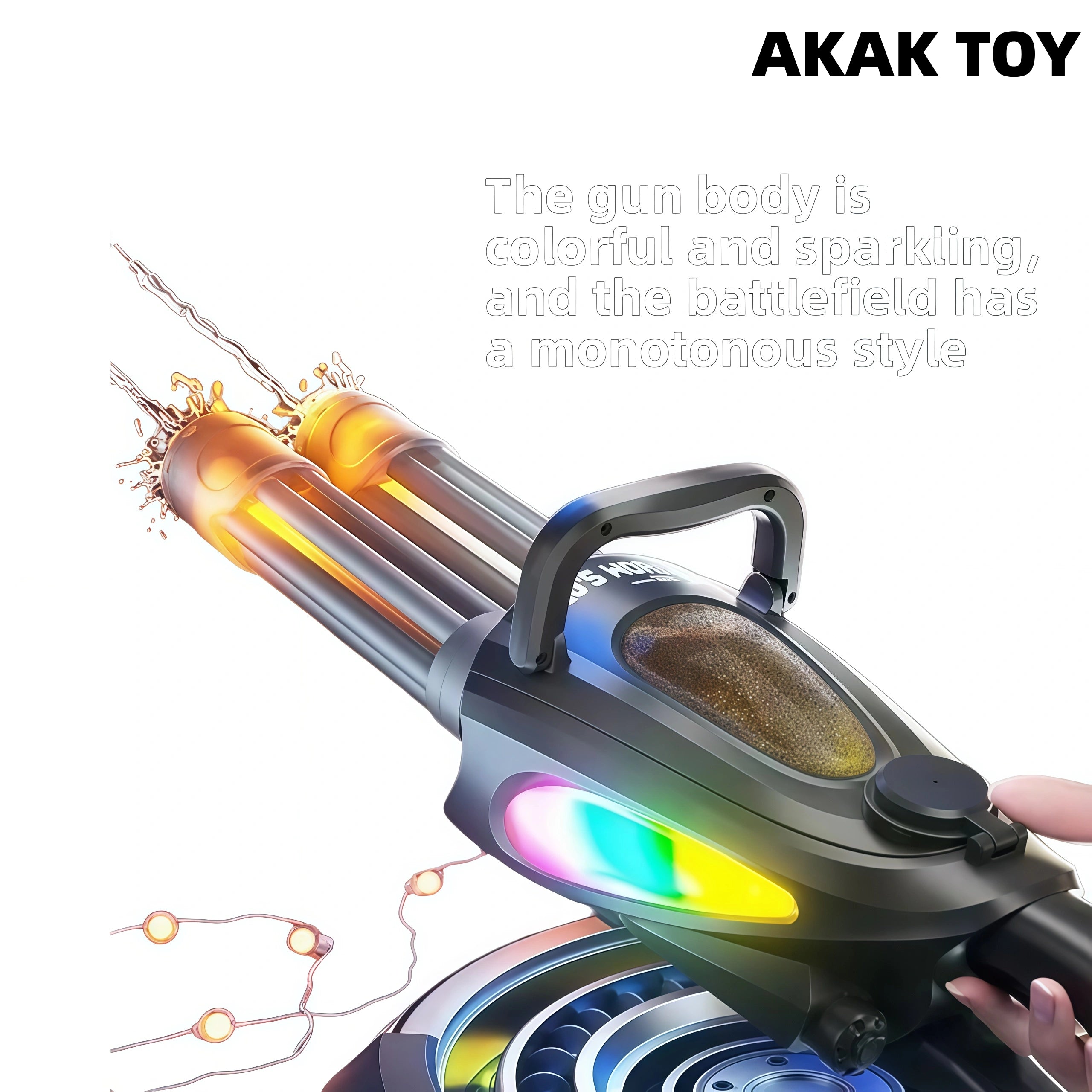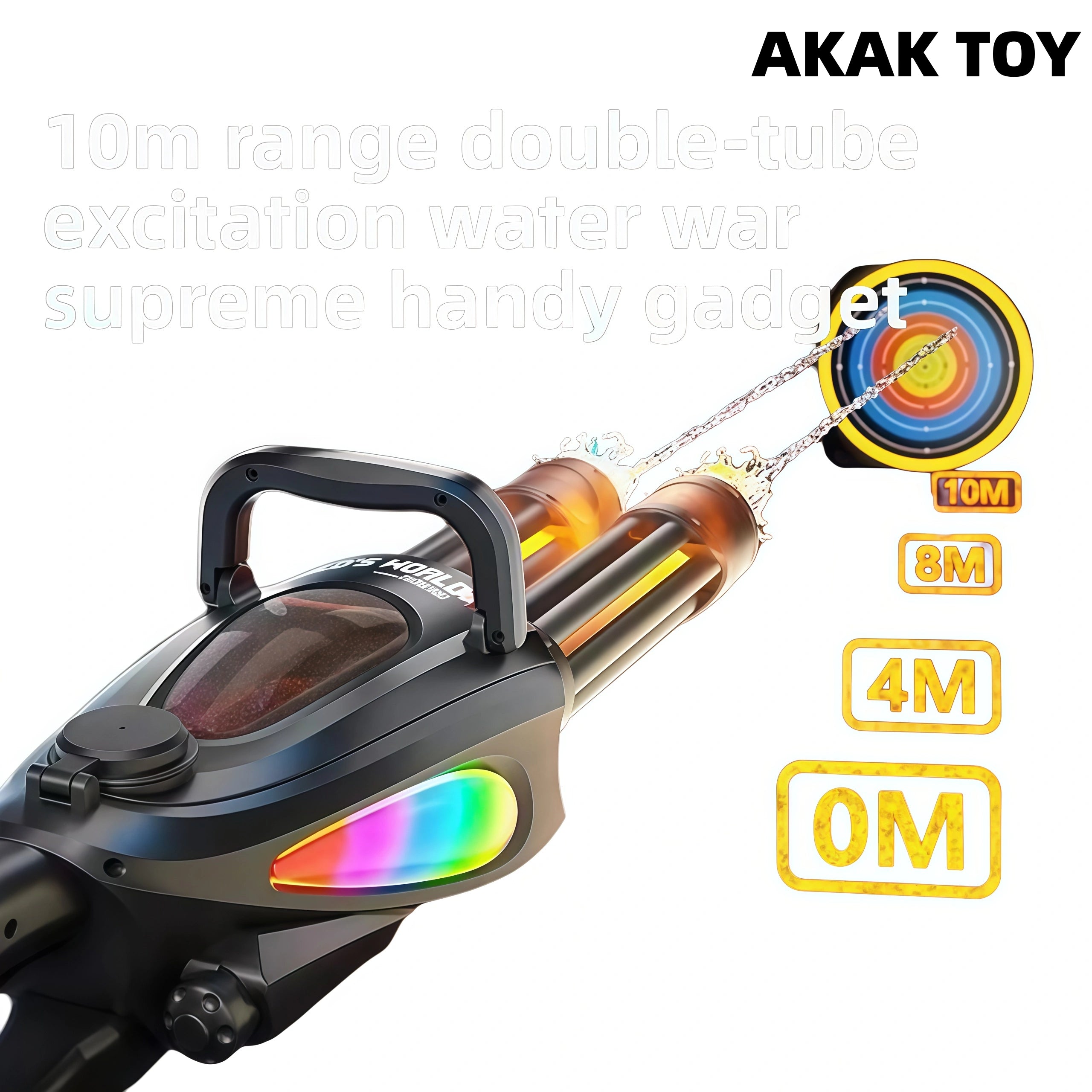 The new double-barreled Gatling electric water gun has the functions of automatic high-speed continuous firing, double-barreled firing, and cool flashing lights when spraying. Built-in large-capacity water storage device and powerful motor, support long-term endurance, worry-free play. Press to shoot, easy to operate, it is a must-have cool play weapon for children and "big kids" in water battles! Rotating double barrel, electric high burst, ballistic launch out of water, muzzle induction emits colorful flash, gun body colorful light blessing, rechargeable modular battery, long-lasting battery life, plug and play, strong battery life. Features:1. Can be connected to an external water bottle to increase the capacity of the water tank2. Long-range shooting3. Long-term endurance4. Flashing light head5. Material: ABS plastic6. Shooting mode: electric7. Shooting range: 15 -20 meters8. Size: 57*15*14CM Packing list:1*Gatling water gun1*Modular battery1*Dual-barreled launch head1*Handle2*Charging cable