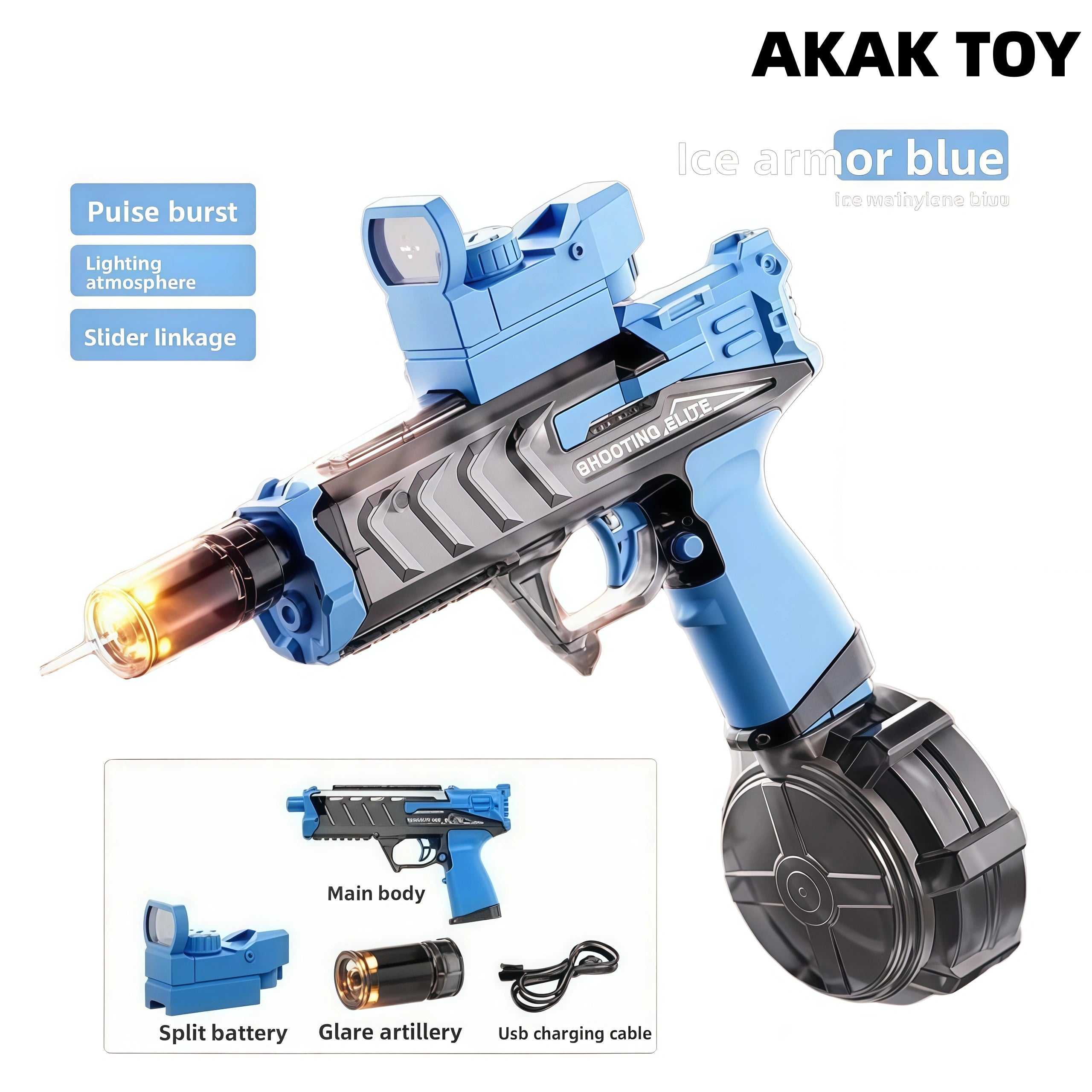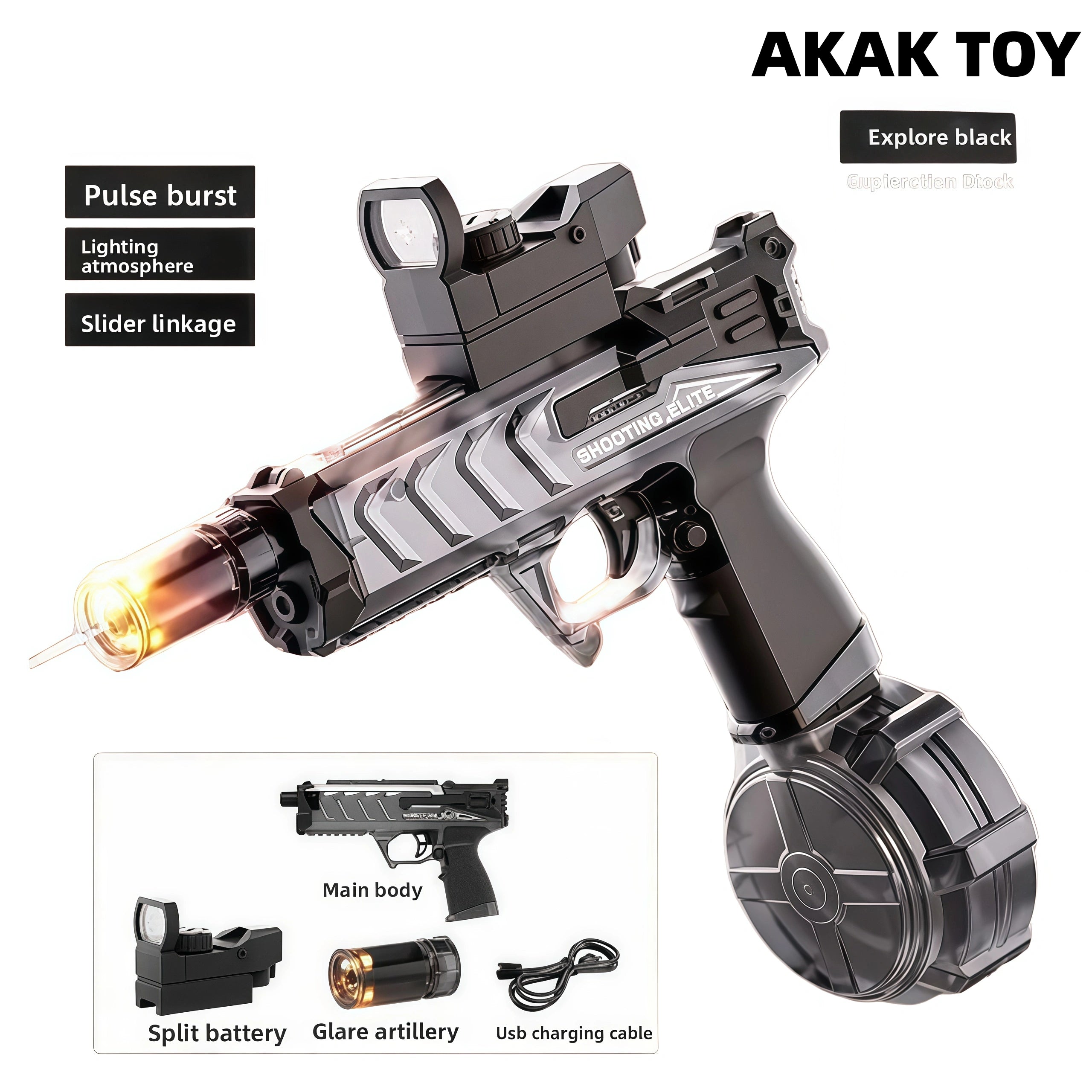 This explosive electric water gun not only has a large-capacity water storage drum, but also has a long-lasting shooting without frequent water refilling. Whether you are outdoors or in the yard, you can have fun playing with it. Come and buy this water gun! Features:1. High-speed pulse burst, continuous reload, long range, lighting atmosphere, slider linkage, long battery life2. Battery: 1200 mAh lithium battery3. Material: ABS plastic4. Range: 12-15 meters5. Shooting mode: electric mode6. Water tank capacity: 350 ml Packing list:1. Size: 31*12*34cm2.1*Rechargeable battery3.1*USB charging cable4.1*Split battery5.1*Drum6.1*Colorful artillery