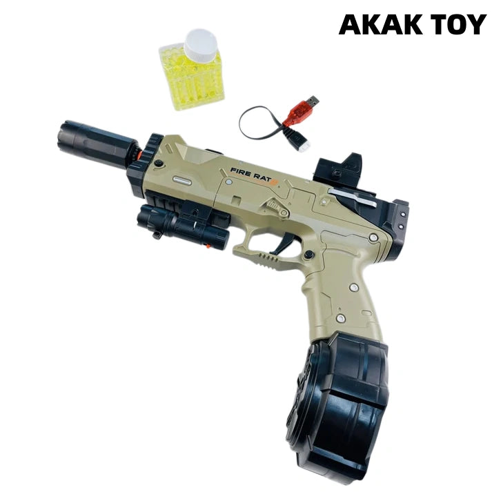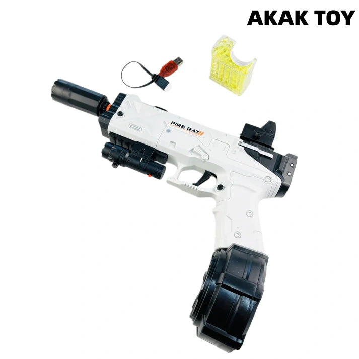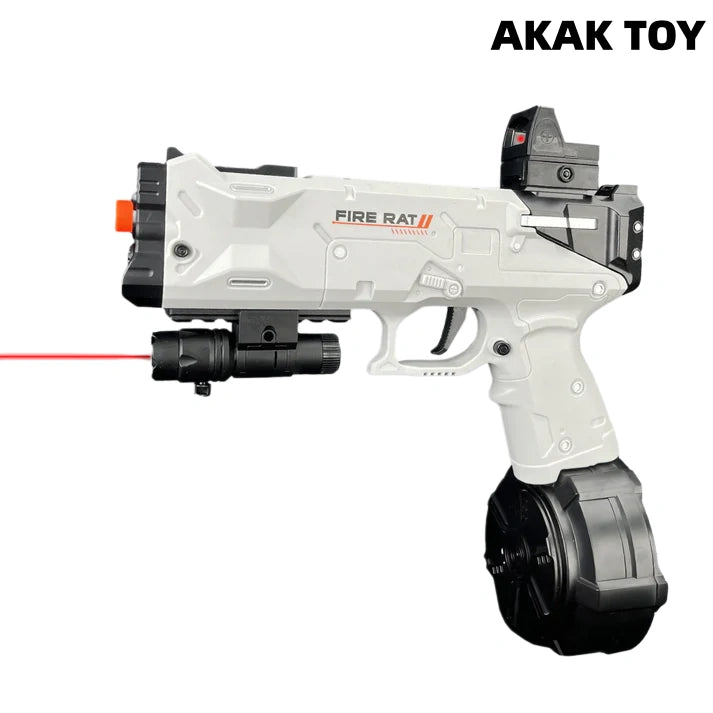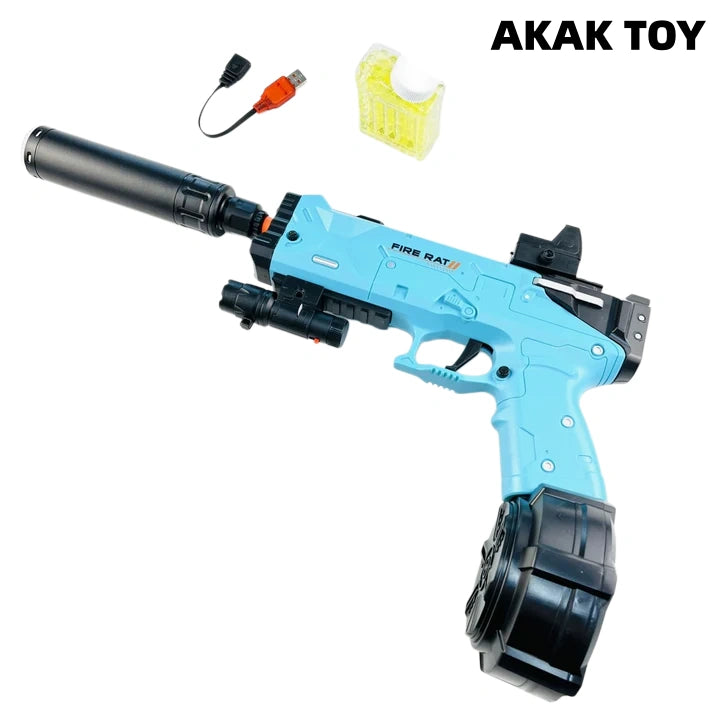 Our electric magazine-fed Fire Rat Gel Blaster offers both manual and fully automatic firing modes. Its long range and high velocity provide hours of excitement and fun. It is lightweight and compact, perfect for any combat scenario. Features:1.Manual/Fully Automatic2. Battery: Rechargeable battery3. Range: 15-20m4. Speed: 180 FPS5. Size: 27*5*29cm Packing list:1*Rechargeable battery1*USB charging cable1*Long magazine1*Drum magazine1*Red dot scope1*Laser1*Light fire pig head1*gel ball bag (10000 pcs)