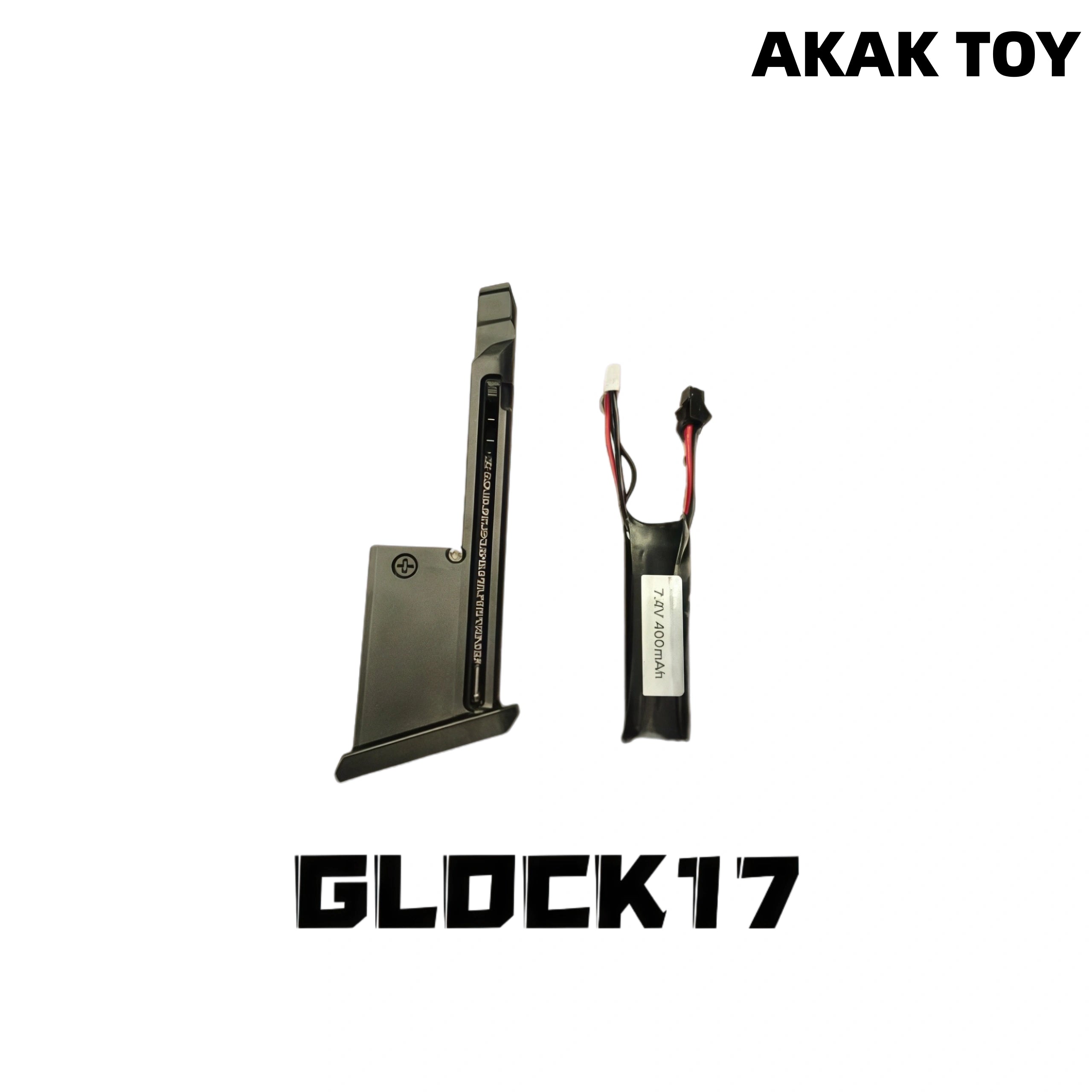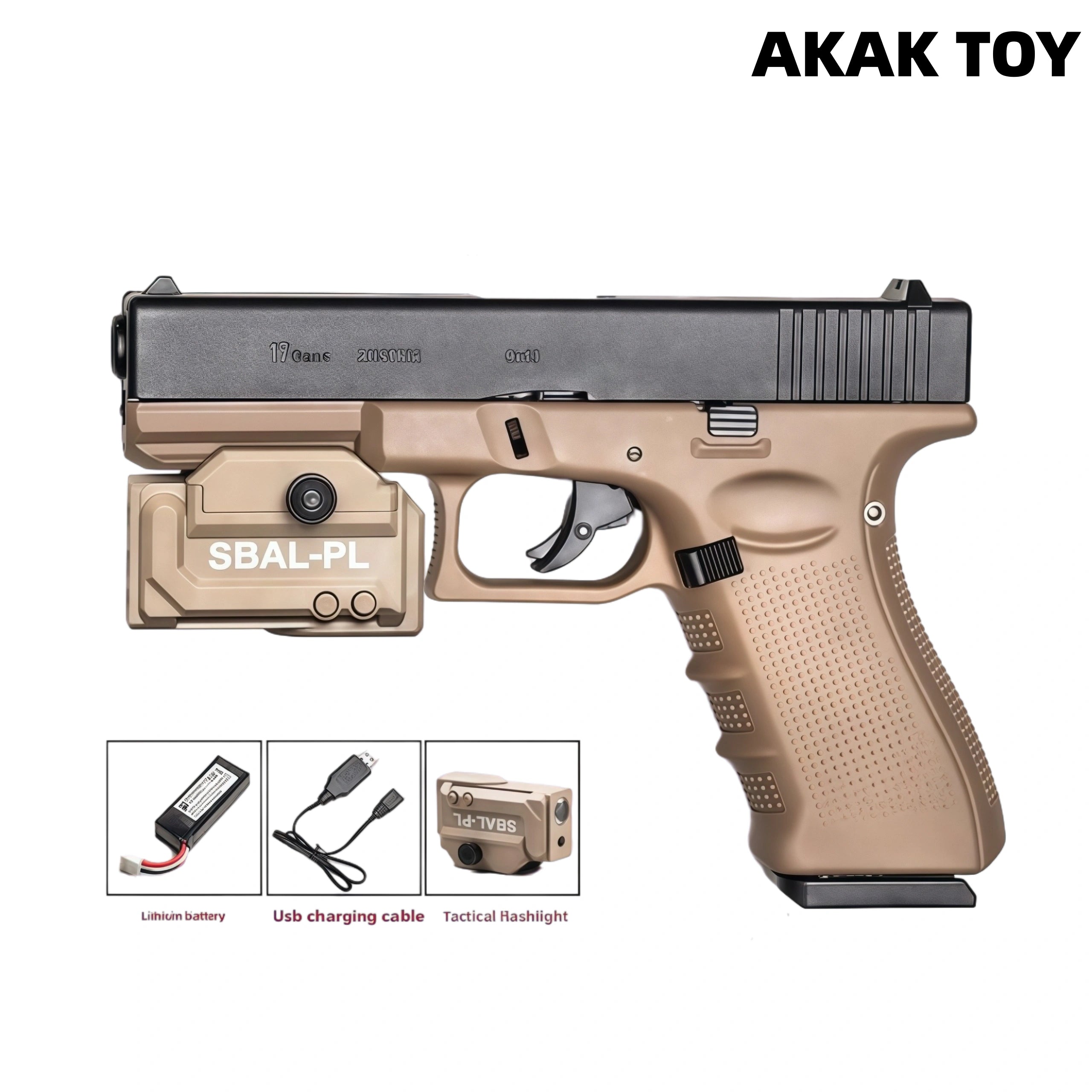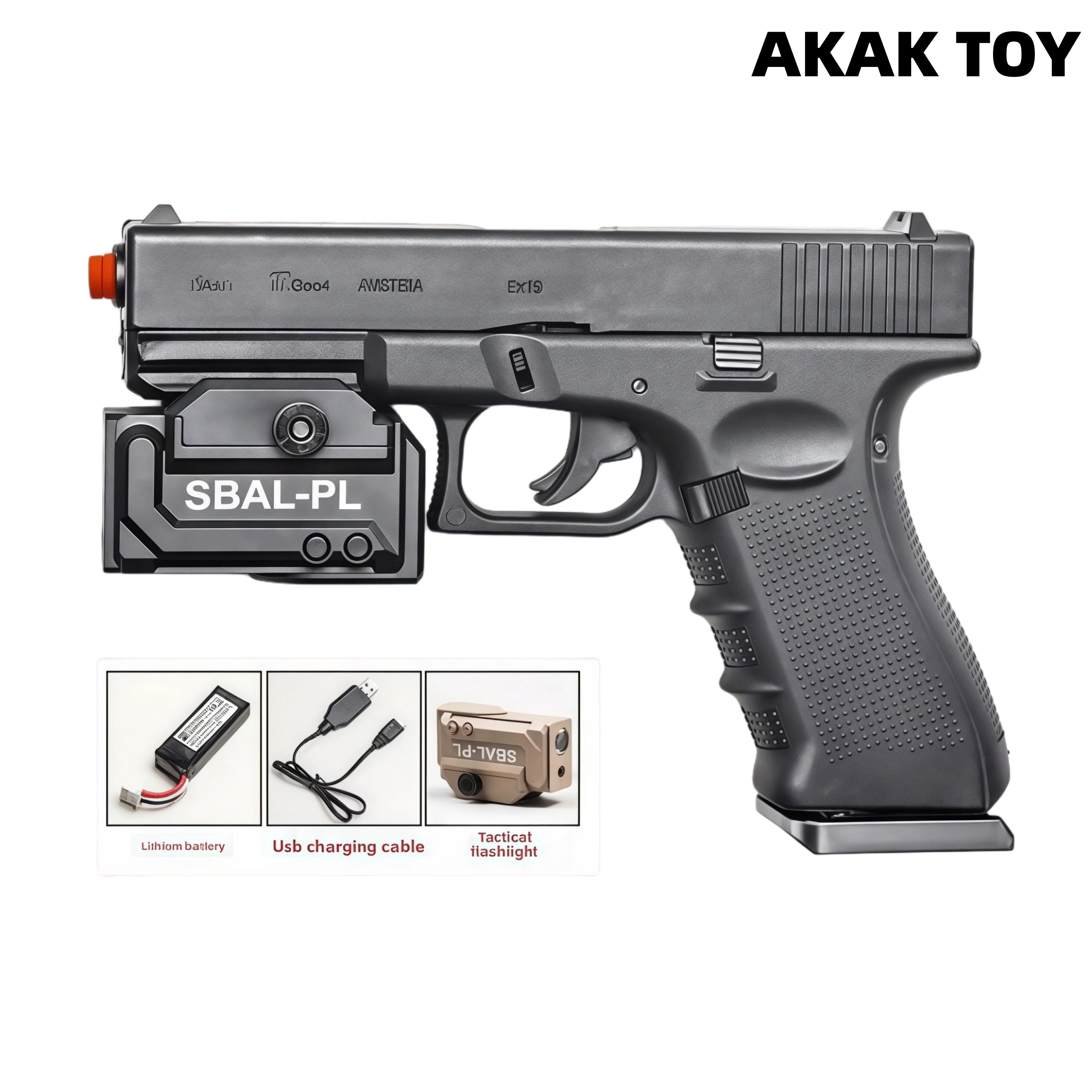 This toy pistol features a sturdy, one-piece nylon frame for a realistic feel and an empty chamber lock function, enhancing the realistic shooting experience. Its internal structure incorporates a metal outer barrel, nylon gears, and nylon ladder teeth, ensuring strength while reducing wear and enhancing overall durability. It features dual-sided quick-release buttons for quick and easy assembly and disassembly, and an integrated magazine and battery compartment for simple and smooth operation. It features a linked recoil action for realistic action, and also supports electric mode for a continuous and stable shooting experience. Features:1. Empty chamber lock, one-touch quick release, linked reload2. Shooting mode: Electric3. Range: 15-25 meters4. Material: Nylon5. Ammunition type: 7-8mm gel pellets6. Dimensions: 19 * 3 * 14 cm Packing List:1 * G17 toy gun1 * magazine1 * tactical flashlight1 * 7.4V lithium battery1 * USB charging cable1 * gel balls (10,000 pieces)