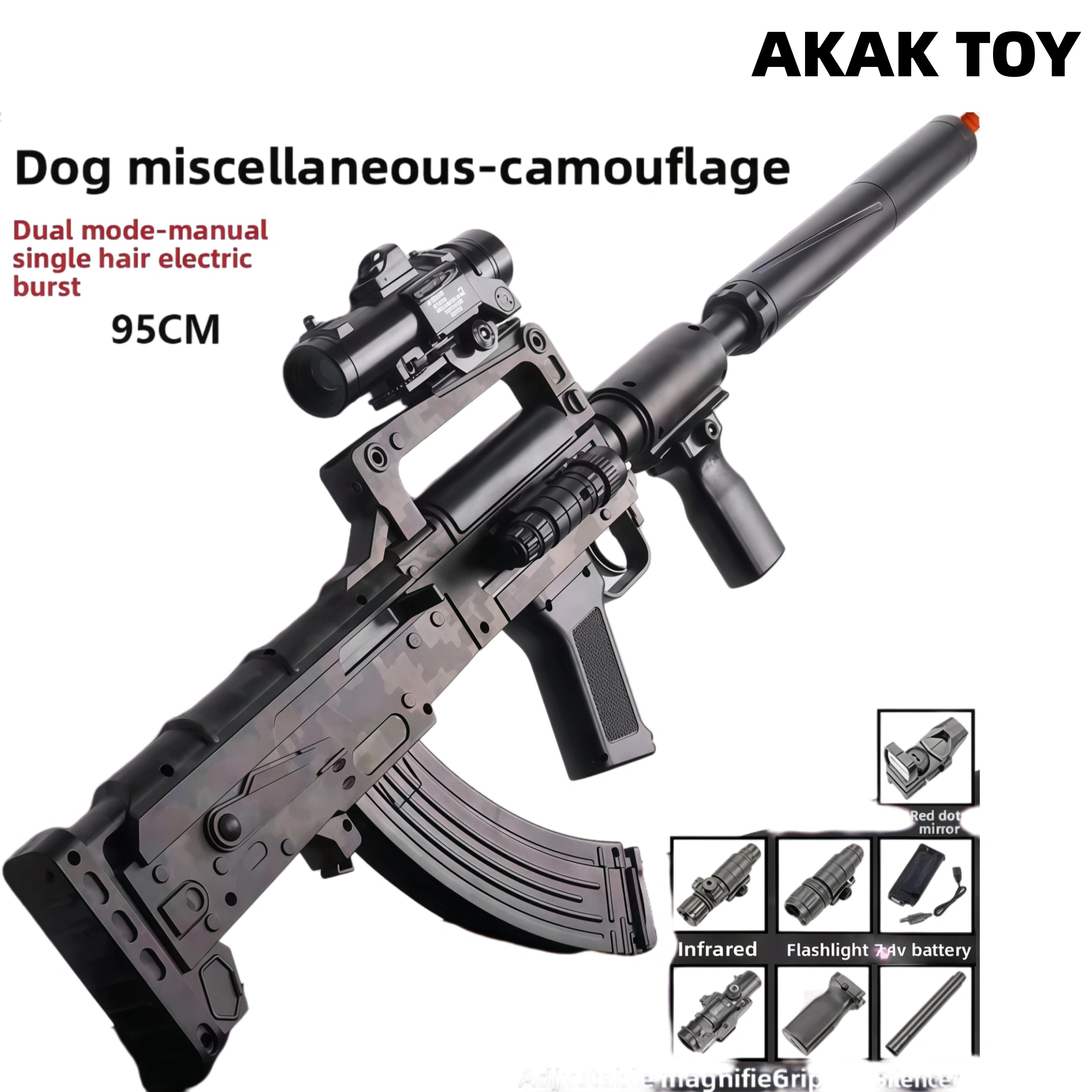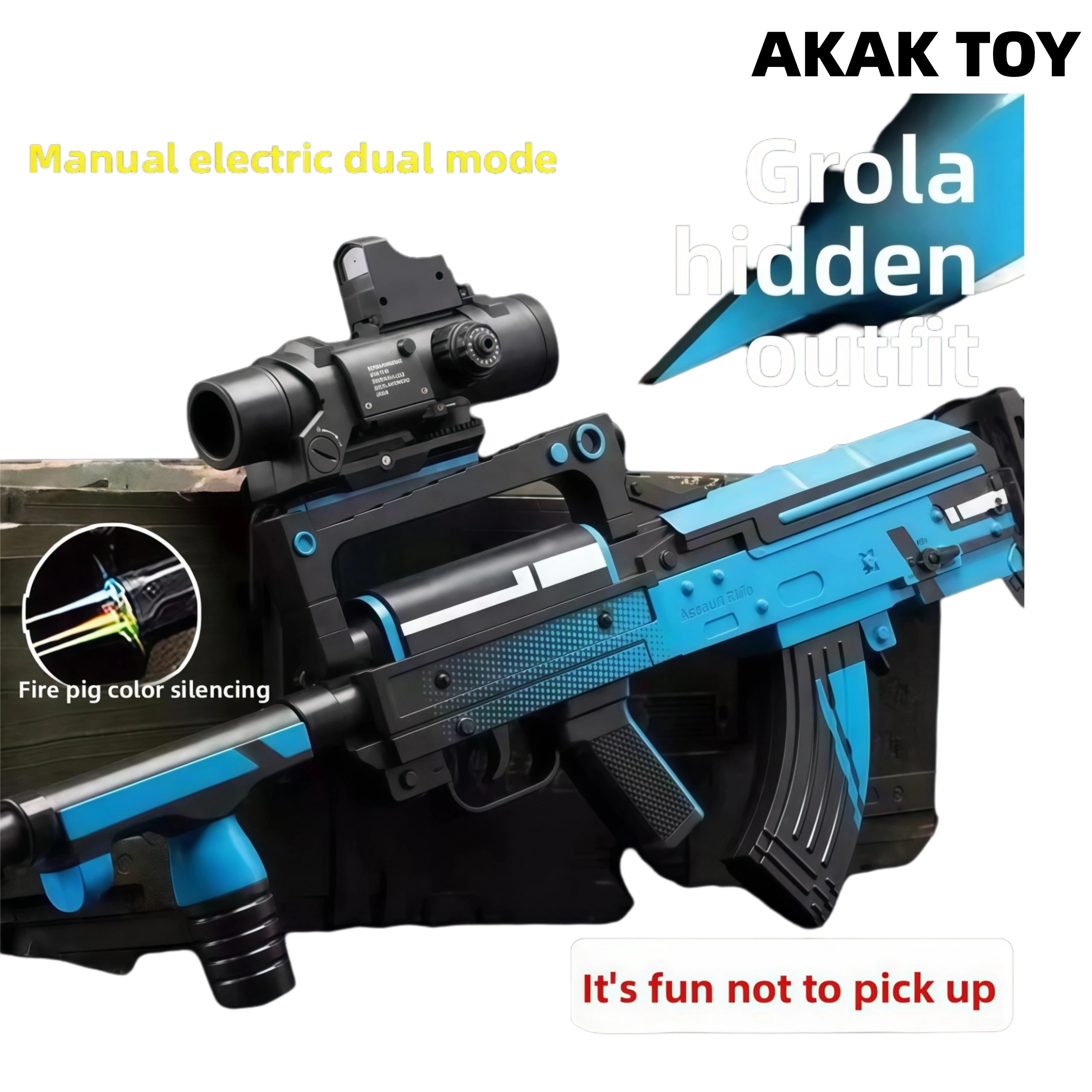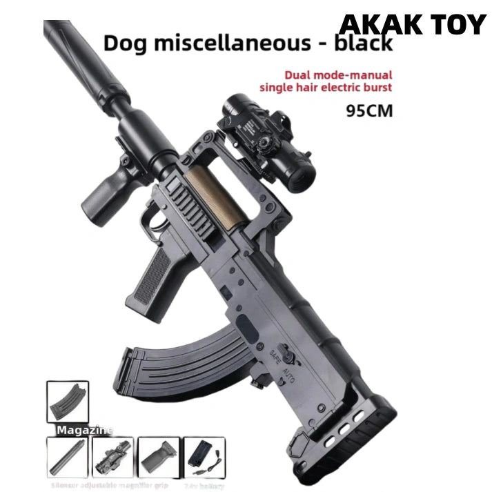 This Groza Gel Blaster supports manual and electric dual-mode shooting, and is equipped with a fire pig color silencer that can spray seven colors, which is full of firepower. The bullpup structure and magazine feeding design make it easy to operate, and the rich tactical accessories make the battle more intense. The powerful power system and comfortable vertical grip allow long-range shooting of more than 20 meters. Features:1. Removable accessories, lower feed clip2. Fire pig color silencer that can spray seven colors3. Material: metal4. Shooting mode: manual/electric5. Battery: 7.4V6. Range: 20-25 meters FPS:250+7. Ammunition type: 7-8mm gel ball8. Size: 80 cm Packing list:1*Groza gel gun1*Red dot mirror1*Infrared1*Flashlight1*Adjustable magnification mirror1*Grip1*Silencer1*Rechargeable battery1*USB charging cable1*Gel ball (10,000 pcs)