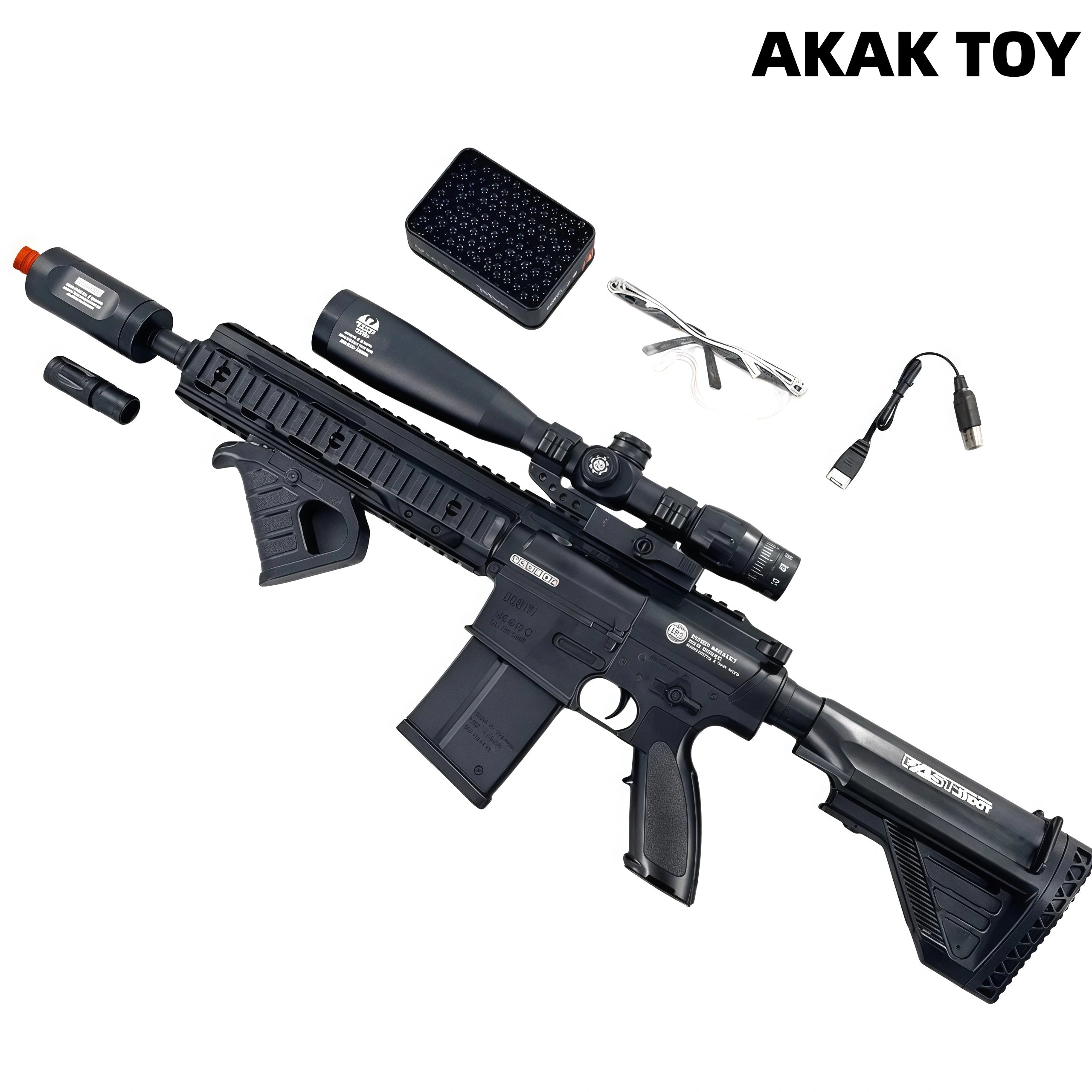 Colorful Illuminating Silencer: Features seven built-in lighting effects that simulate realistic sonic booms, delivering a stunning visual and auditory experience. Simply flick the switch to change lighting colors, igniting your passion for battle. Modular Battery Design: Featuring a modular quick-release structure, it can be quickly removed and replaced with a single click, ensuring worry-free battery life and uninterrupted combat. Dual-Mode Shooting System: Supports single-shot and burst firing modes, easily switching between them to meet diverse combat needs and provide more flexible operation. Features:1. Removable accessories, lower magazine2. Seven-color illuminated silencer, modular battery3. Shooting mode: SIME/Full-Auto4. Range: 25 meters5. FPS: 200+6. Ammunition type: 7-8mm gel balls7. Material: ABS plastic8. Size: 75 cm Packing List:1 * HK-417 gel ball gun1 * Seven-color illuminated silencer1 * Flash hider1 * Grip1 * Magnifying lens1 * Magazine1 * Buttstock1 * Goggles1 * Rechargeable battery1 * USB charging cable1 * Gel balls (10,000 pieces)