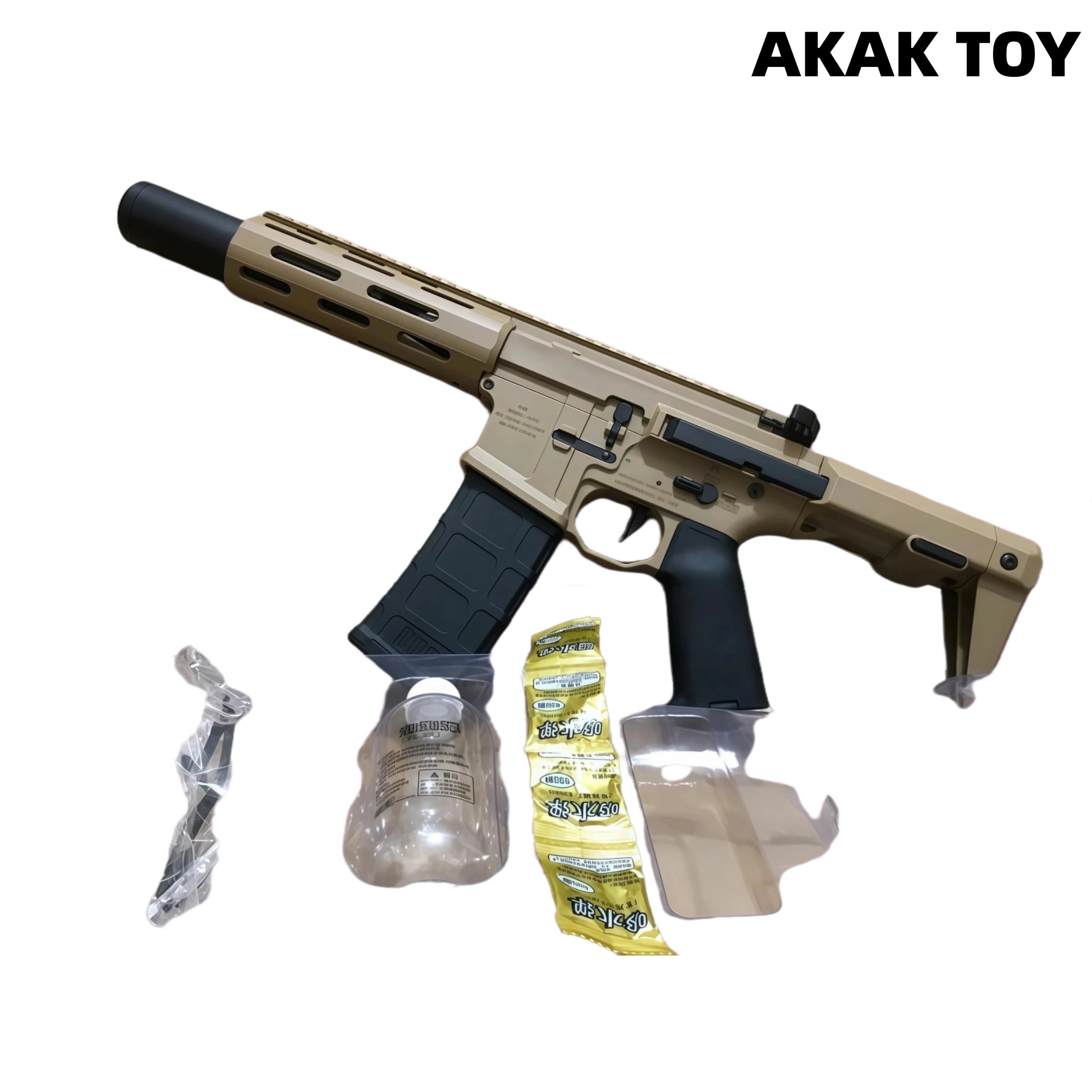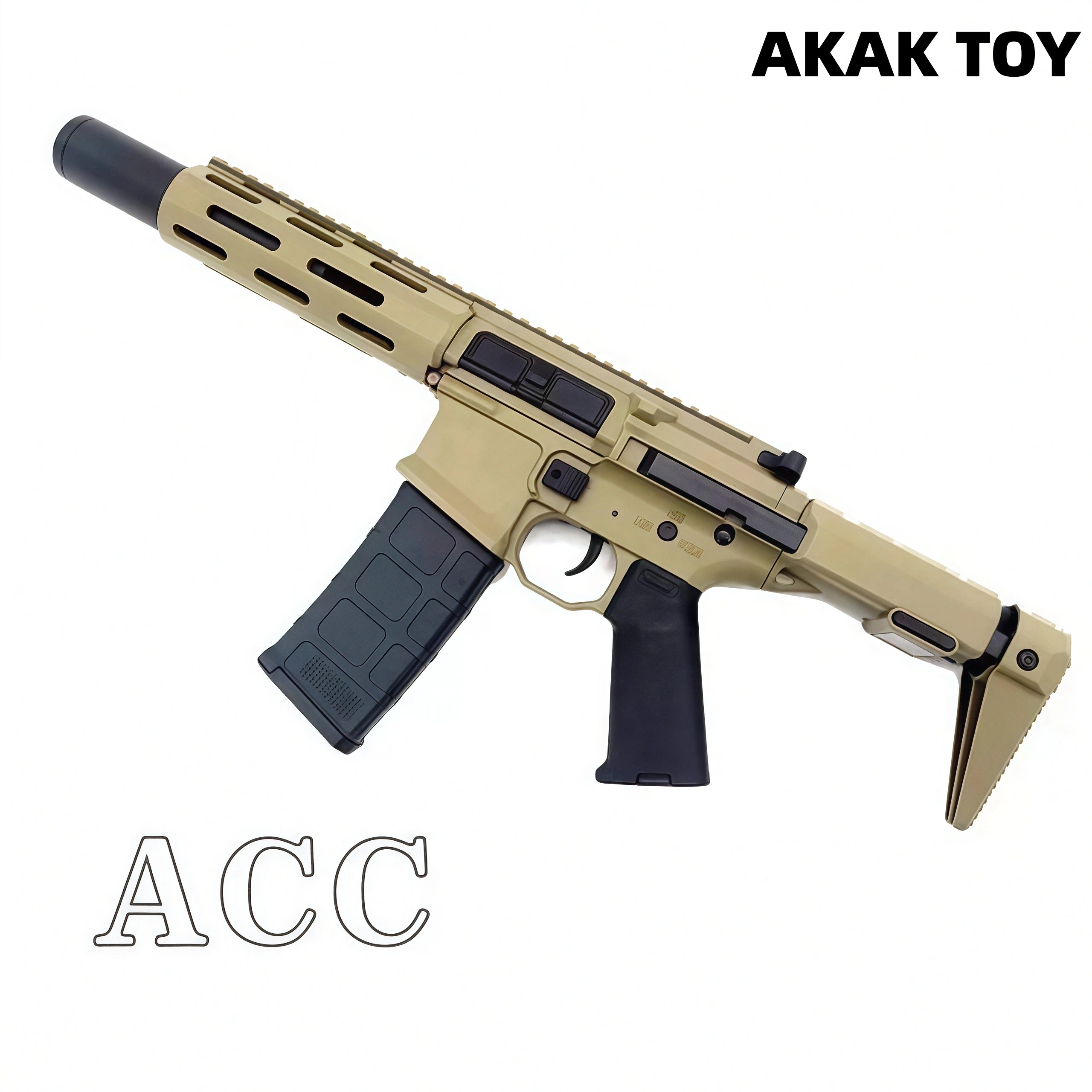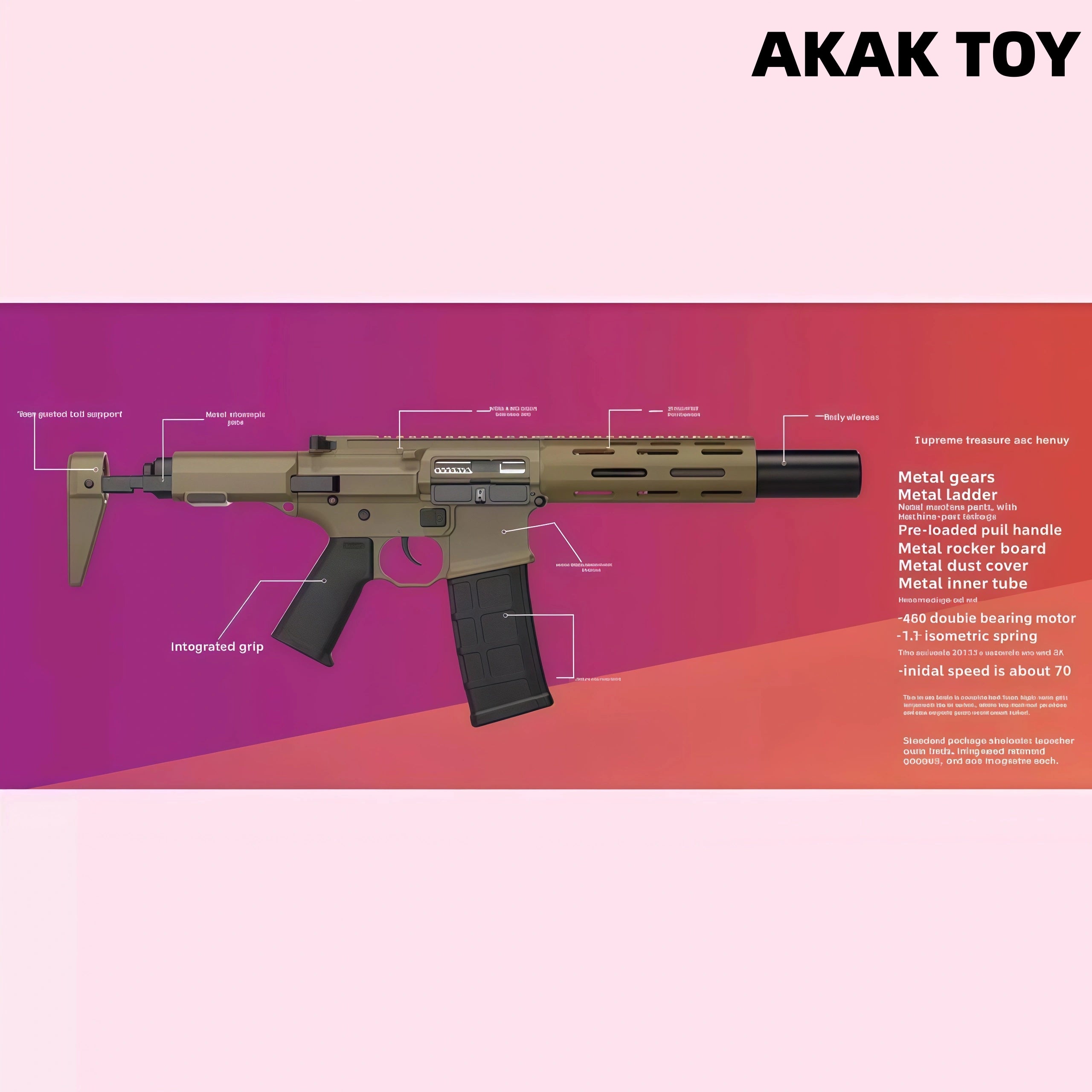 1. Metal components: Metal gears, metal ladder, metal inner and outer tubes, metal rotor plates, metal seesaw, metal dust cover, metal telescopic tailstock. 2. The outer tube body is made of high-strength imported DuPont nylon, and the inner gearbox is made of DuPont PA66 reinforced nylon. 3.Also equipped with a 480 dual-bearing motor and simulated recoil function. Features:1. Bottom-feed magazine, detachable accessories2. Linked chambering, pre-feeding3. Firing modes: Semi-automatic/Full-automatic4. Range: 20-25 meters5. Spring type: 1.2mm6. Firepower: 230-240 FPS7. Metal gear ratio: 18:18. Ammunition type: 7-8mm gel balls9. Material: Nylon + Metal10. Dimensions: 78*24 cm Packing List:1*AAC V2 Gel Blaster1*Magazine1*Goggles1*Water ammunition bottle1*7.4V lithium battery1*USB charging cable1*Gel balls (10,000 pieces)