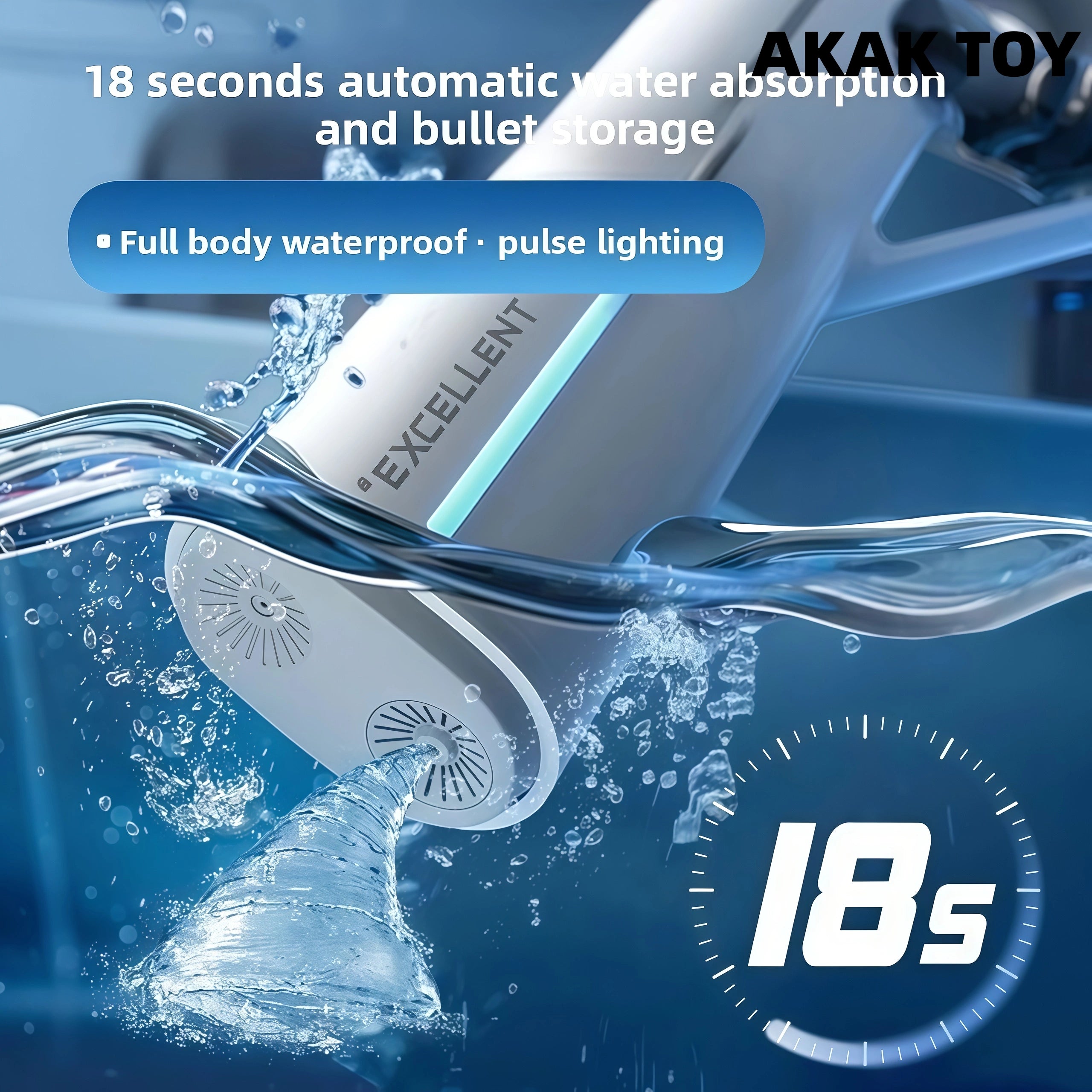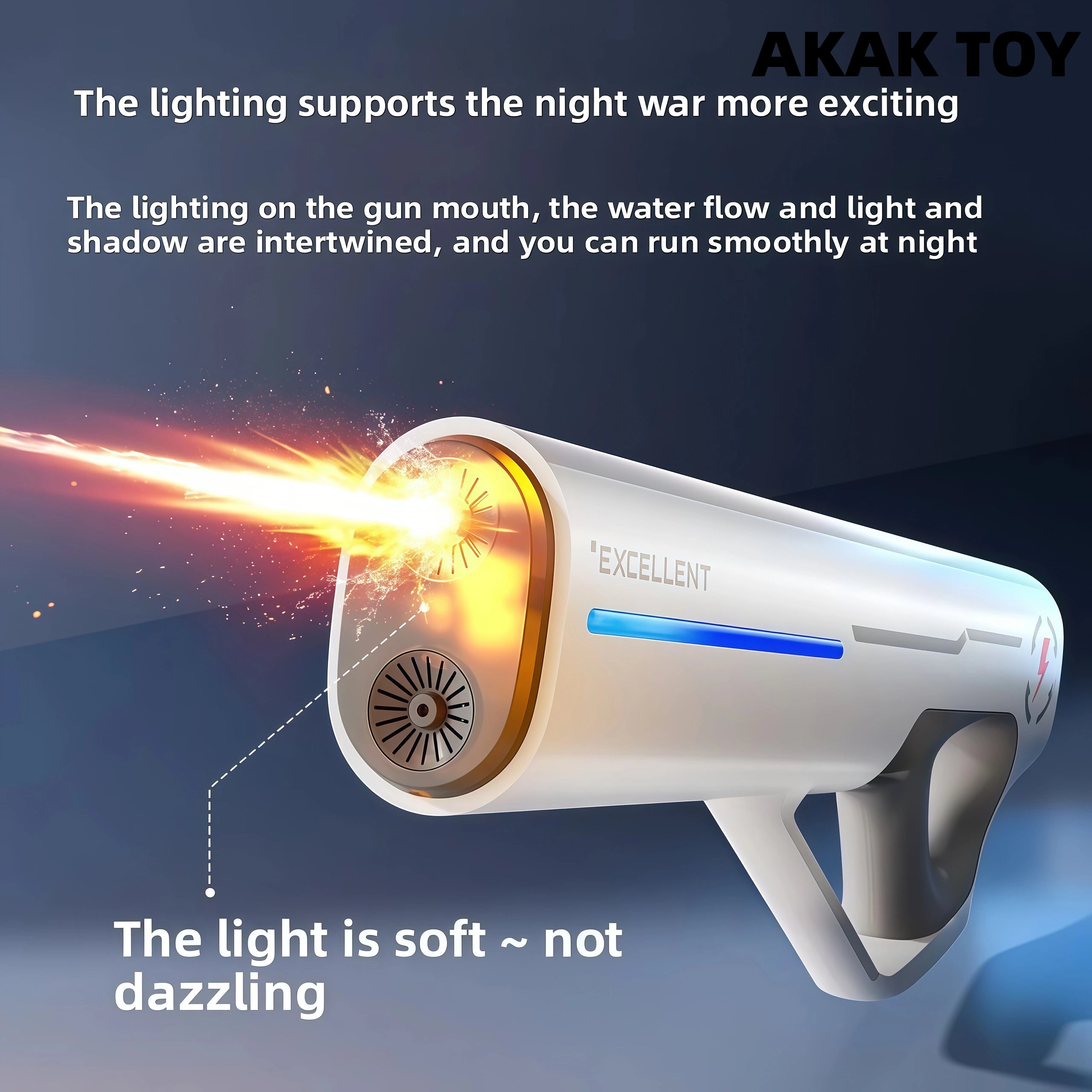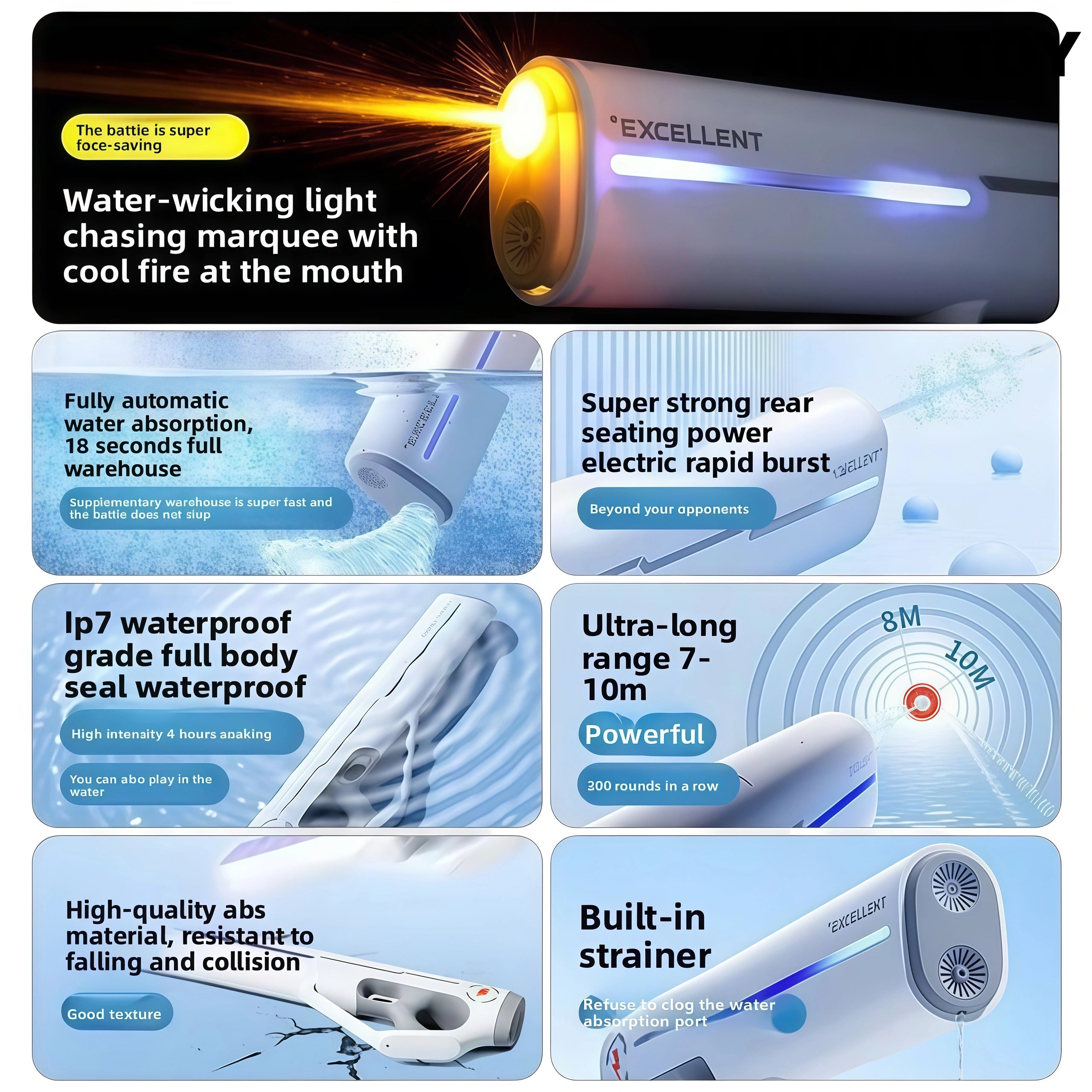 This new upgraded water gun integrates intelligent water absorption, ultra-long range, and cool lighting effects! The built-in automatic water absorption system and the marquee lighting effect make night battles cooler! High-density waterproof design + built-in filter, even if it is submerged in water for 4 hours, it can still operate stably, truly waterproof and durable. Made of high-quality ABS material, it is safe, firm and resistant to falling, suitable for various intense scenes. Strong power support for a battery life of up to 120 minutes, a single charging range of up to 15 meters, easily crushing ordinary water guns, and becoming your best choice for summer water battles! Features:1. Pulse electric dual mode fully automatic water absorption, full water absorption in 18 seconds2. Super strong recoil, electric rapid burst3. Ultra-long range, built-in filter4. Fully waterproof, iP7 waterproof level5. Muzzle light, you can fight happily at night6. Modular battery, one-button disassembly7. Material: ABS plastic, resistant to falling and collision.6. Range: 15 meters +7. Size: 50*17*5 cm Packing list:1*Automatic water gun1*Goggles1*Modular battery1*USB charging cable