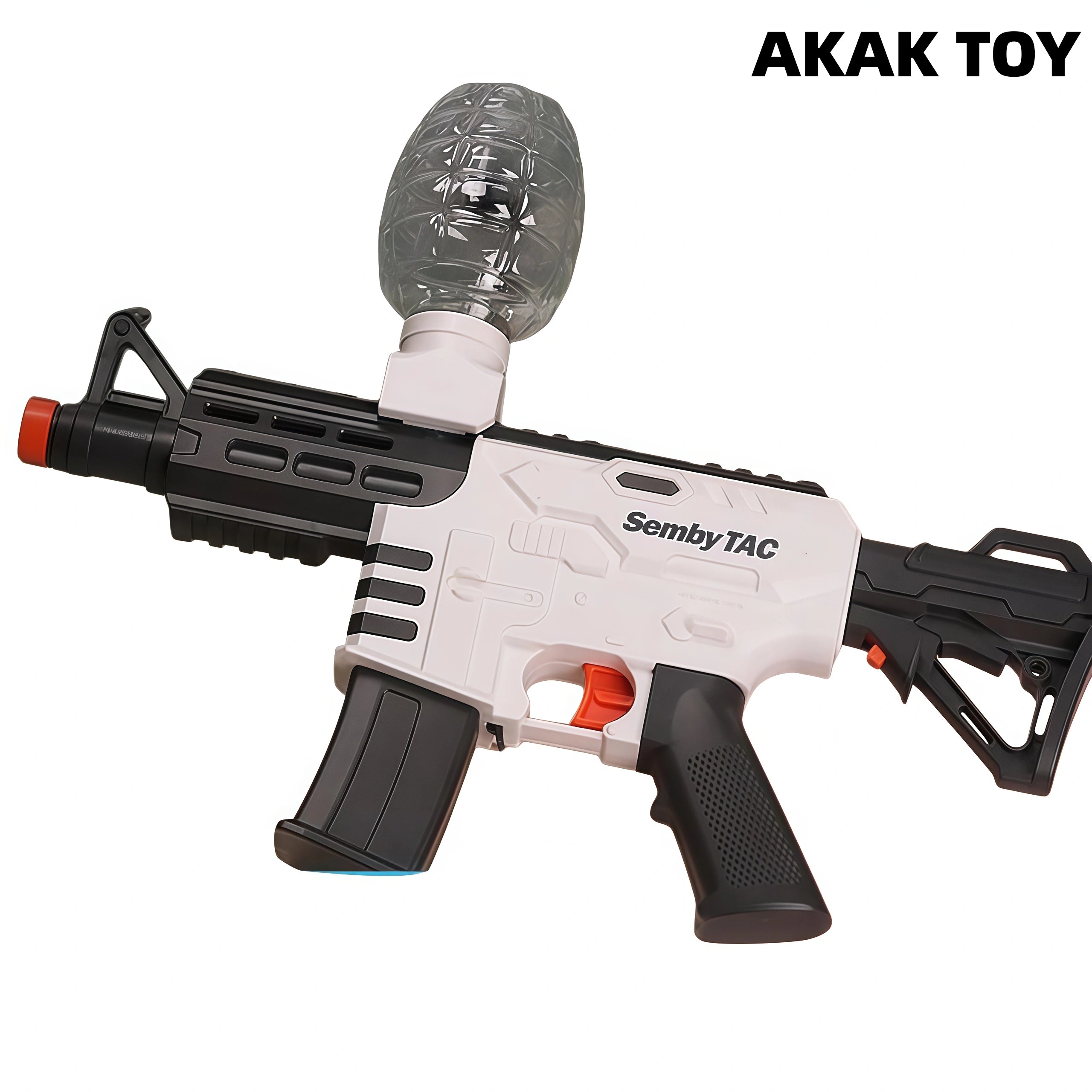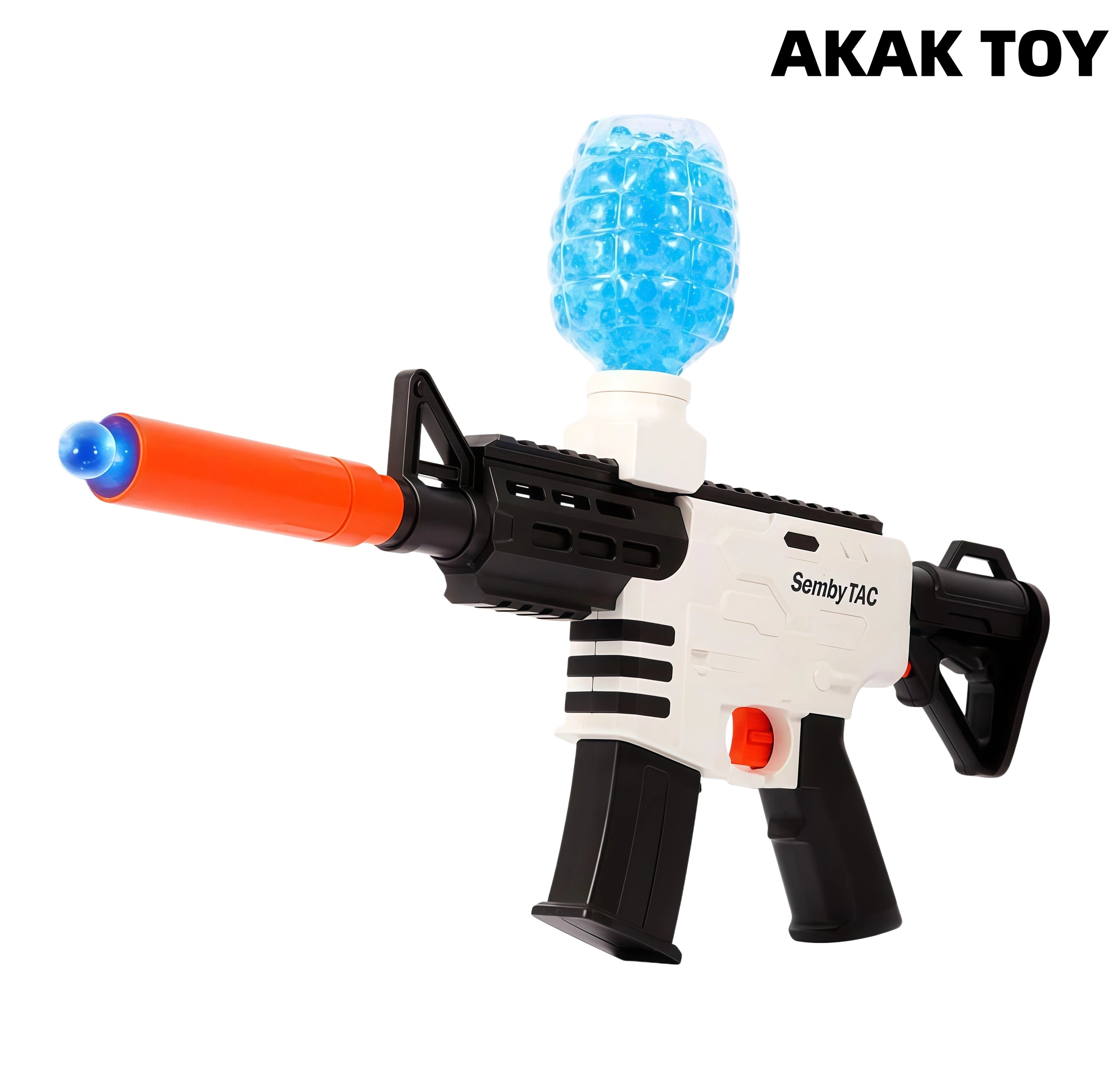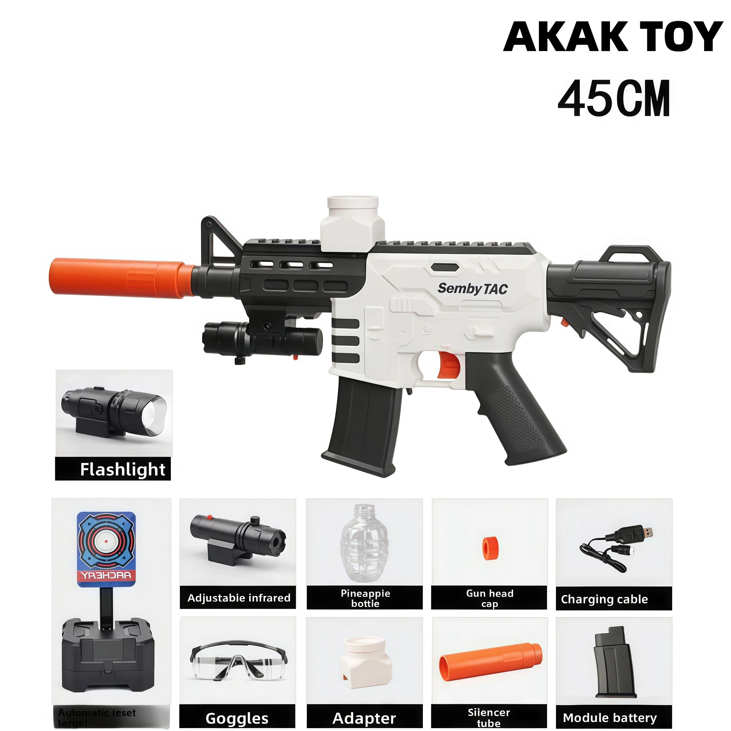 -This M4 machine gun is a compact machine gun designed for children. It comes with a large number of Orbeez magazines, which are placed in a grenade-shaped container. -Due to its suitable size, this machine gun is very suitable as a gift for children. It is comfortable and convenient for children to play with. -The machine gun has a firepower of up to 240FPS, so the long range can reach about 20 meters. Features:1. High-speed burst2. Shooting mode: fully automatic3. Shooting range: 20m4. Firepower: up to 240FPS5. Ammunition type: 7-8mm gel ball6. Material: ABS plastic7. Size: 45cm Packing list:1*M4 gel gun1*Flashlight1*Infrared1*Auto-reset target1*Pineapple bottle1*Gun head cover1*Goggles1*Adapter1*Silencer1*Module battery1*USB charging cable1*Gel ball (10000 pcs)