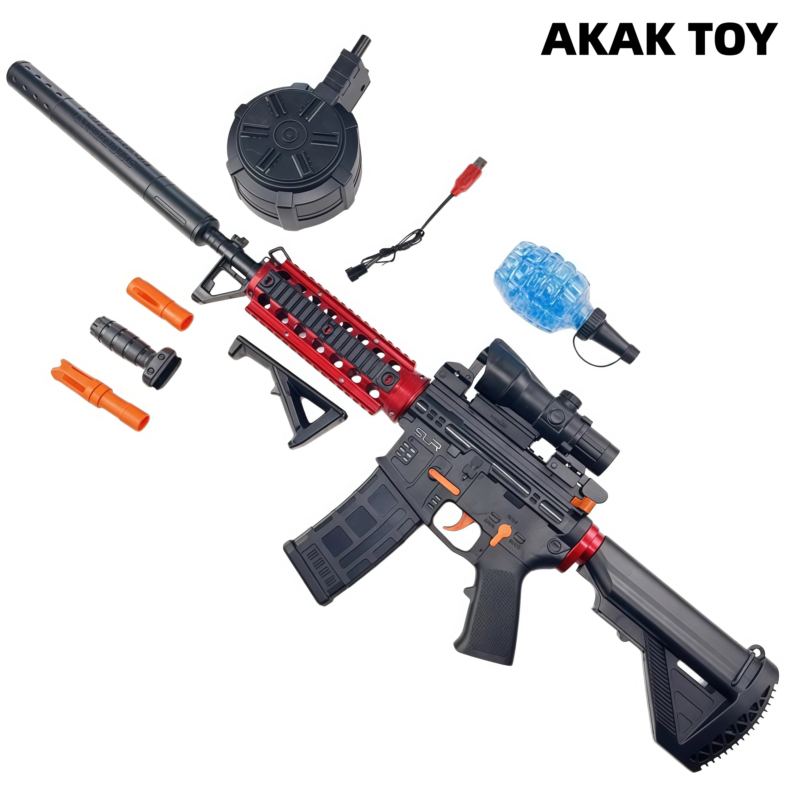 This M4A1 electric gel blaster guns has multi-mode firing and large-capacity drum magazines to meet different combat needs. It has manual and automatic dual modes, which brings firepower and endurance to the battle! Rich accessories Features:1. Shooting mode: electric/manual dual mode2. Shooting range: 20-25 meters3.FPS¡êo180--2004. Ammunition type: gel ball5. Size: 98 cm6.Battery: 7.4v Packing list:1* M4A1 gel blaster1* buttstock1* muzzle2* front and rear sights1* triangle buttstock1* front grip1* silencer1* magazine1* drum1* sight1* gel ball (10000 pcs)1* USB charging cable1* 7.4v lithium battery