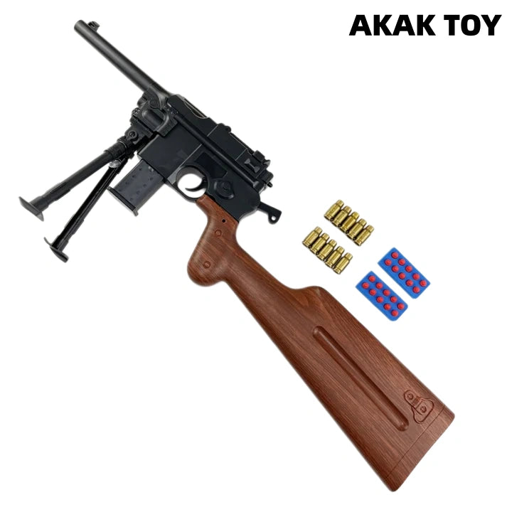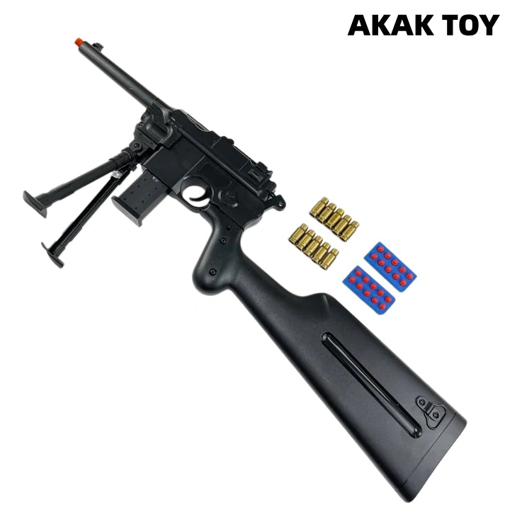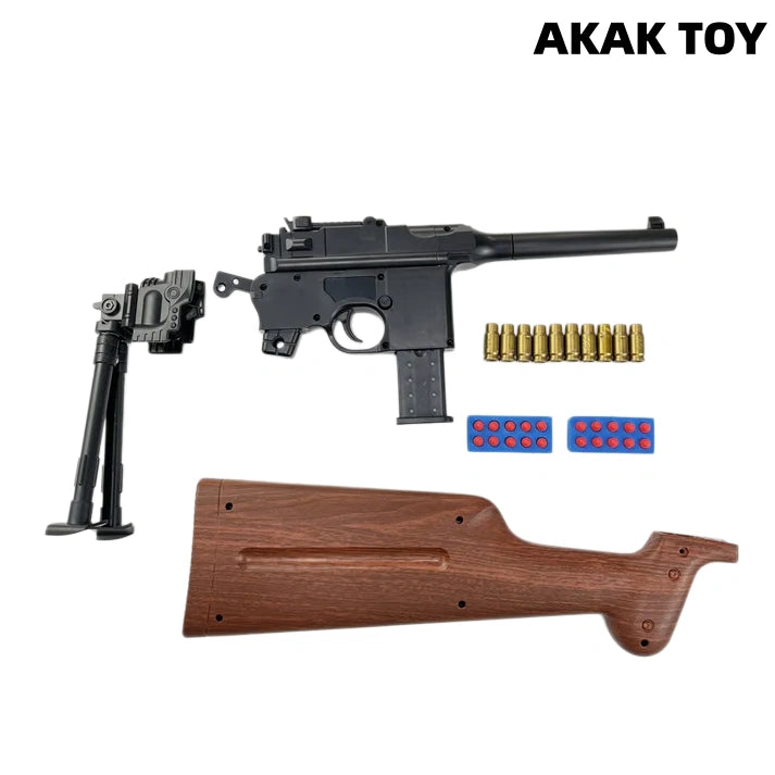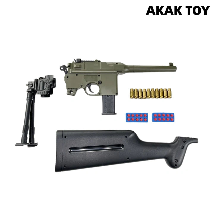 The C96 Mauser tactical toy gun is equipped with a bipod and laser device to improve accuracy. It automatically ejects shells every time it is shot, giving it a full sense of reality. The extended stock design makes it more stable to hold and not tiring to fight for a long time. Tactical upgrades start with this shot! Manual bolt loading, one-touch bolt ejection, manual bolt pulling, you can fire, the sights and hammer are adjustable, equipped with infrared and tripod bracket, bottom feed clip, smooth and no jamming, long-range shooting, extended stock, comfortable grip. Features:1. Extended stock for comfortable shooting2. Eject shells3. Magazine feeding4. Material: ABS plastic5. Shooting mode: manual6. Ammunition type: 7mm soft bullet7. Shooting range: 10-15 meters8. Size: 57*22CM9.Infrared aimer installed in the tripod Packing list:1*c96 Mauser soft bullet gun with stock1*bipod1*magazine8*shells20*soft bullets