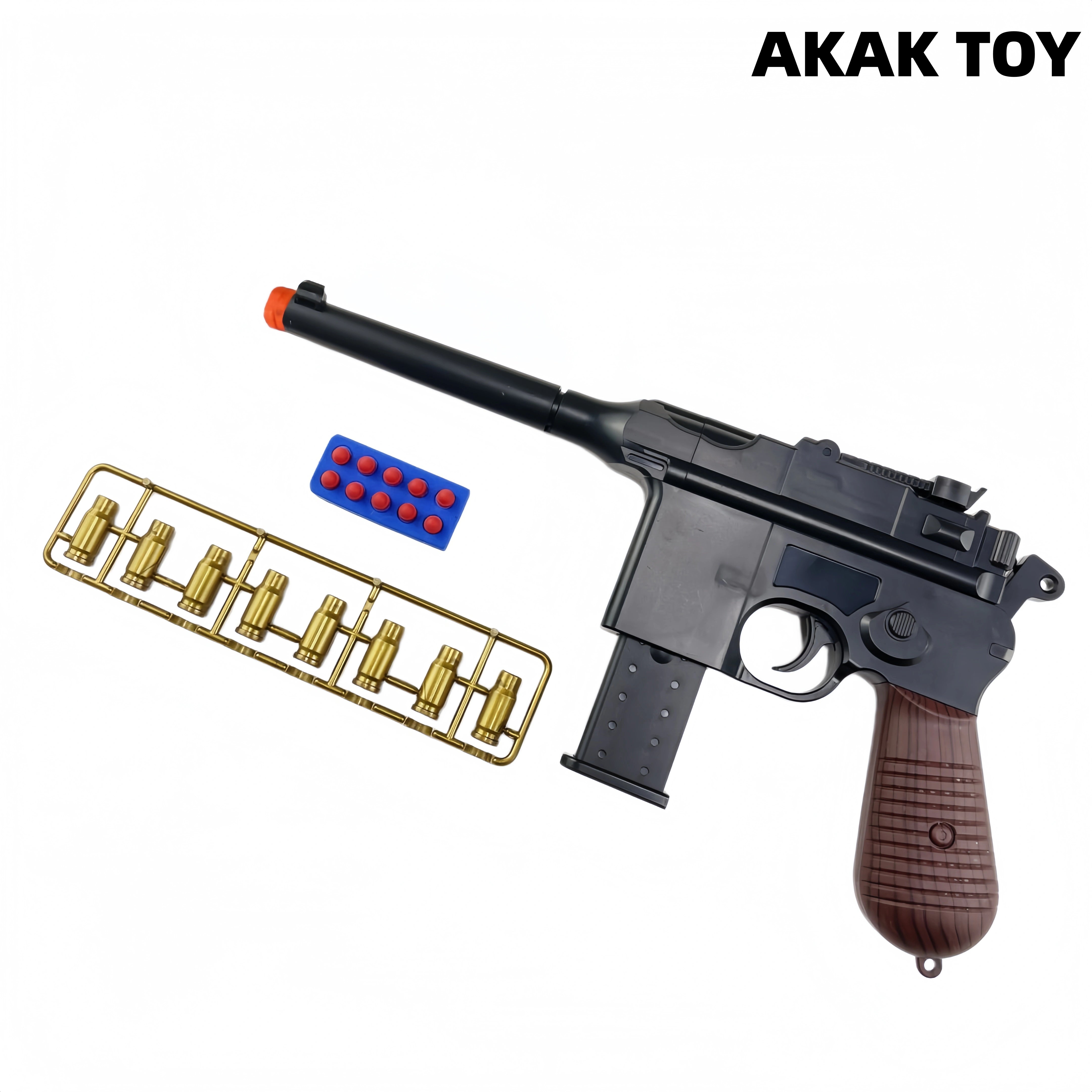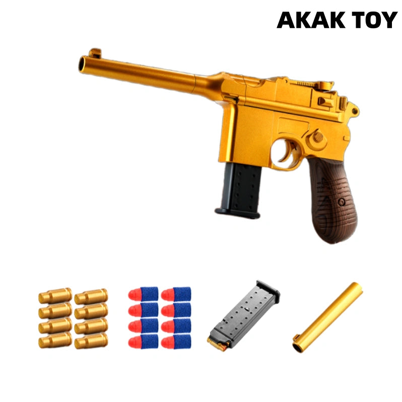 Mauser C96 foam dart gun, manual loading + shell ejection, brings a real shooting experience. Made of high-strength ABS material, safe and durable, can be loaded with 8 rounds of soft bullets, Automatic shell ejection after each shot, smooth operation without jamming, full of fun. Features:1. Manual loading, shell ejection2. Material: ABS3. Ammunition type: 7mm soft bullet4. Size: 32cm Packing list:1*Mauser m1932 soft bullet gun1*barrel1*magazine8*shell12*soft bullet