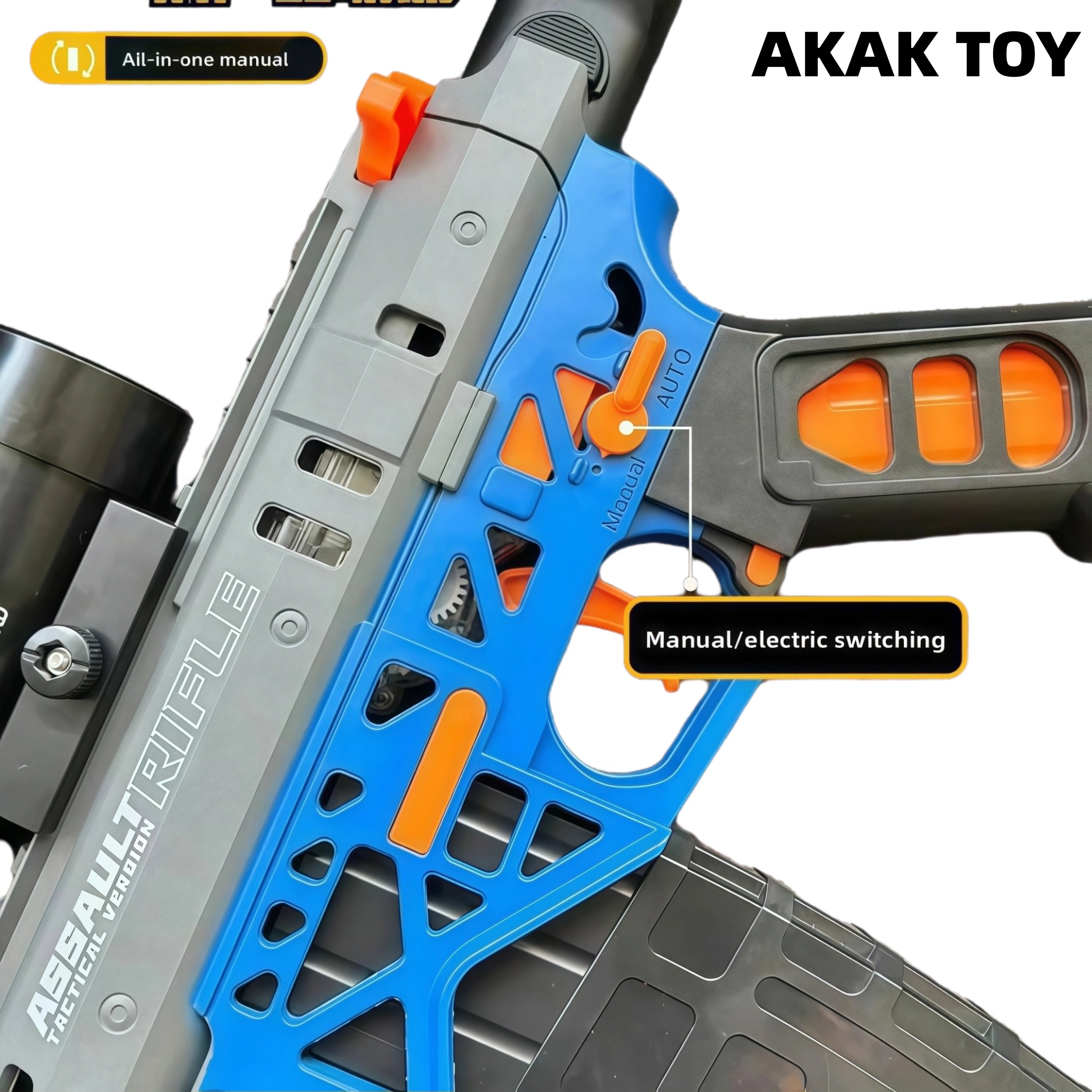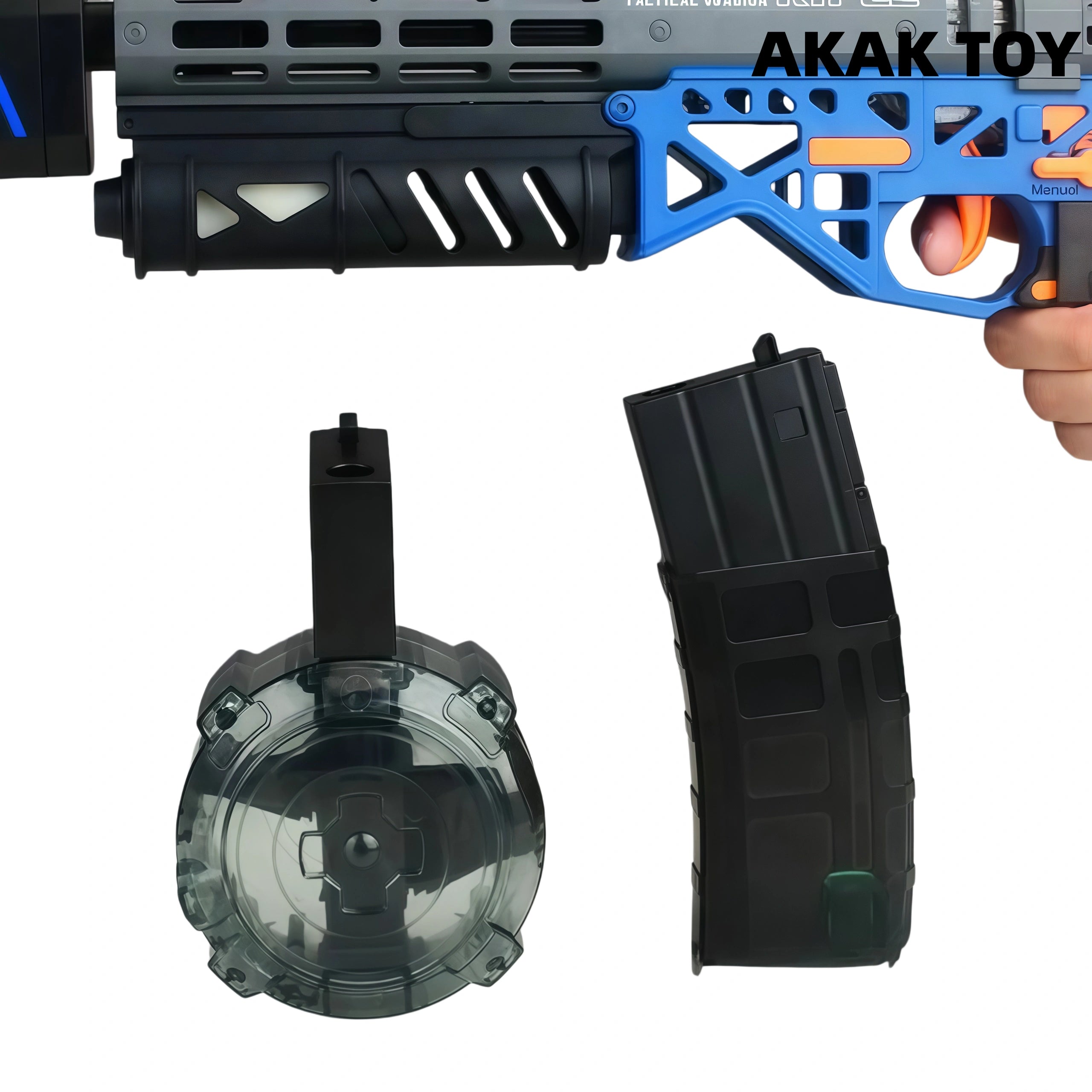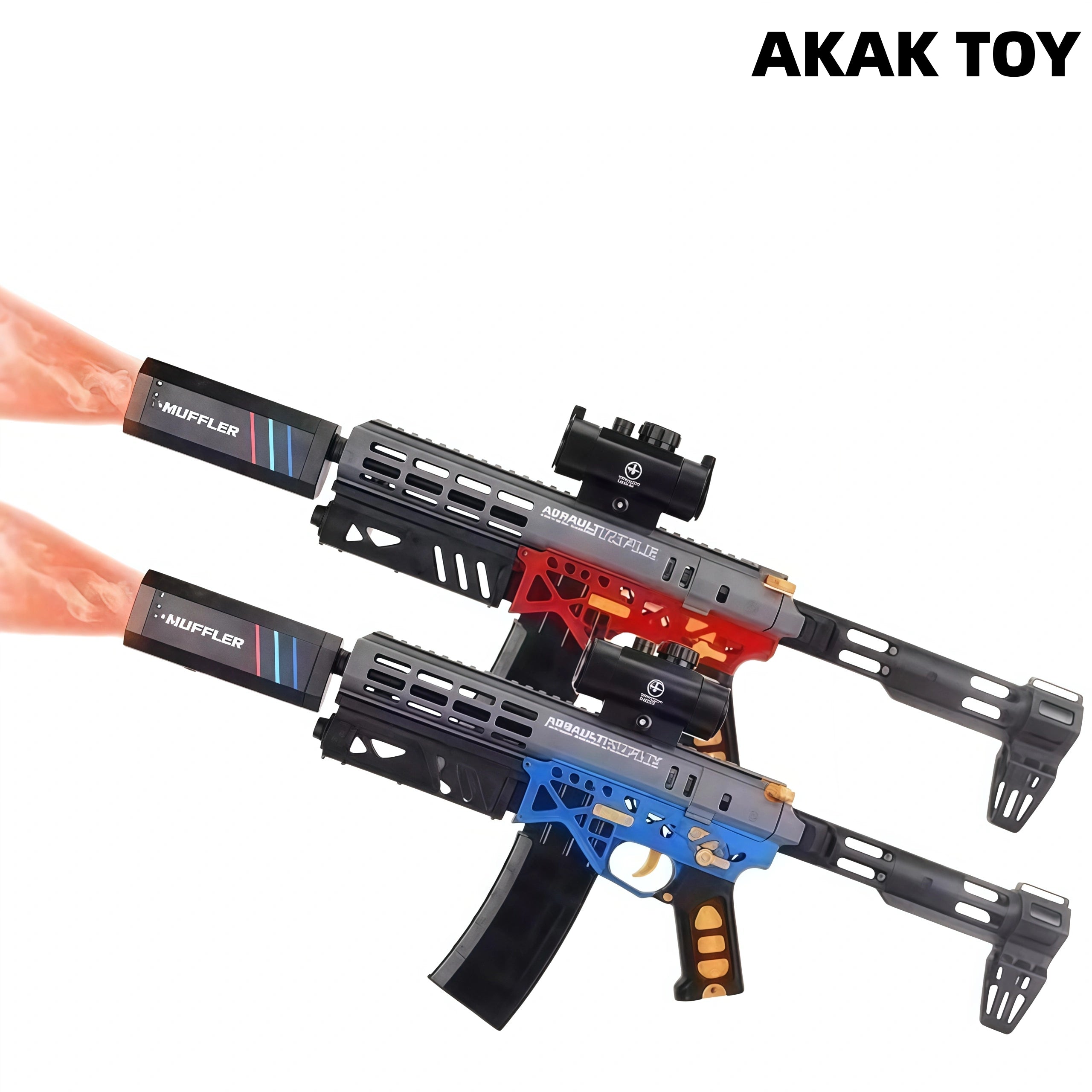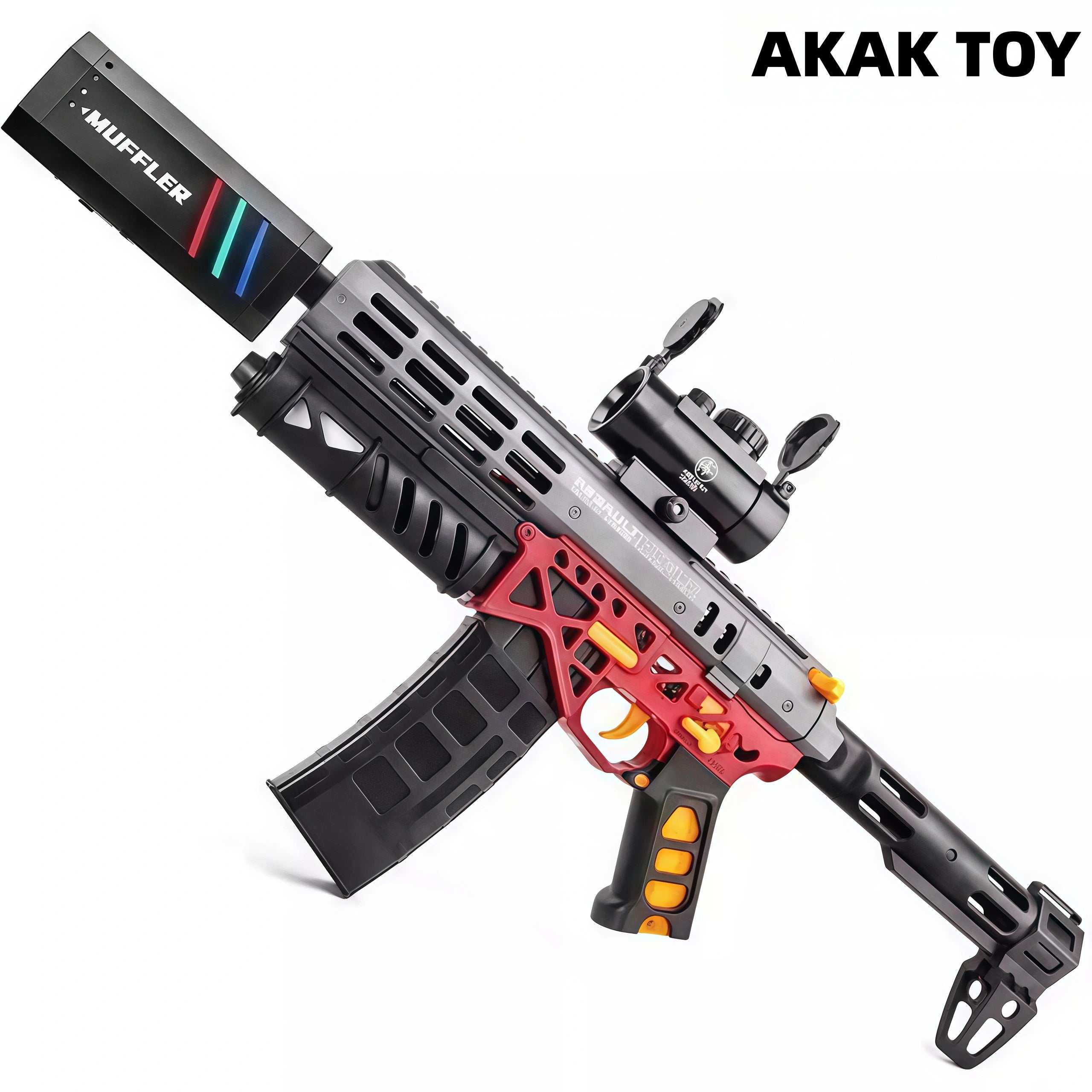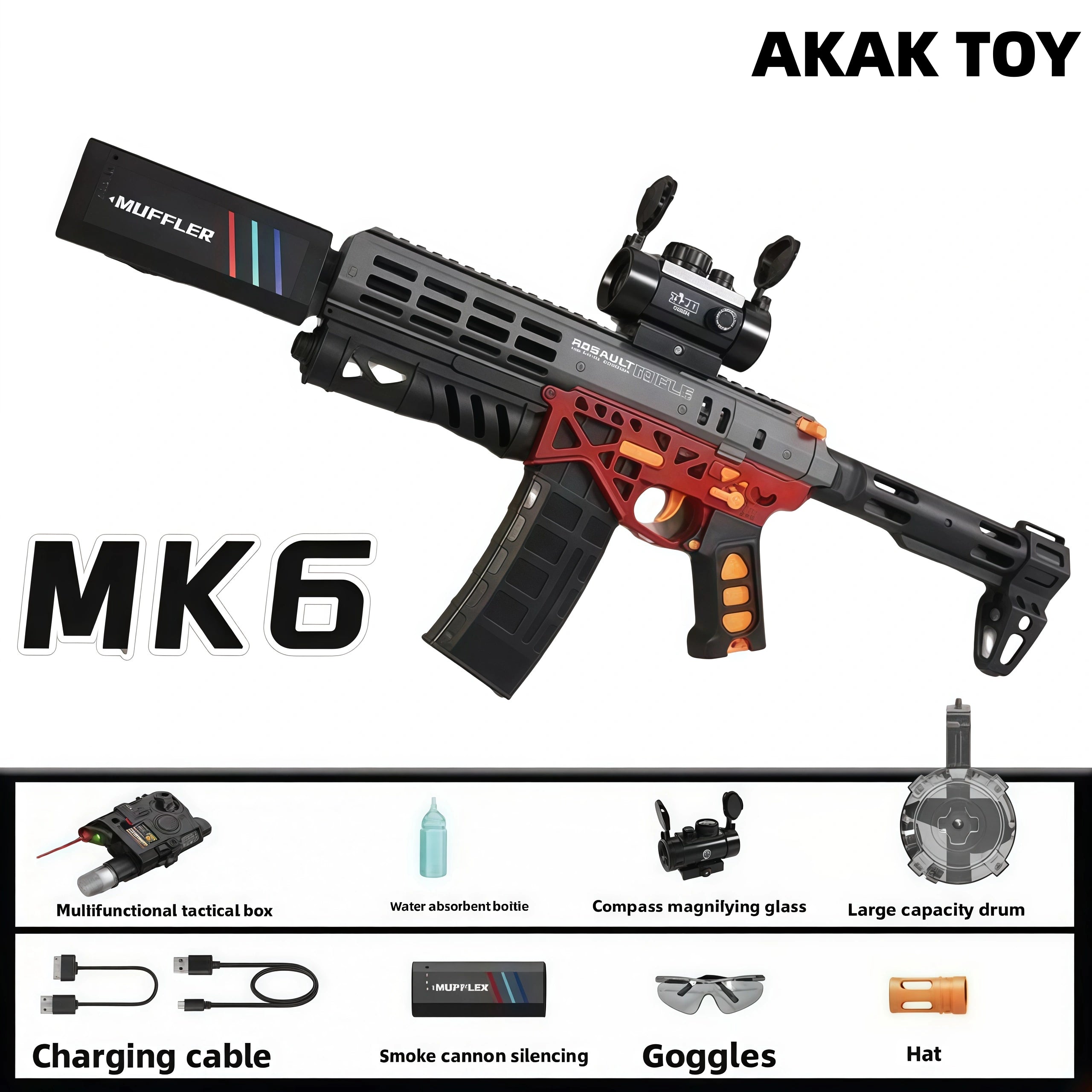 - This new rifle-style gel gun features a sleek skeleton design and a powerful tracer suppressor that can produce a mesmerizing smoke effect. - Easily switch between manual or fully automatic shooting modes, with the included gun rod and transparent drum magazine, you will never be short of bullets. - Powered by a specially made 7.4V modular battery, it is an ideal choice for all action shooting enthusiasts. - New rifle-style gel gun with a skeleton design, both the suppressor and the receiver have a recoil function. Features:1. With smoke and flash hider, foldable stock2. Material: nylon3. Shooting mode: manual/full-automatic4. Shooting range: 20 meters5. Firepower: 180 FPS6. Ammunition type: 7-8mm gel ball7. Size: 67*4*29 cm Packing list:1* MK6 gel gun1* multi-function tactical box1* water bottle1* compass zoom lens1* drum1* magazine1* smoke gun silencer1* goggles1* flash hider1* 7.4v modular battery1* USB charging cable1* gel ball (10000 pcs)