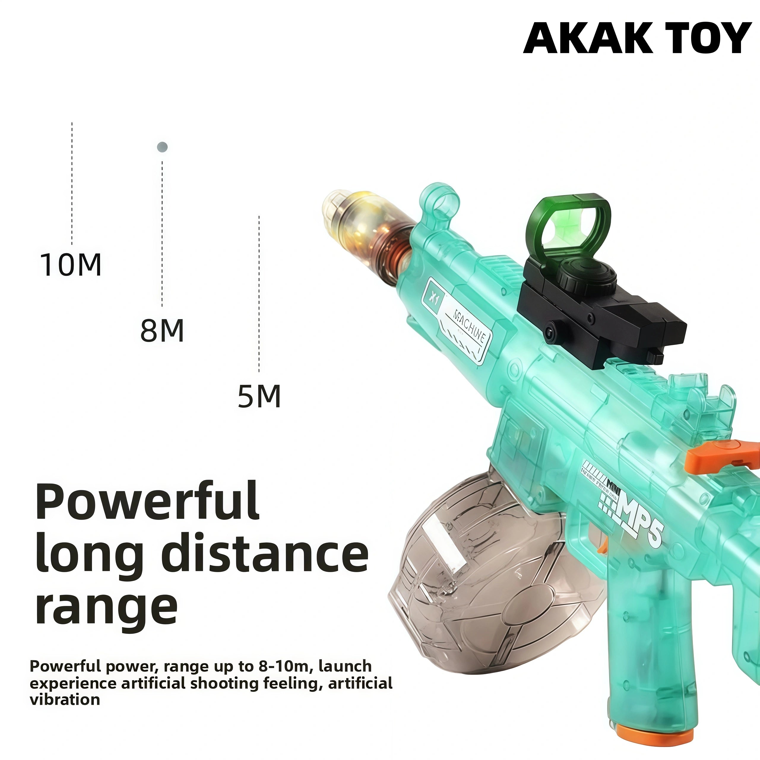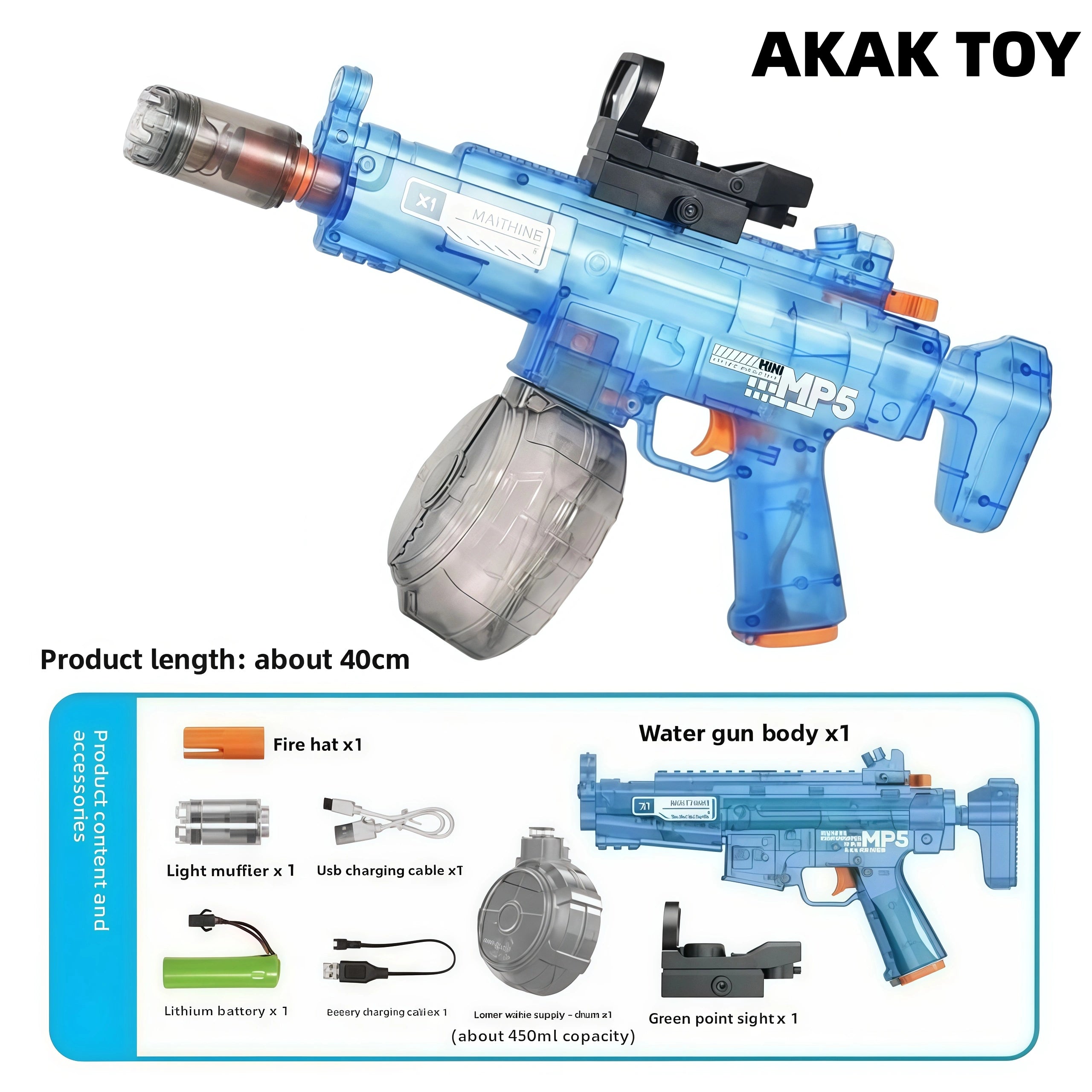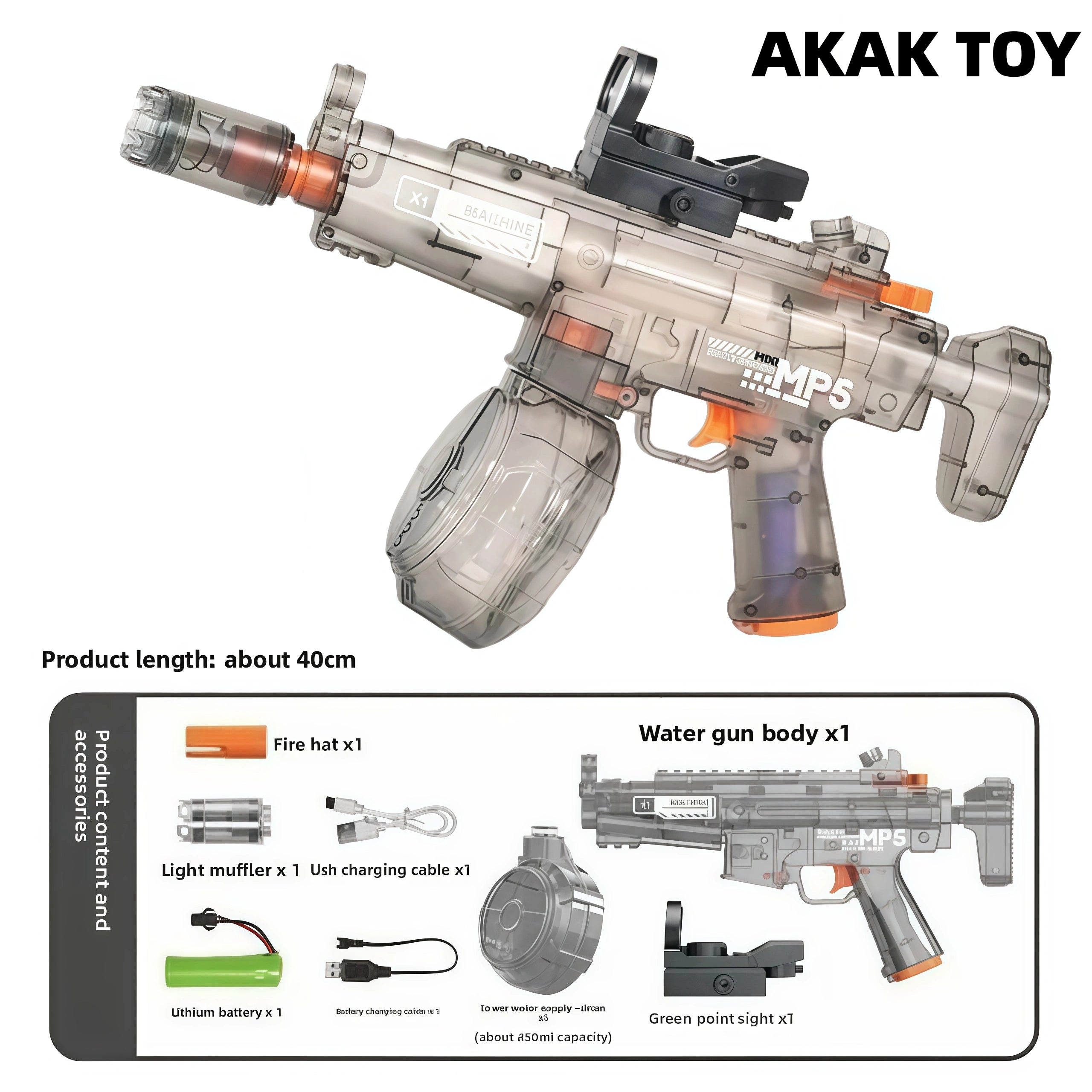 This simulated MP5 electric water gun has ultra-long-range shooting capability, with a range of up to 20 meters. It is equipped with a powerful motor and the explosive water flow is fast. The unique flame special effect design and built-in rechargeable battery have stable battery life and are environmentally friendly and worry-free. Electric water gun, one-button continuous firing, cool lighting, 450ml large capacity, simulated red dot light sight, silencer induction transmitting light, rechargeable battery for long-lasting battery life, quick and convenient, simulated cool lighting effects, one-button press to discharge water, ultra-long-distance shooting, water tank, green dot sight, clearer at night, strong power, range up to 15 meters, cool shooting. Features:1. High firing rate2. Long-range shooting3. Rechargeable battery life4. Strong power5. Material: ABS plastic6. Shooting mode: electric7. Size: 40CM Packing list:1*MP5 water gun1*flash cap1*light silencer1*USB charging cable1*lithium battery1*battery charging cable1*drum magazine1*green dot sight