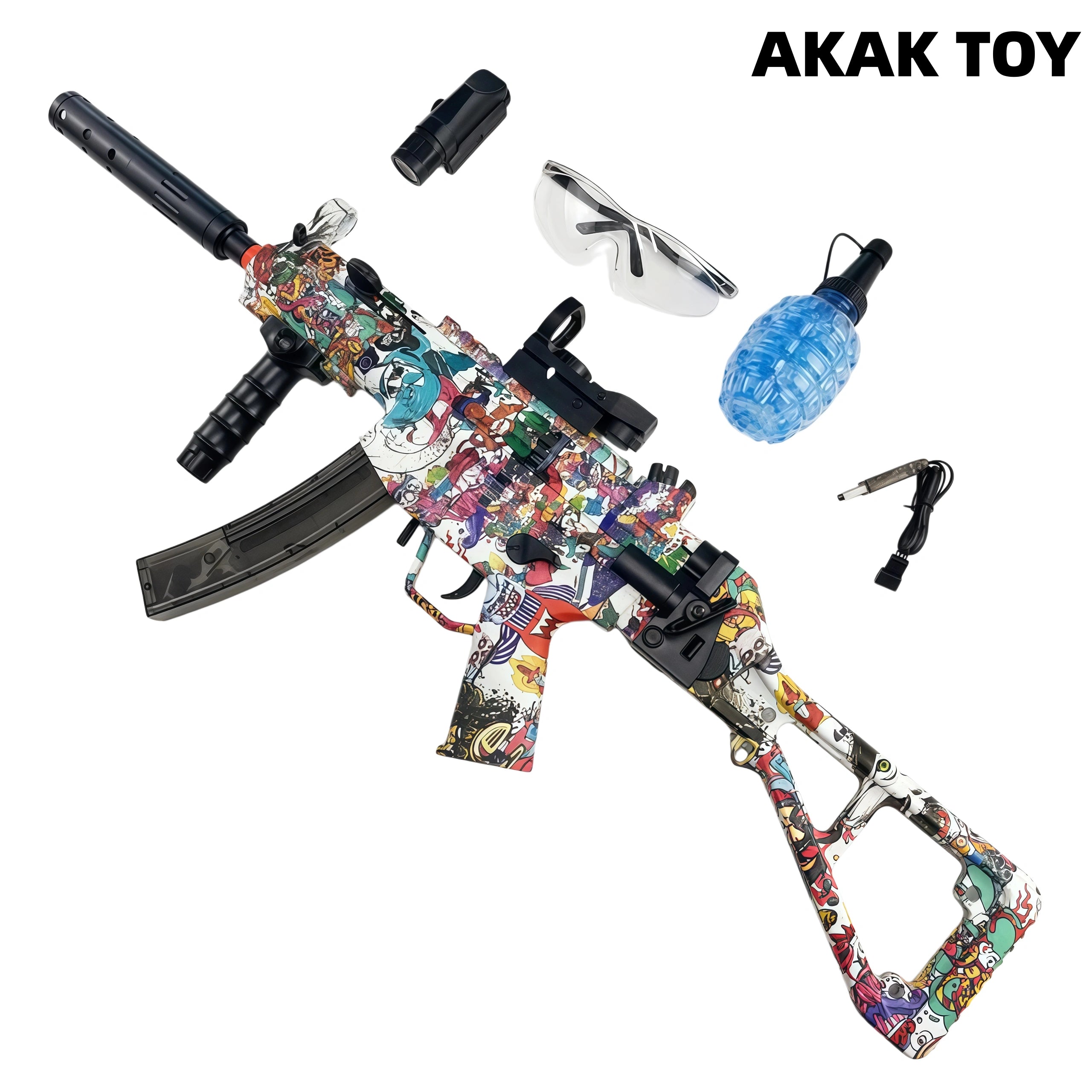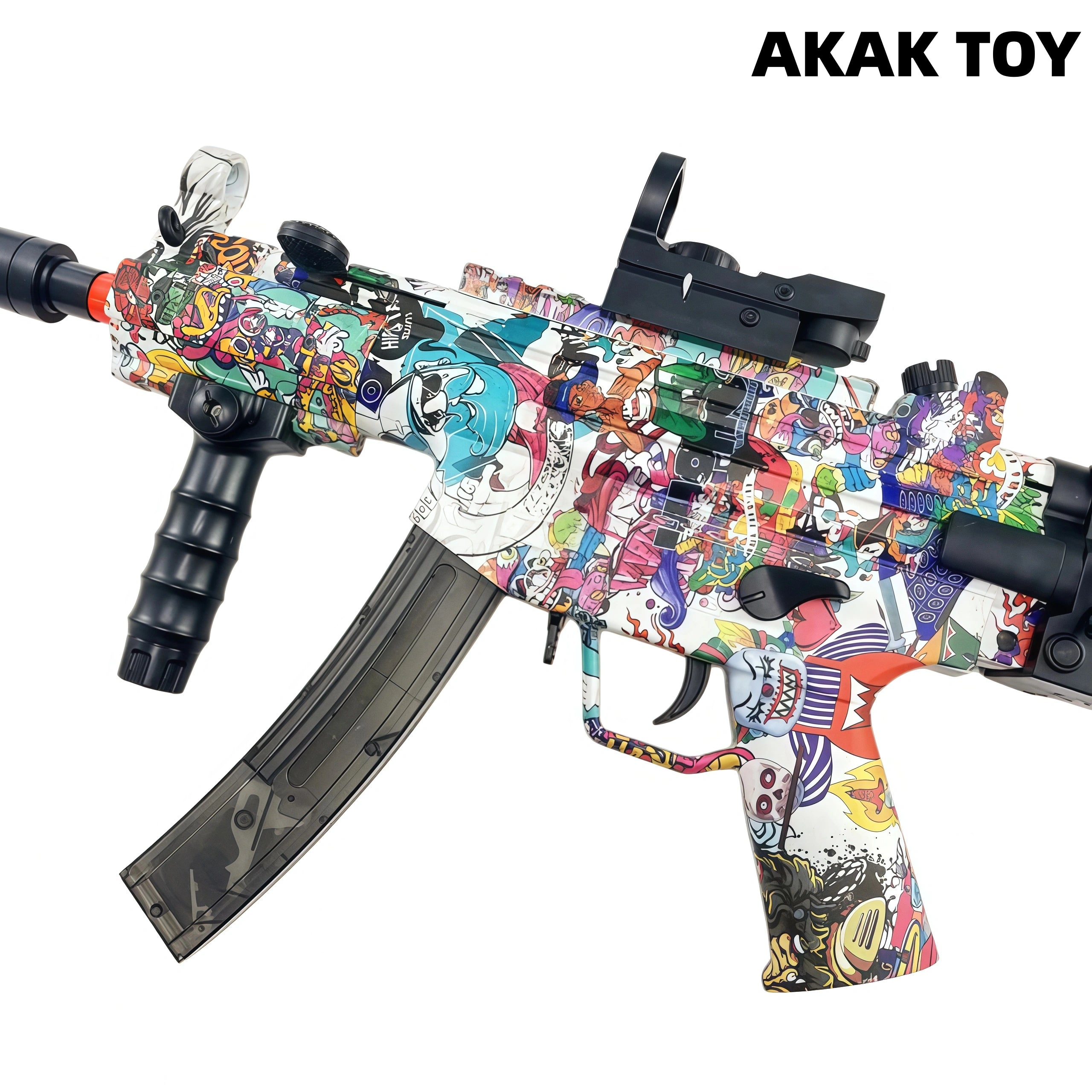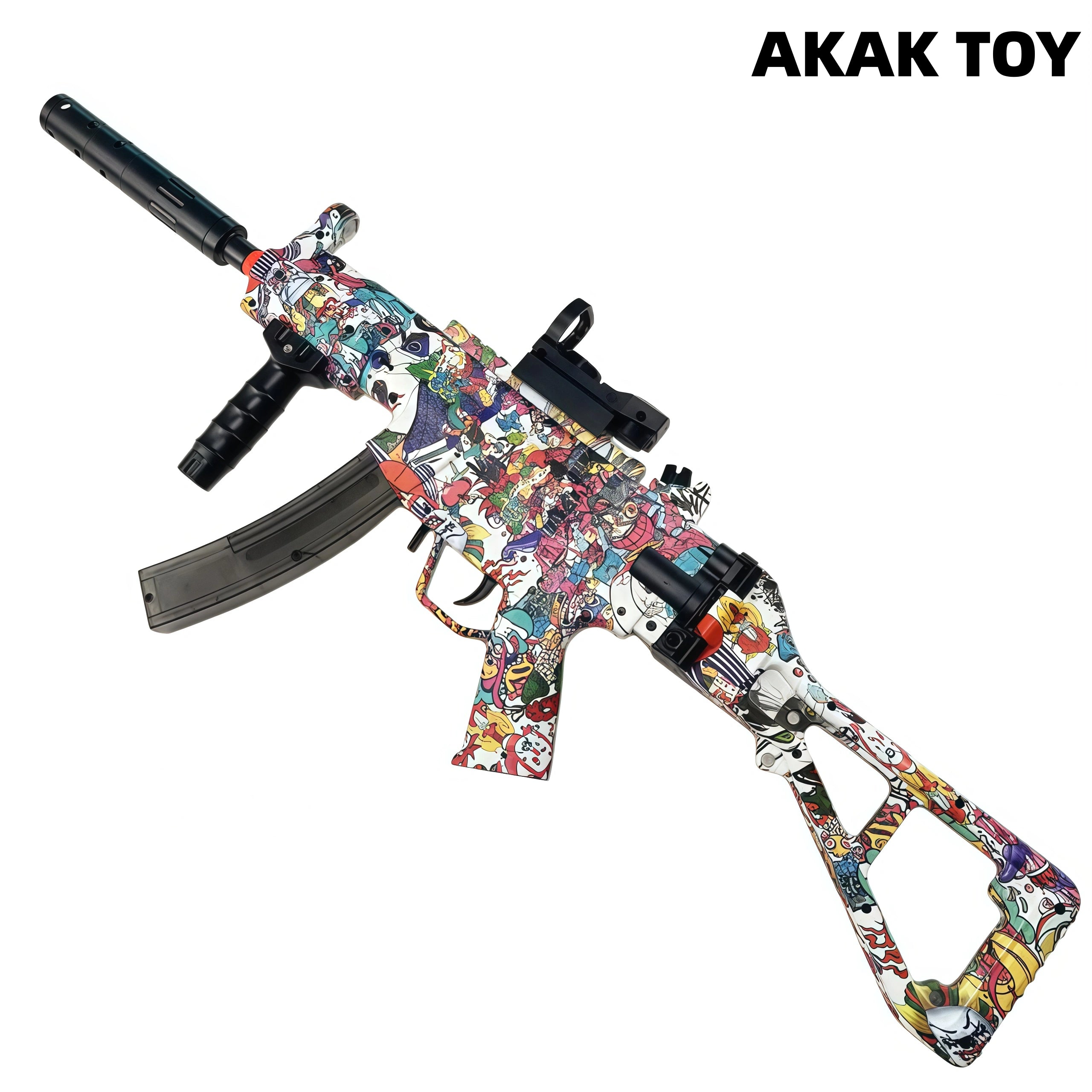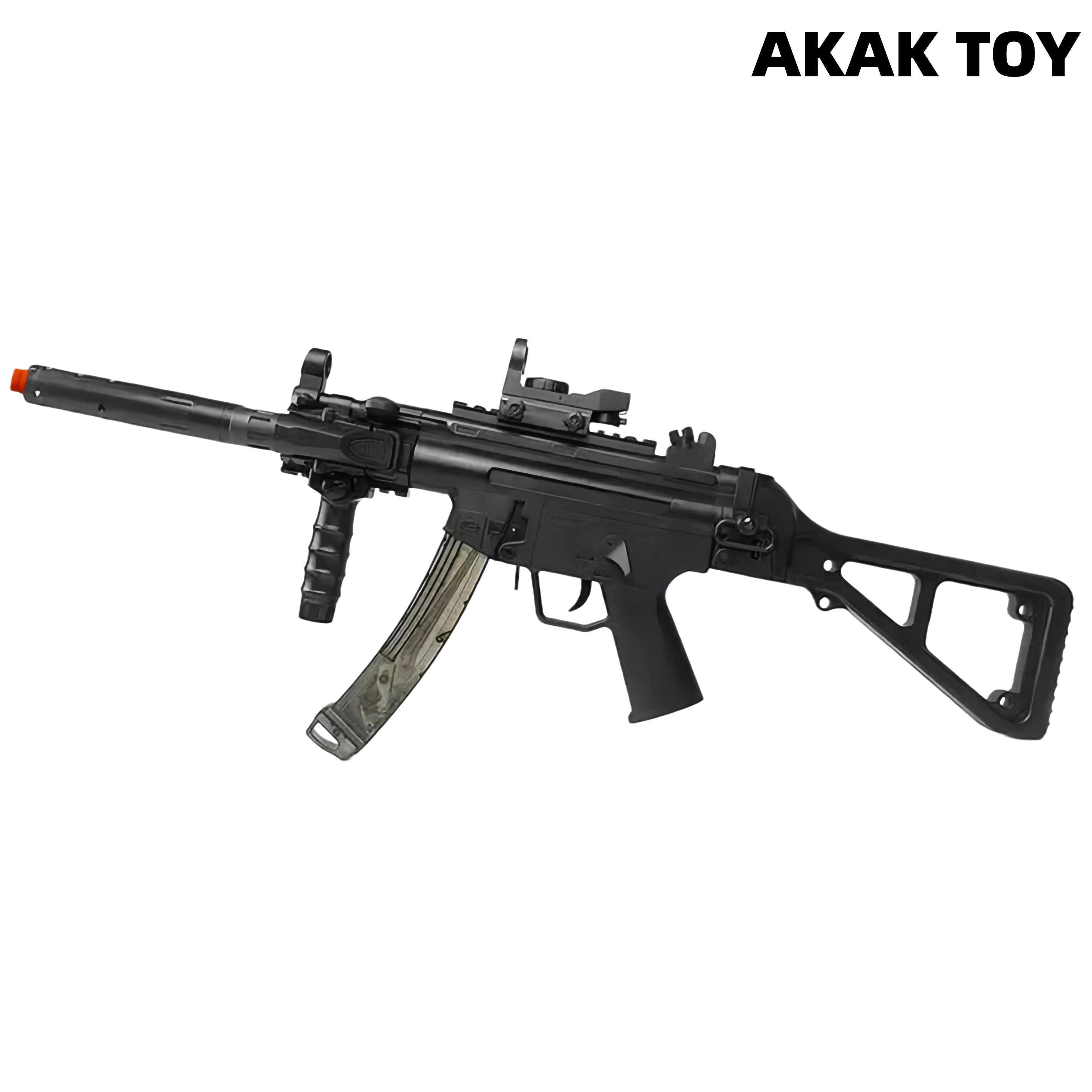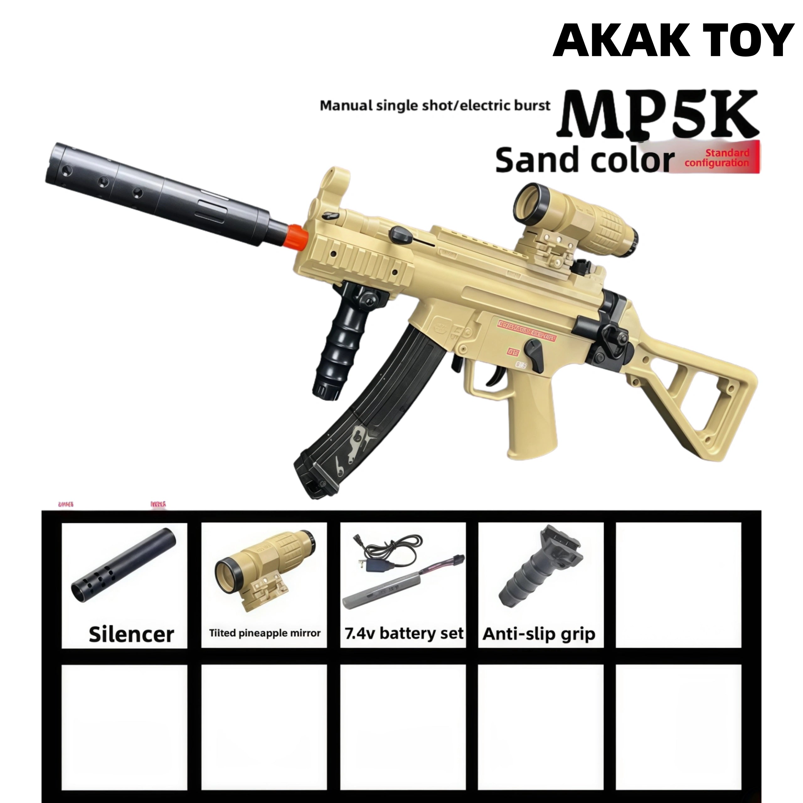 1. The MP5K Gel Blaster features both automatic and manual modes, offering diverse gameplay suitable for tactical games and shooting practice. 2. It also comes with a high-capacity drum magazine, doubling the continuous firing time and ensuring smooth feeding. 3. Top and side rails allow for the mounting of tactical accessories; it also includes an auxiliary tactical sight for accurate aiming at long-range targets. 4. The folding stock design makes it more convenient to carry; adjustable iron sights aid in shooting. Features:1. Detachable accessories, bottom-feed magazine, folding stock2. Firing modes: Manual/Full-automatic3. Material: ABS plastic4. Range: Over 20 meters5. FPS: 180+6. Size: 78 cm Packing List:Standard Configuration:1*MP5K toy gun1*Suppressor1*Flip-type sniper scope1*Grip1*Magazine1*7.4V rechargeable battery1*USB charging cable1*Gel balls (10,000 pieces) Deluxe Configuration:1*MP5K toy gun1*Suppressor1*Flip-type sniper scope1*Grip1*Magazine1*Drum magazine1*Flashlight1*Infrared holographic sight1*Green dot holographic sight1*7.4V rechargeable battery1*USB charging cable1*Gel balls (10,000 pieces)