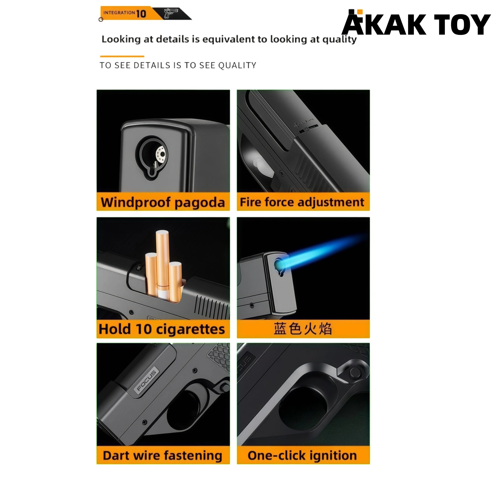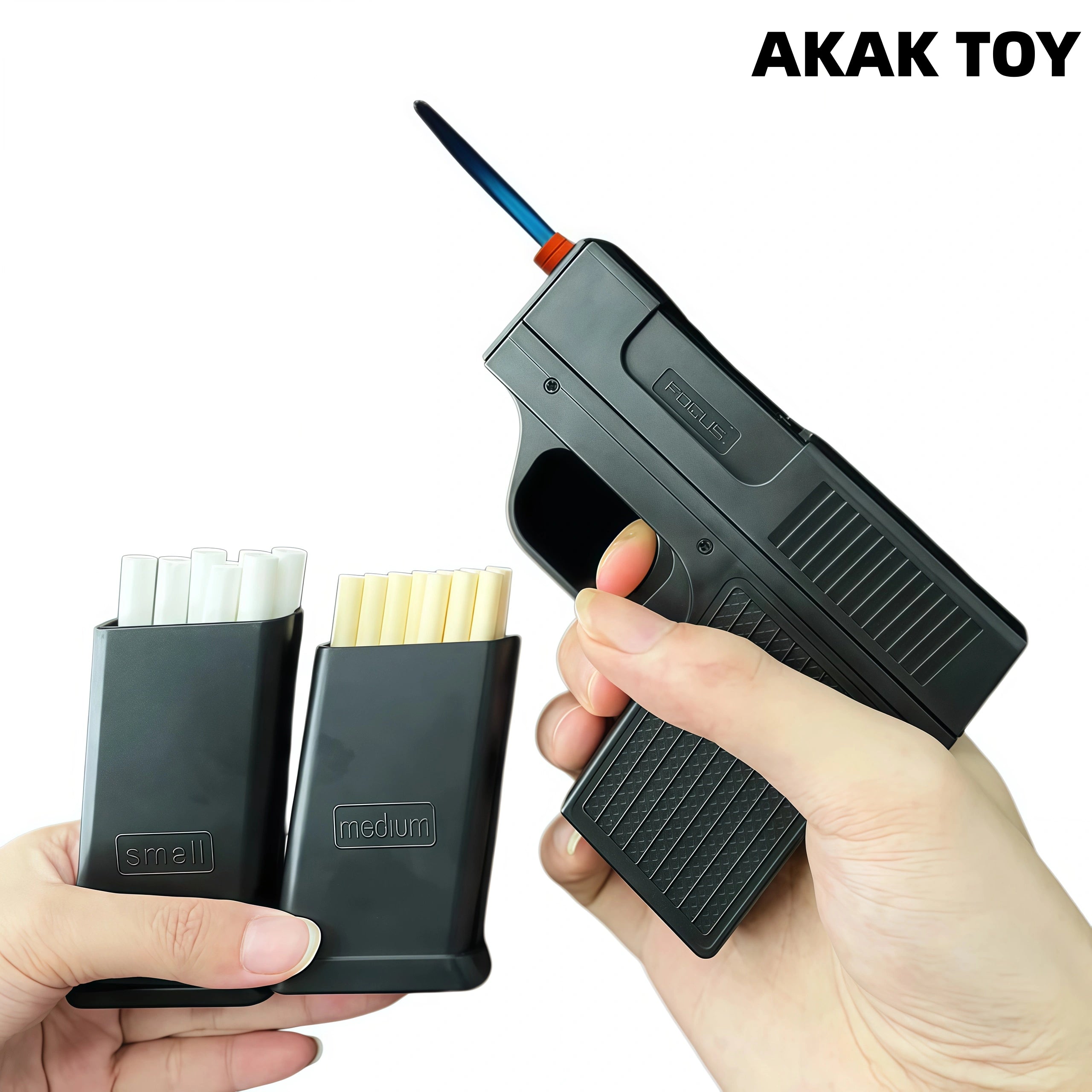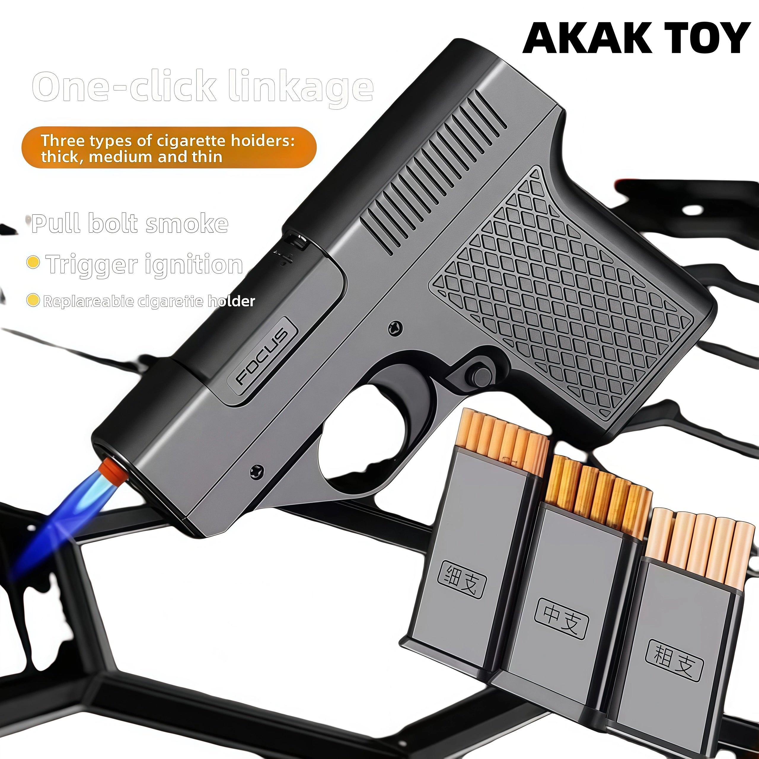 This gun-style lighter integrates the functions of cigarette storage and ignition. It can be triggered by one button and has a stable blue flame. It supports three sizes (thin, medium and thick) of cigarette clips to be freely replaced. The pull-bolt cover design meets the needs of different users.