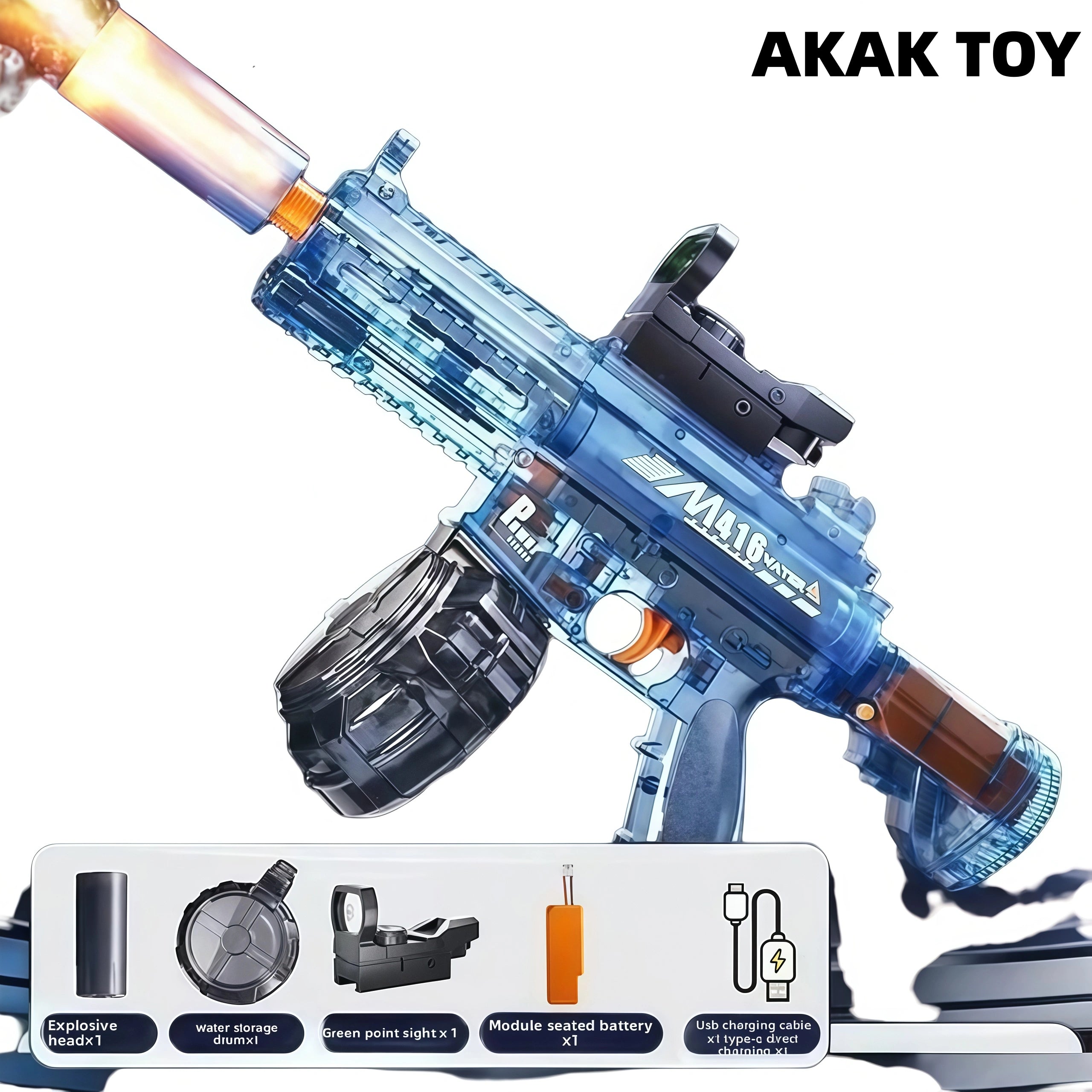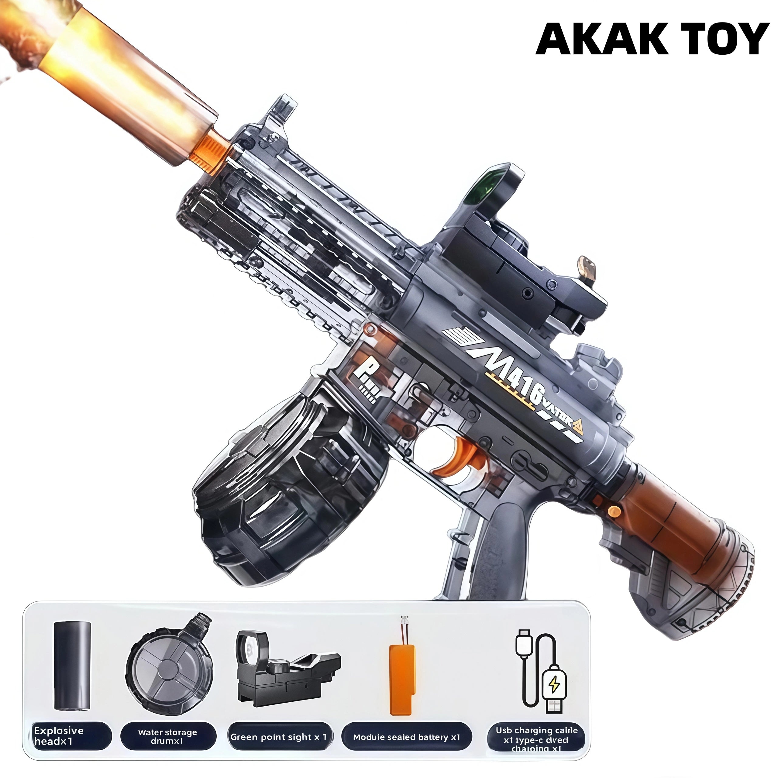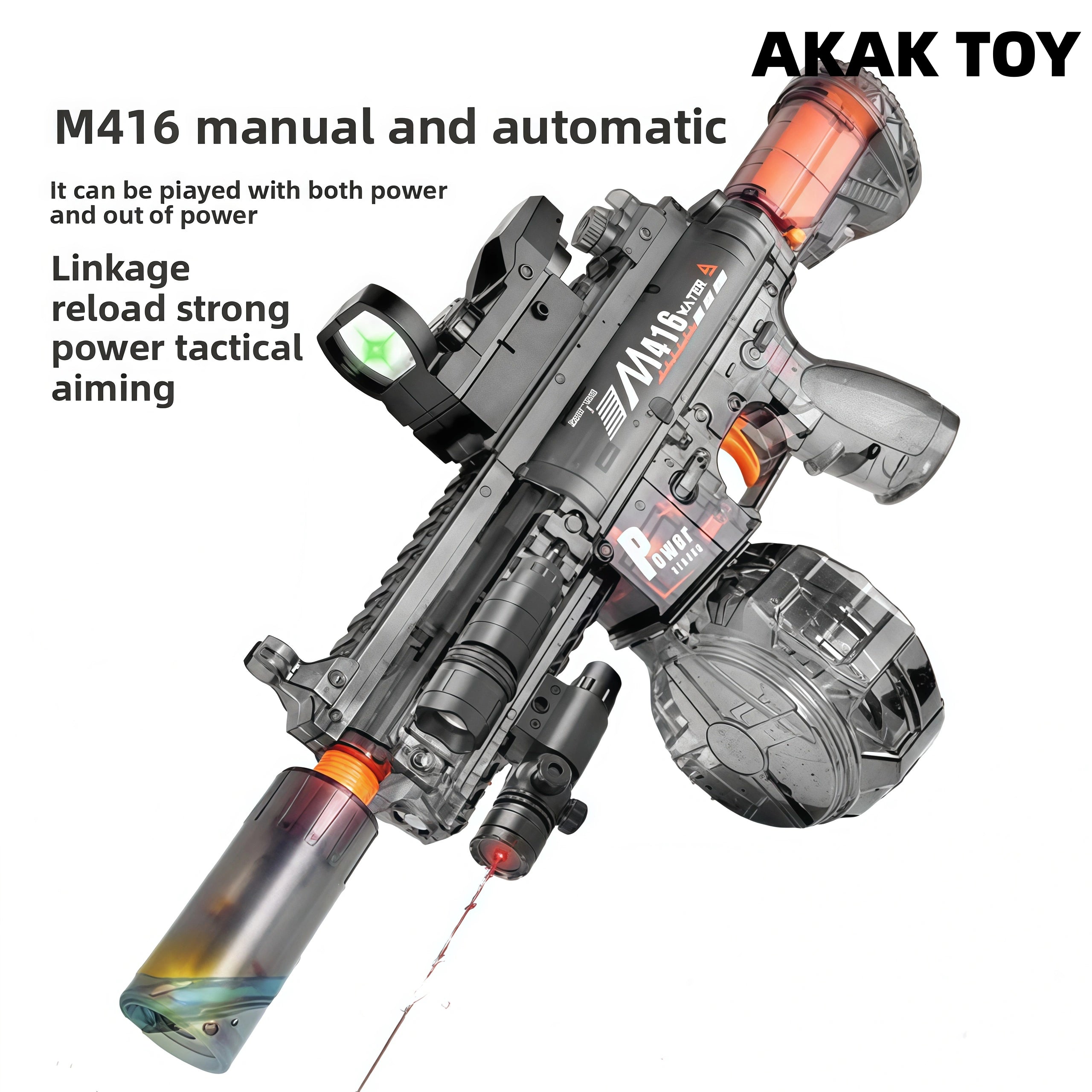 This M416 burst water gun is equipped with an induction flashing light effect, which is full of light effects when shooting, combining coolness and practicality. It supports 15 meters long-range firing, and the electric burst design is labor-saving and efficient. You can play manually even if the power is off. The linkage return structure adds a sense of reality, large-capacity water storage drum + 360?? leak-proof system, you can enjoy the battle without stopping! Features:1. Extra-large capacity water tank2. Electric return3. Removable accessories4. Strong power5. Material: ABS plastic6. Shooting mode: electric/manual7. Range: 15 meters+8. Size: 45CM Packing list:1*M416 water gun1*Flash head1*Water storage drum1*1*Green dot sight1*Module sealed battery1*USB charging cable