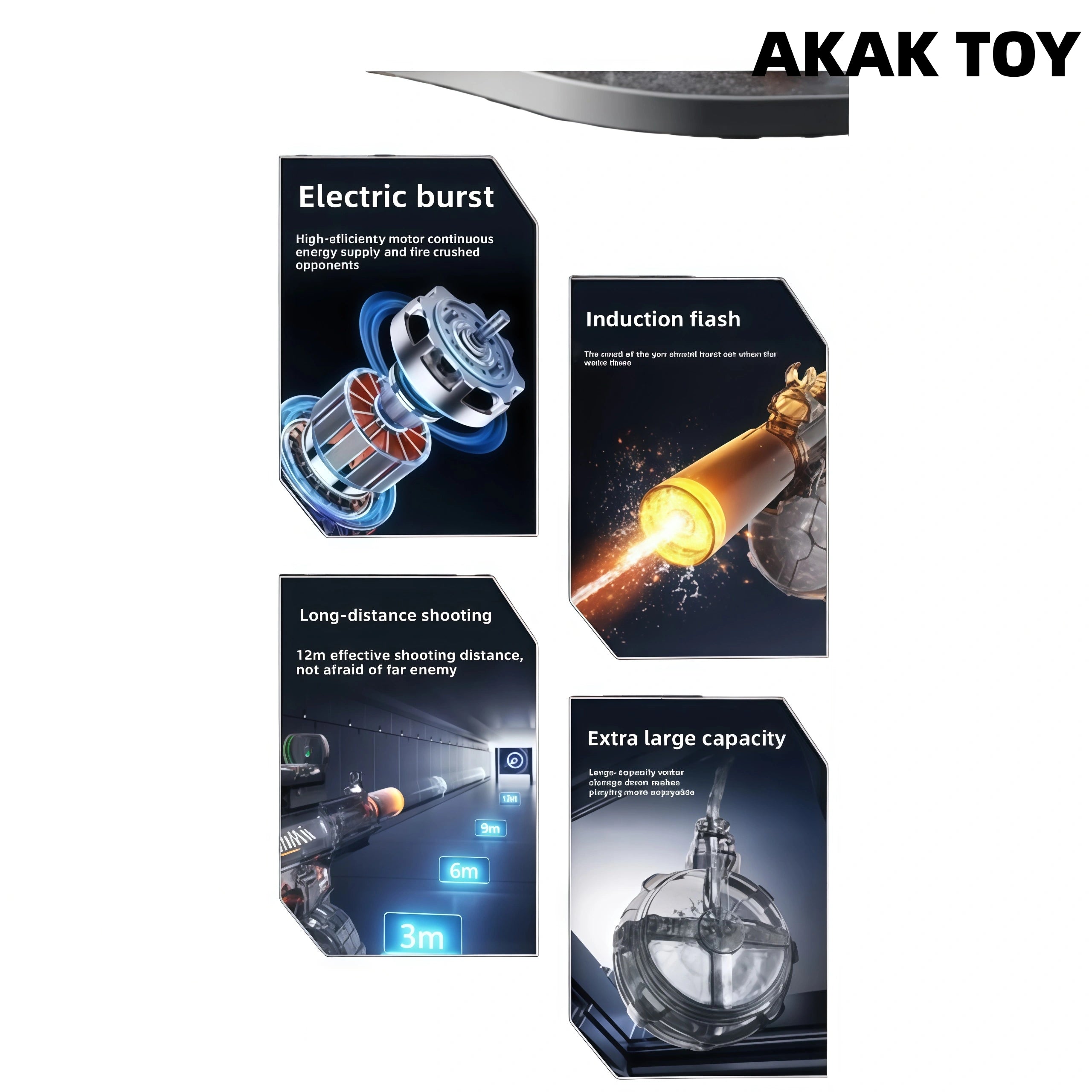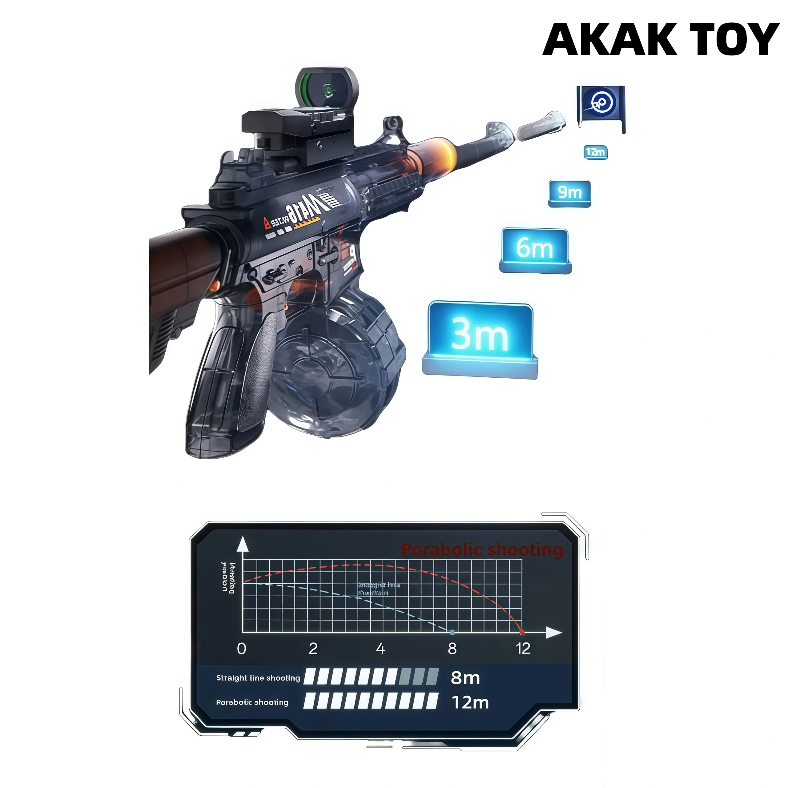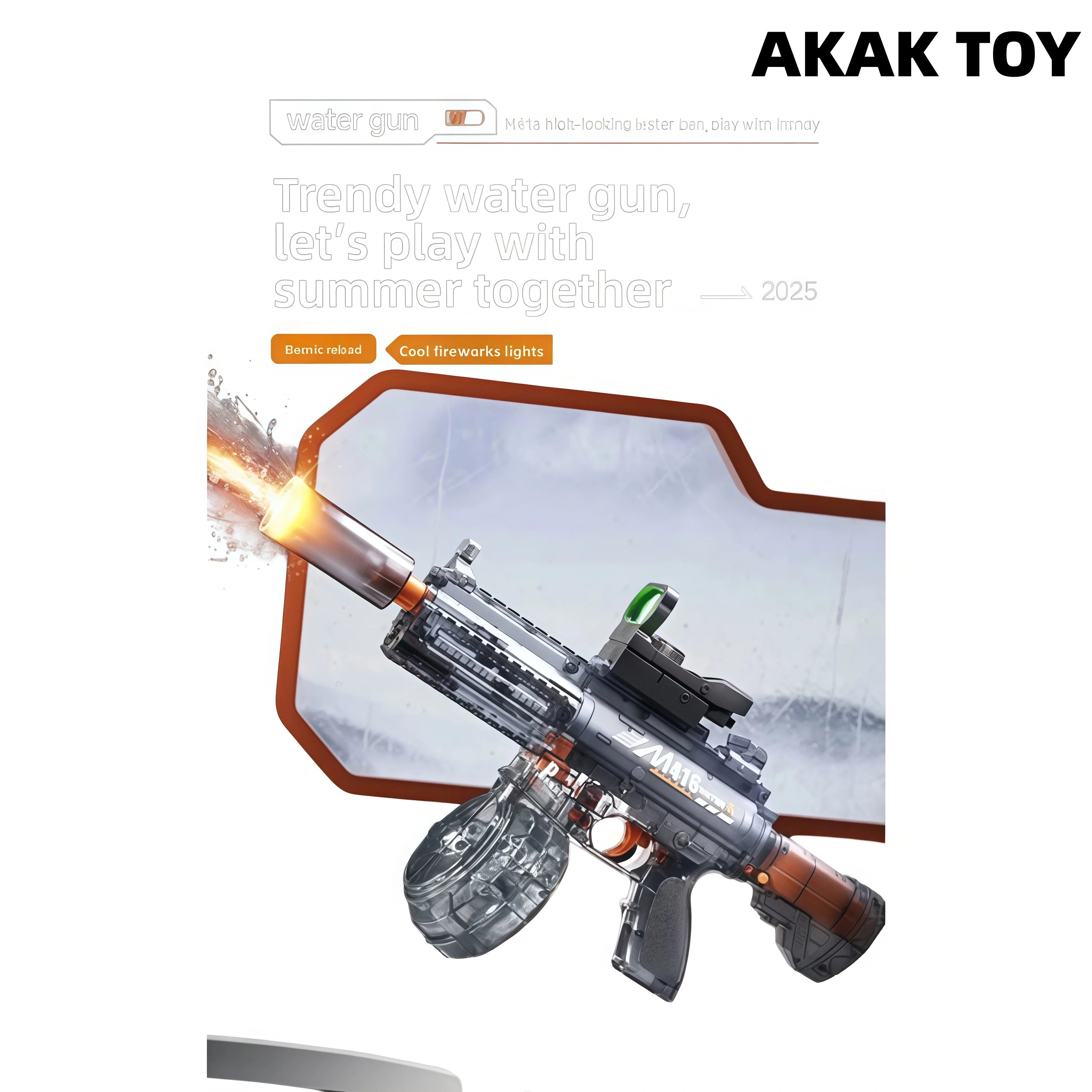 This M416 burst water gun is equipped with an induction flashing light effect, which is full of light effects when shooting, combining coolness and practicality. It supports 15 meters long-range firing, and the electric burst design is labor-saving and efficient. You can play manually even if the power is off. The linkage return structure adds a sense of reality, large-capacity water storage drum + 360?? leak-proof system, you can enjoy the battle without stopping! Features:1. Extra-large capacity water tank2. Electric return3. Removable accessories4. Strong power5. Material: ABS plastic6. Shooting mode: electric/manual7. Range: 15 meters+8. Size: 45CM Packing list:1*M416 water gun1*Flash head1*Water storage drum1*1*Green dot sight1*Module sealed battery1*USB charging cable