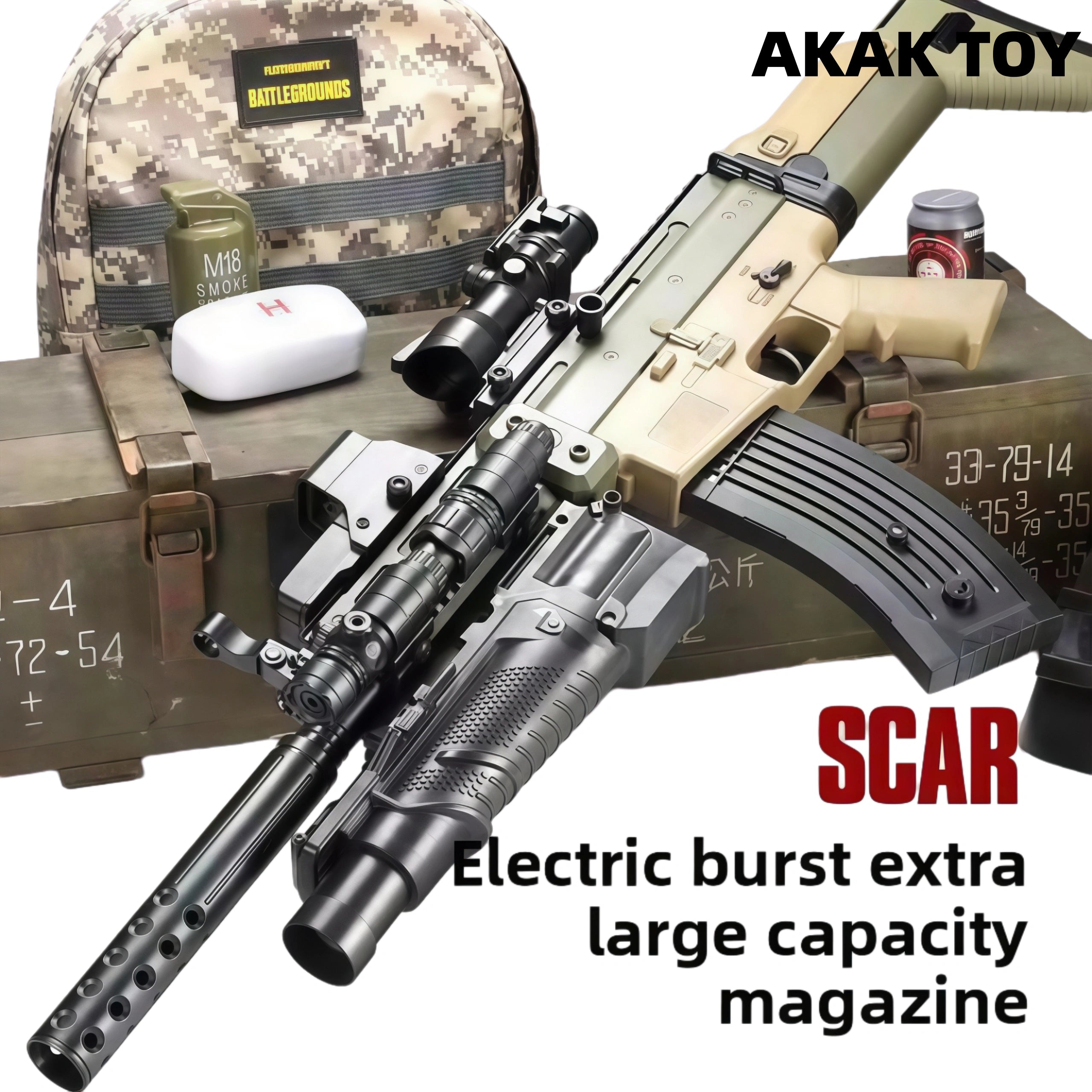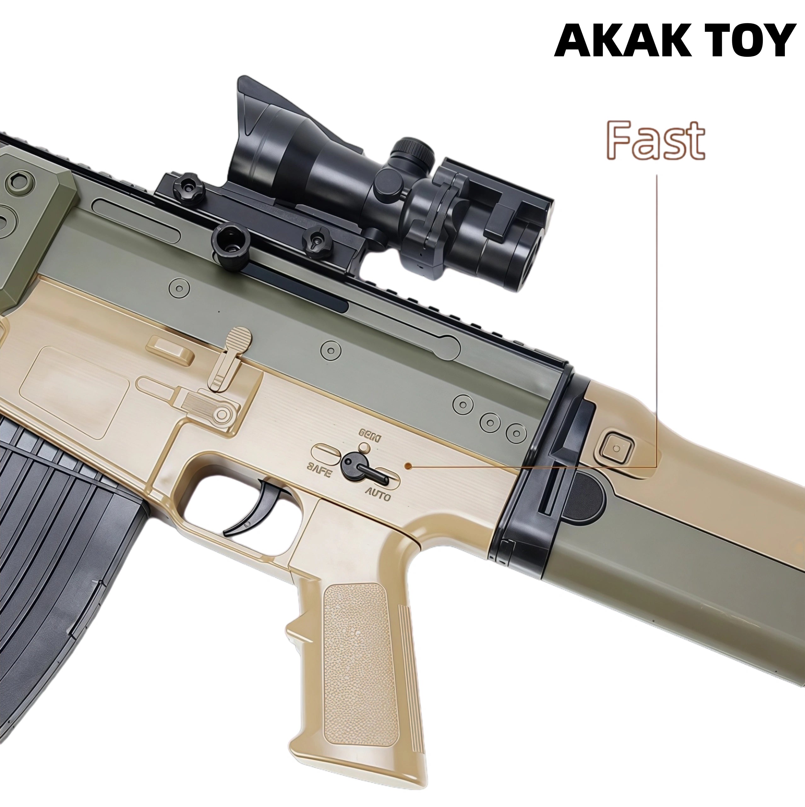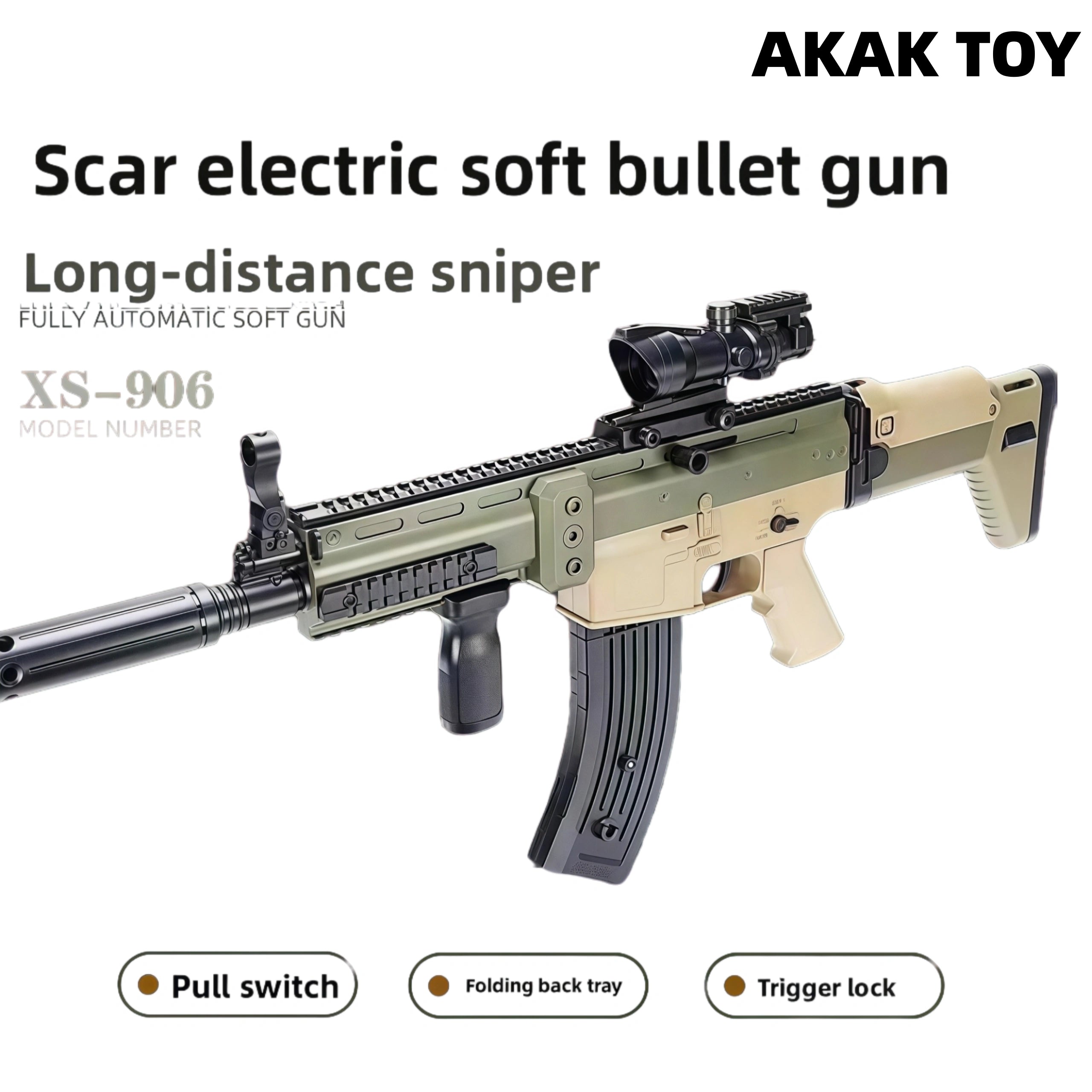 This SCAR soft bullet gun is equipped with a high-torque carbon brush motor, which doubles the performance, high speed and low noise. The powerful power system allows the range to reach 15 meters. It also supports semi-automatic/automatic shooting mode. Its buttstock can be folded with one button, and it is equipped with an adjustable zoom lens, a large-capacity magazine and safe EVA soft bullets to bring a pleasant gaming experience. Features:1. Electric burst, long-range sniping, folding buttstock2. Safe soft bullets, strong power3. Range: 15-20 meters4.Shooting mode: fully automatic/semi-automatic5.Ammunition type: full-length Nerf darts6. Size: 76 cm Packing list:1*SCAR soft bullet gun1*Flashlight1*Infrared1*Sling strap1*Grip1*Magnifying lens1*Silencer1*Cleaning tube1*Magazine1*Automatic reset target1*Rechargeable battery1*USB charging cable20*Soft bullets