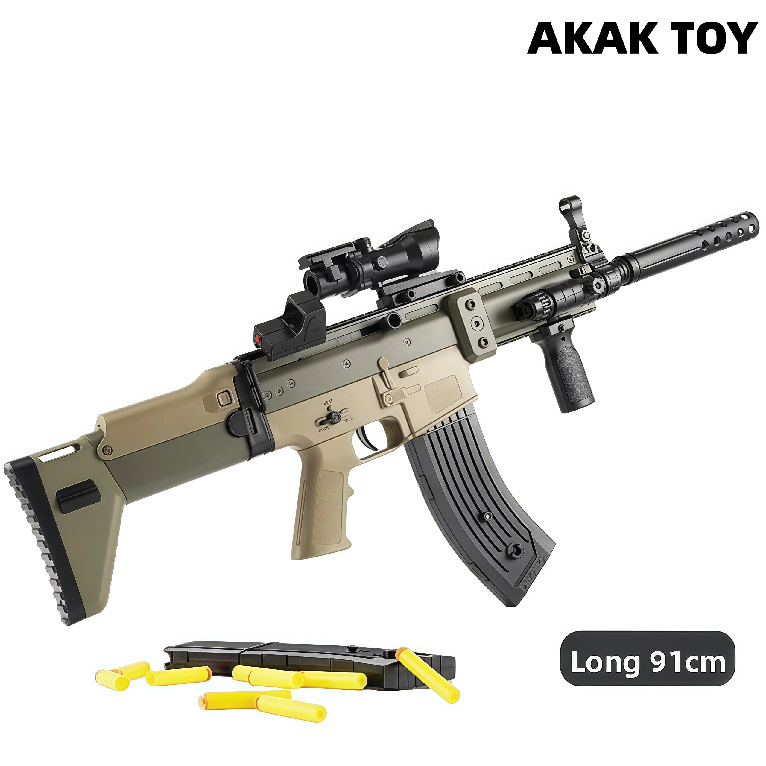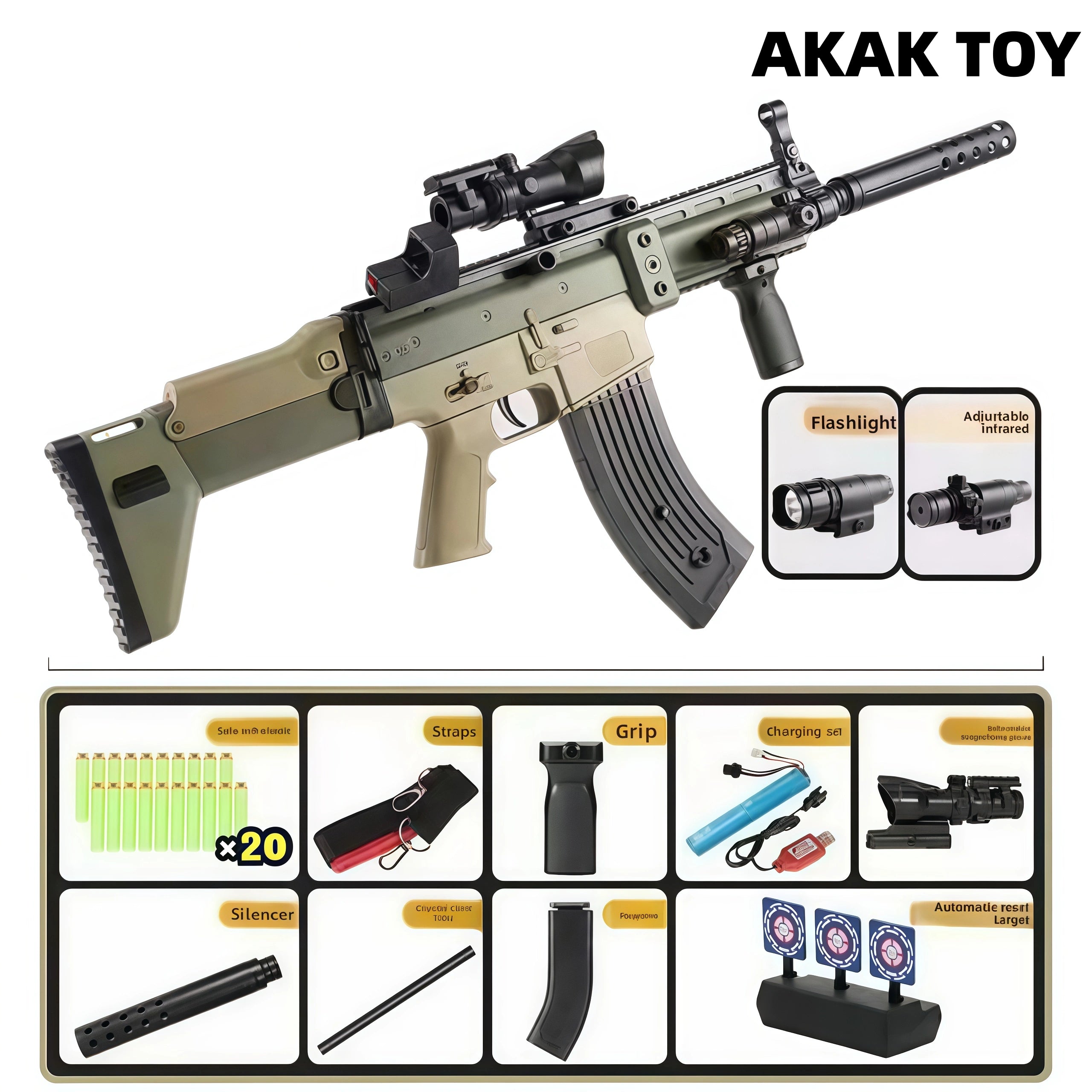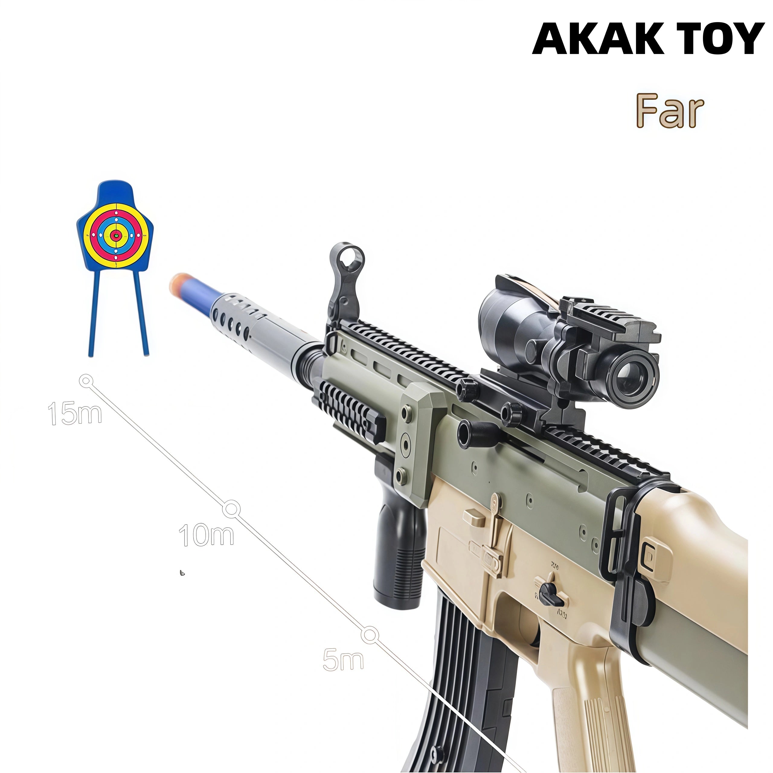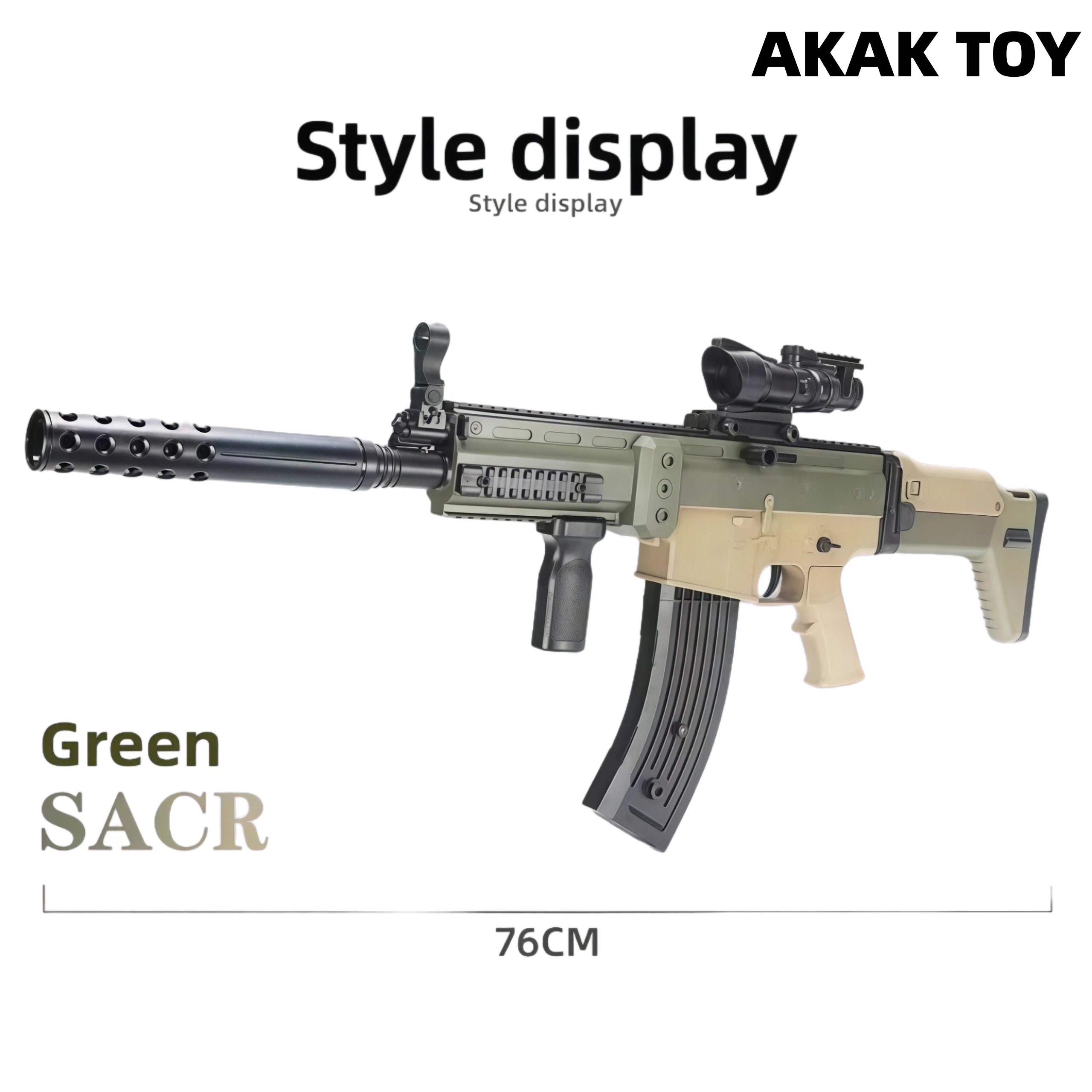 This SCAR soft bullet gun is equipped with a high-torque carbon brush motor, which doubles the performance, high speed and low noise. The powerful power system allows the range to reach 15 meters. It also supports semi-automatic/automatic shooting mode. Its buttstock can be folded with one button, and it is equipped with an adjustable zoom lens, a large-capacity magazine and safe EVA soft bullets to bring a pleasant gaming experience. Features:1. Electric burst, long-range sniping, folding buttstock2. Safe soft bullets, strong power3. Range: 15-20 meters4.Shooting mode: fully automatic/semi-automatic5.Ammunition type: full-length Nerf darts6. Size: 76 cm Packing list:1*SCAR soft bullet gun1*Flashlight1*Infrared1*Sling strap1*Grip1*Magnifying lens1*Silencer1*Cleaning tube1*Magazine1*Automatic reset target1*Rechargeable battery1*USB charging cable20*Soft bullets