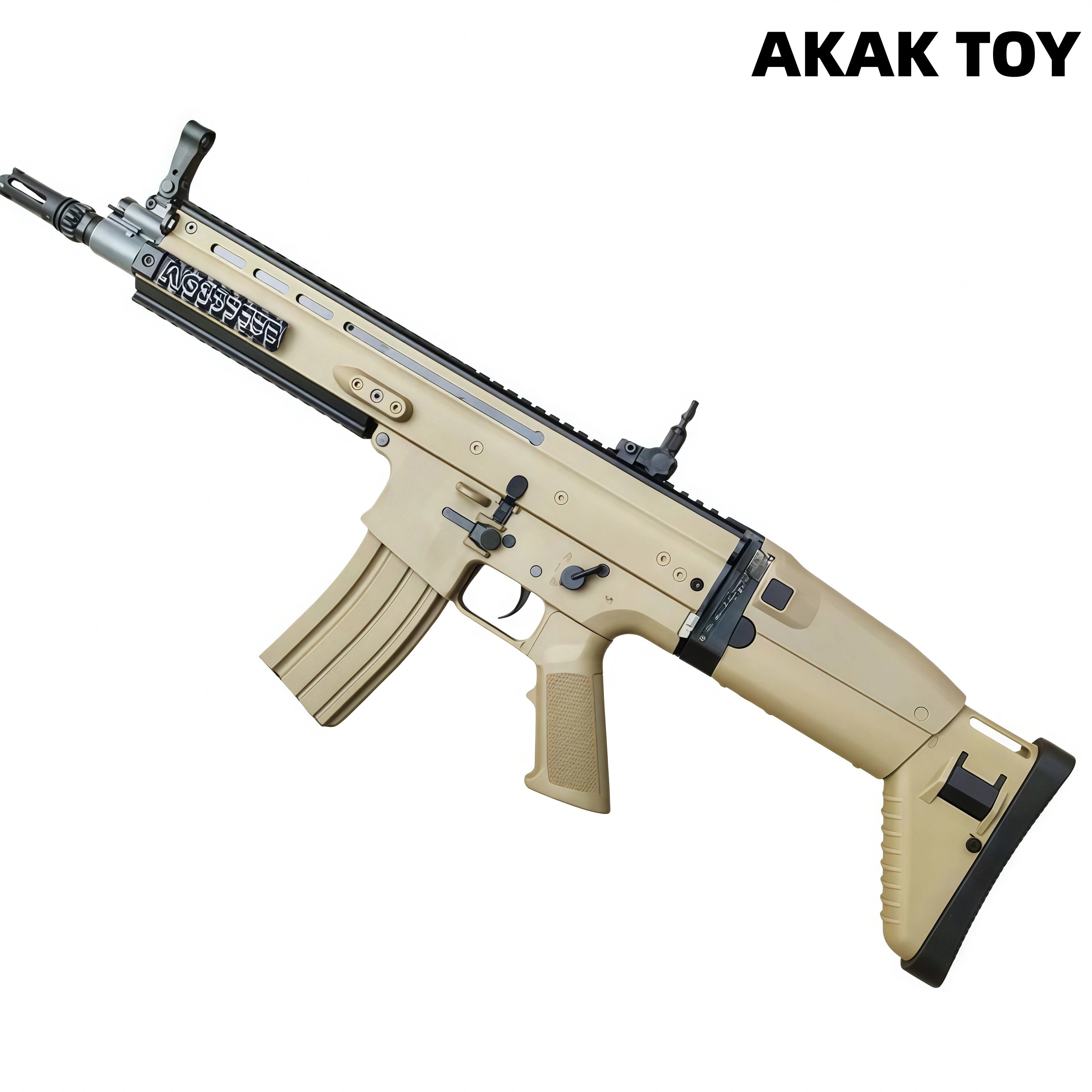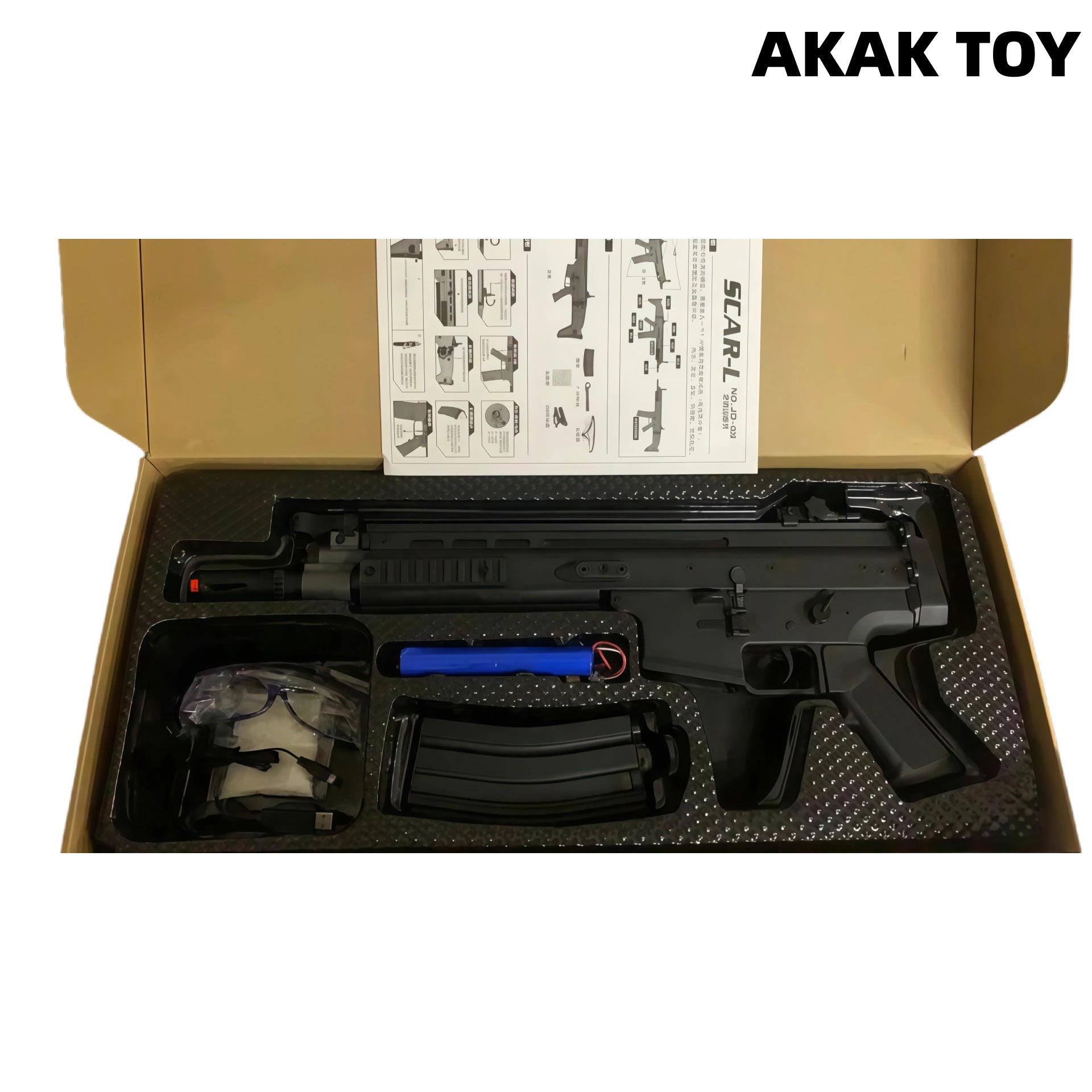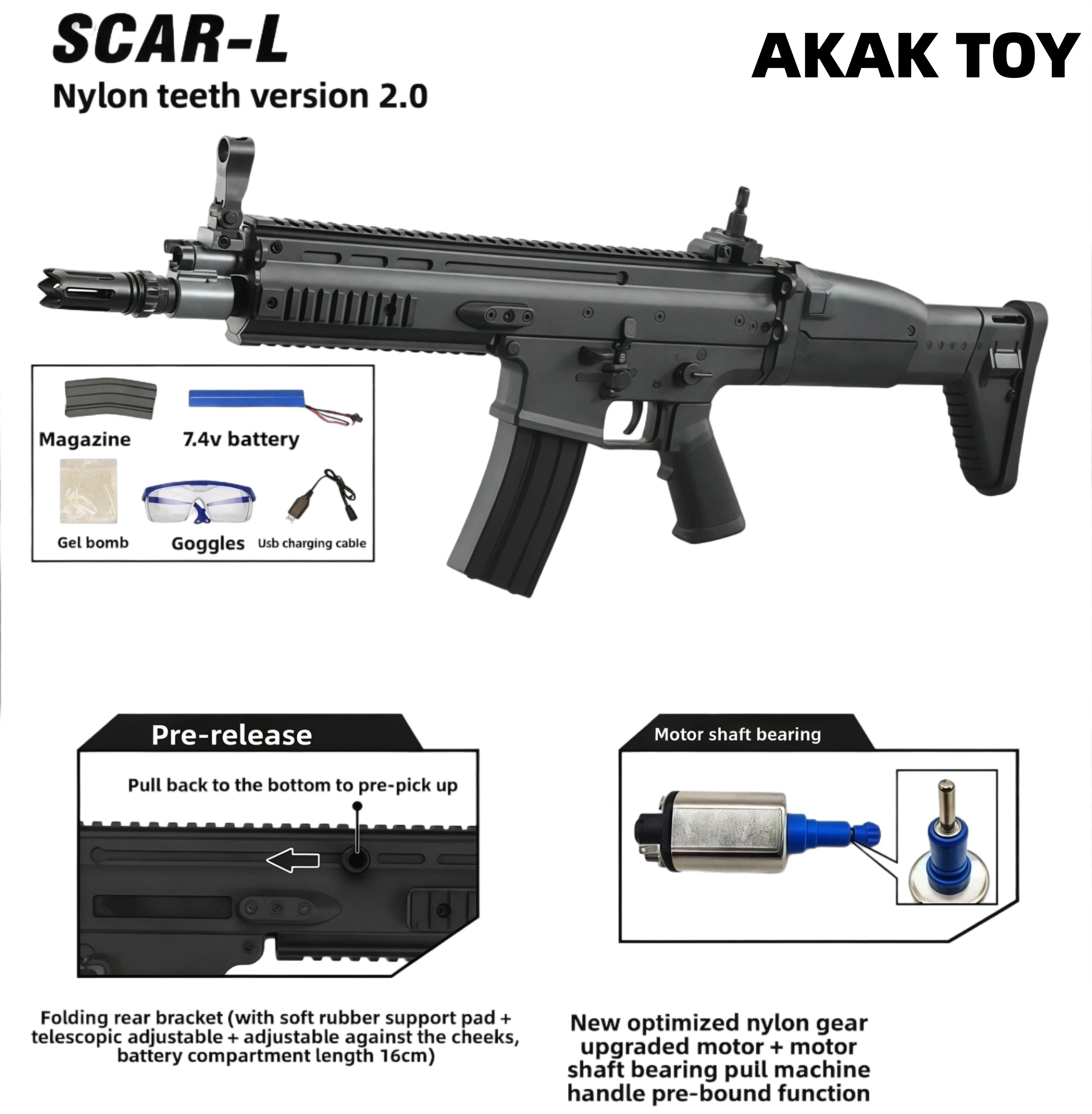 --This designer nylon gel gun, meticulously crafted by CYMA-JUND, utilizes a CYMA V3 nylon gearbox and an alloy barrel that's 2cm longer than the standard outer barrel, enhancing shooting stability and accuracy. --The newly optimized nylon gear system, combined with an upgraded motor and motor bearings, ensures smoother shooting and increased durability. --The charging handle pre-loads the round, and chambers the chamber by pulling it all the way back, providing a realistic and smooth operation. --The gun features a foldable buttstock for seamless storage and use, while meticulous attention to detail goes into its design and manufacturing. --This gun is compatible with magazines from other M4/M16 series gel jet electric guns, holding approximately 200 gel balls, ensuring a long-lasting, continuous shooting experience. Features:1. Folding buttstock, pre-fed2. Removable accessories, lower feed clip3. Material: Nylon4. Shooting Mode: Semi-automatic/Auto/Safe5. Range: 20-25 meters6. Fire Rate: 230-240 fps7. Ammunition Type: 7-8mm Gel Blaster8. Dimensions: 80 * 25 cm Packing List:1 * SCAR-L Gel Blaster1 * Magazine1 * Goggles1 * 7.4V Battery1 * USB Charging Cable1 * Gel Balls (10,000 pcs)