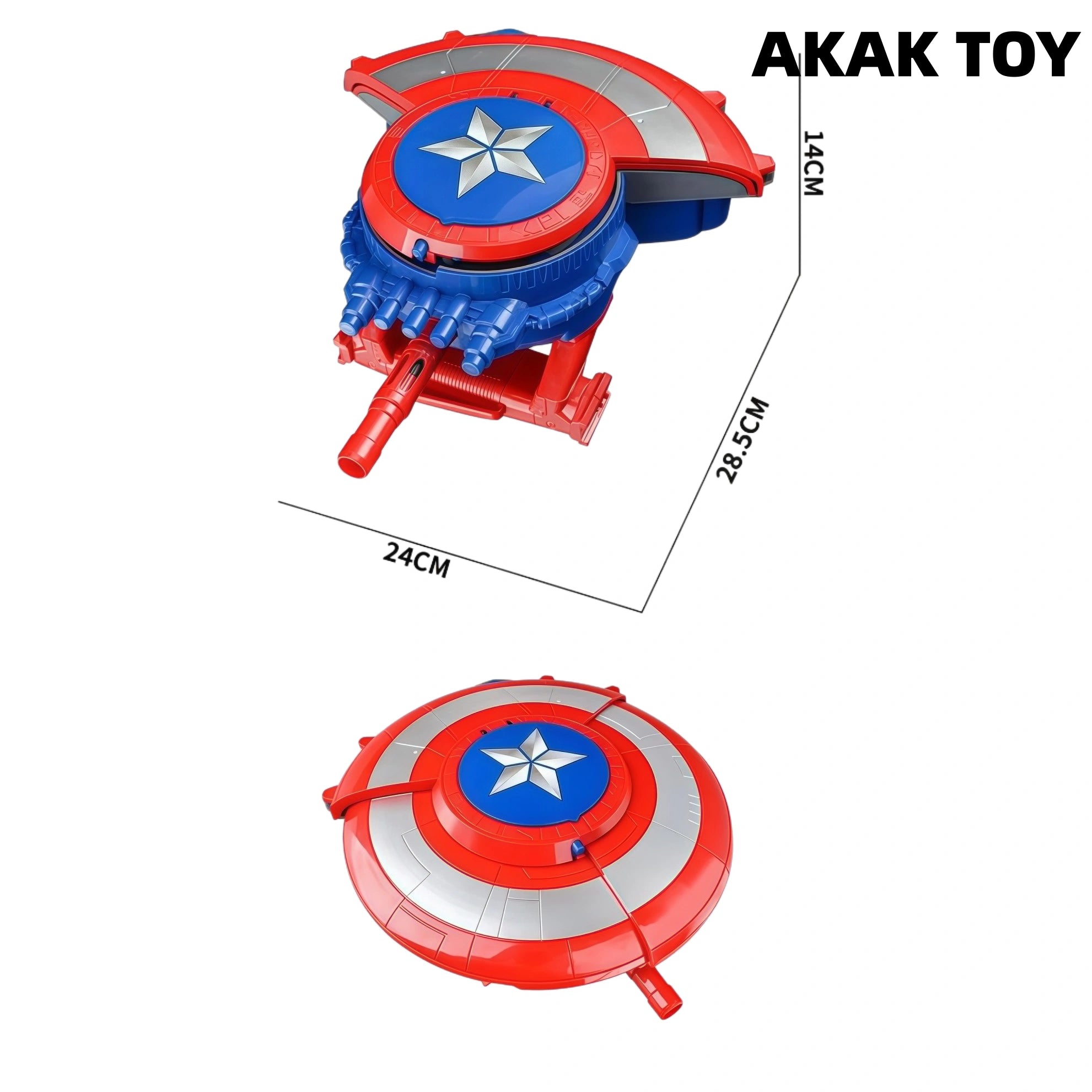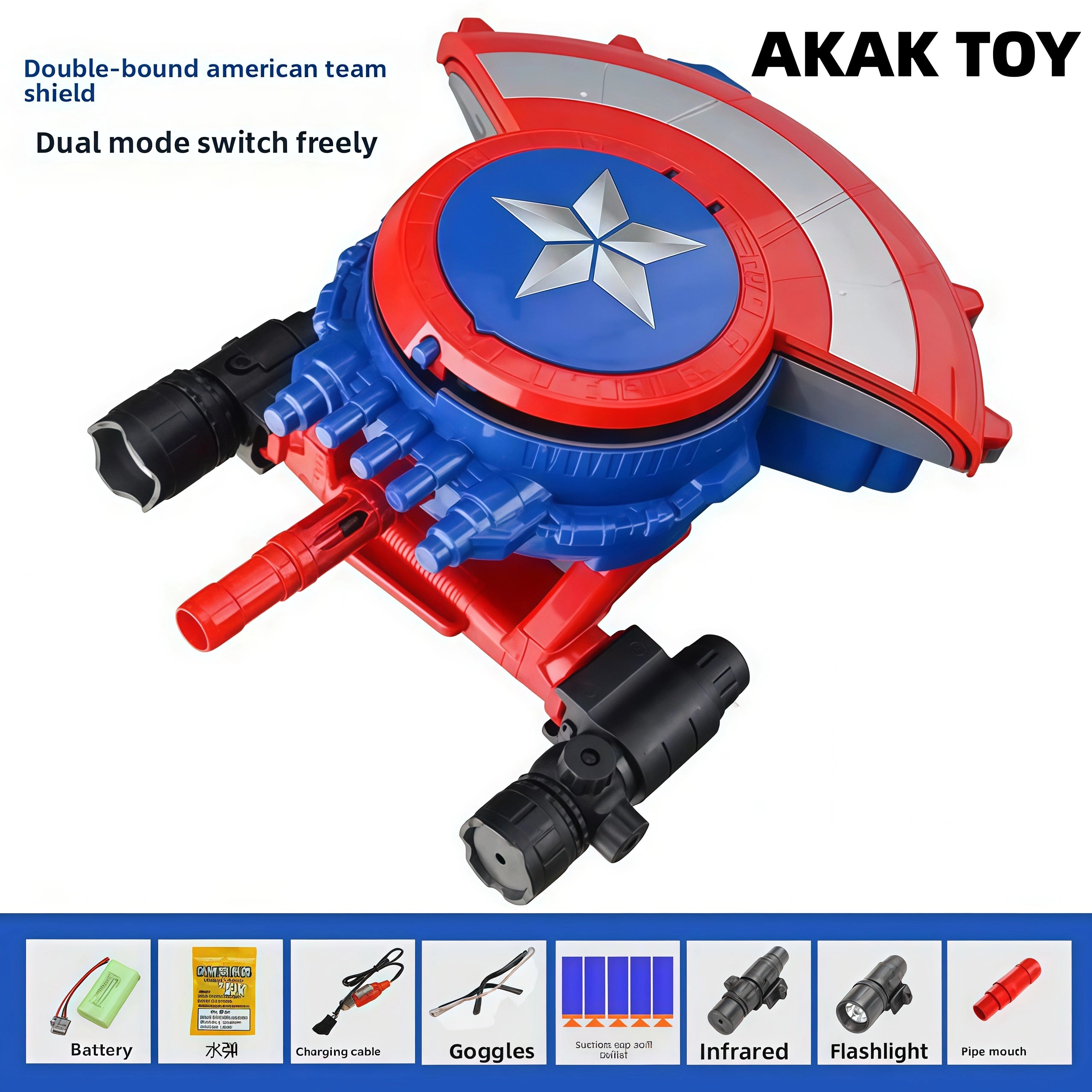 Captain America's soft bullet gun gel blaster uses dual-mode switching, shield defense/shooting attack free deformation! Supports the launch of hydrogel balls and suction cup soft bullets to meet the needs of multi-scene combat. Electric burst, full firepower, and a range of up to 18 meters, bringing a shocking combat experience. Features:-Dual modes, dual bullet types, shield shooting toys, two appearances can be switched freely with one button, experience different designs-Shield mode is a protection mode, which has a defensive effect, and shooting mode is a combat mode, long press to shoot continuously, and continuously fire bullets-Electric multi-shot burst, long-distance continuous shooting without jamming, shooting distance up to 18 meters-Large-capacity magazine, high-energy lithium battery, shield protection, electric burst-Two bullets: soft bullet/gel ball 7mm-Two modes: shield/shooting-Material: ABS plastic, size: 24 cm-Shooting mode: electric/range: 18-20 meters Packing list:1*Electric shield1*Nozzle1*Flashlight1*Infrared1*Rechargeable battery1*Charging cable1*Hydrogel balls (10,000 pieces)1*Goggles10*Suction cup soft bullets