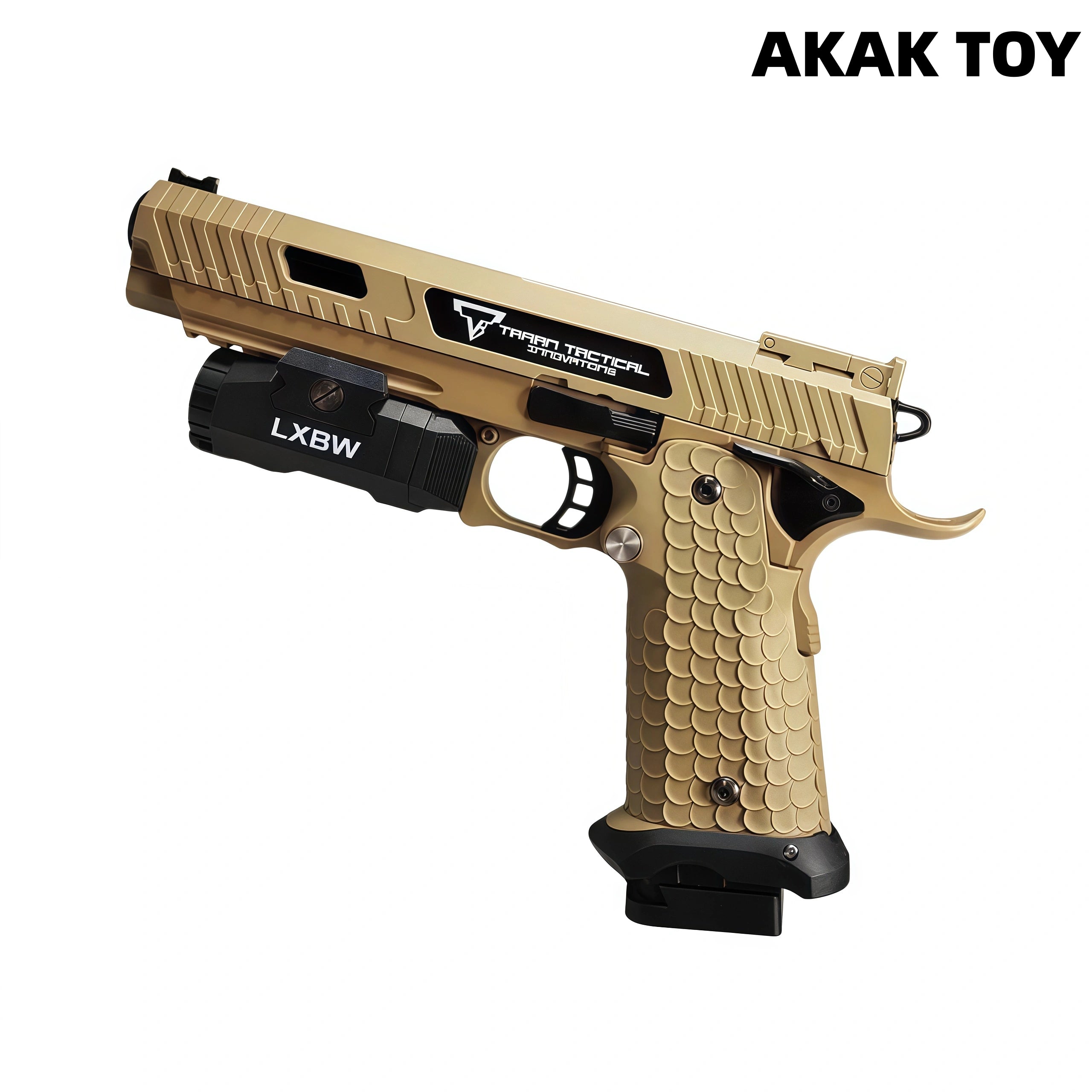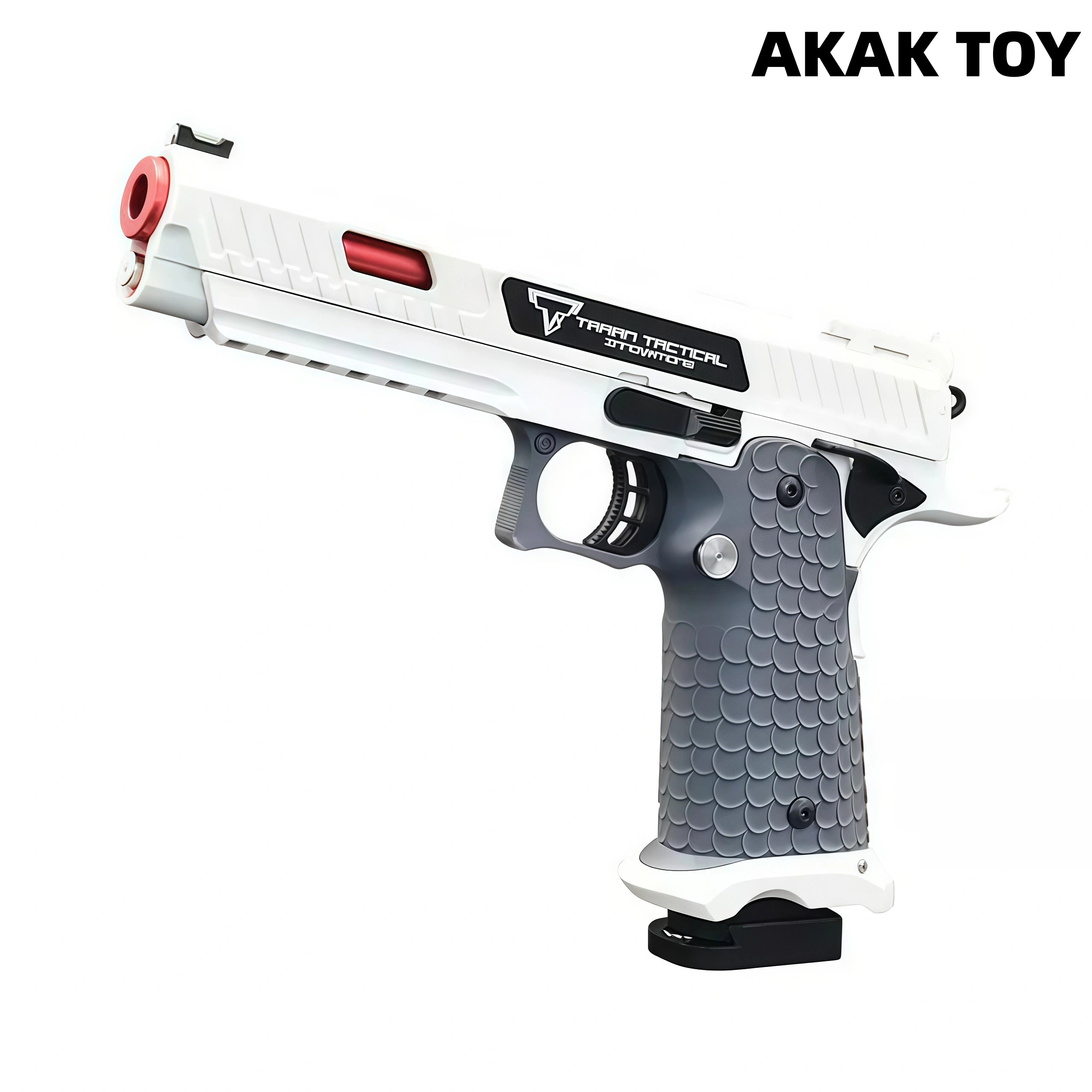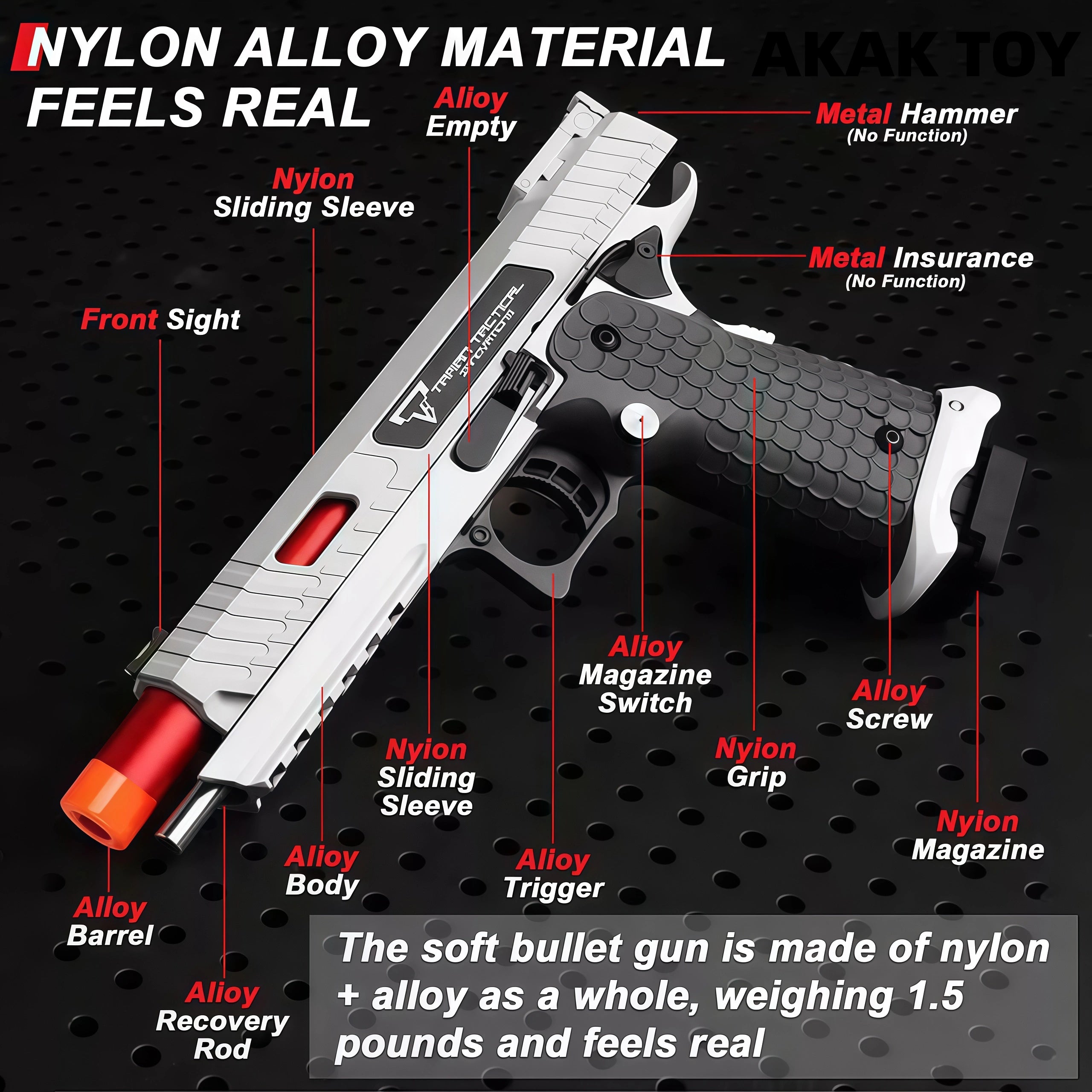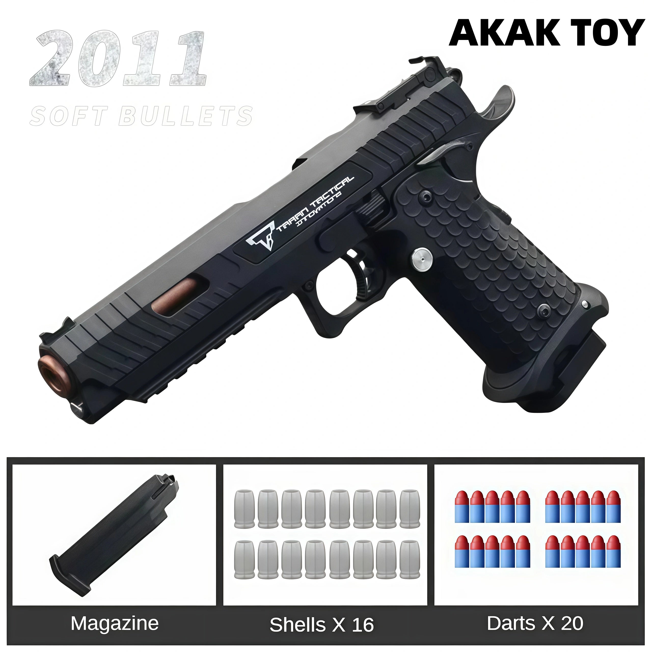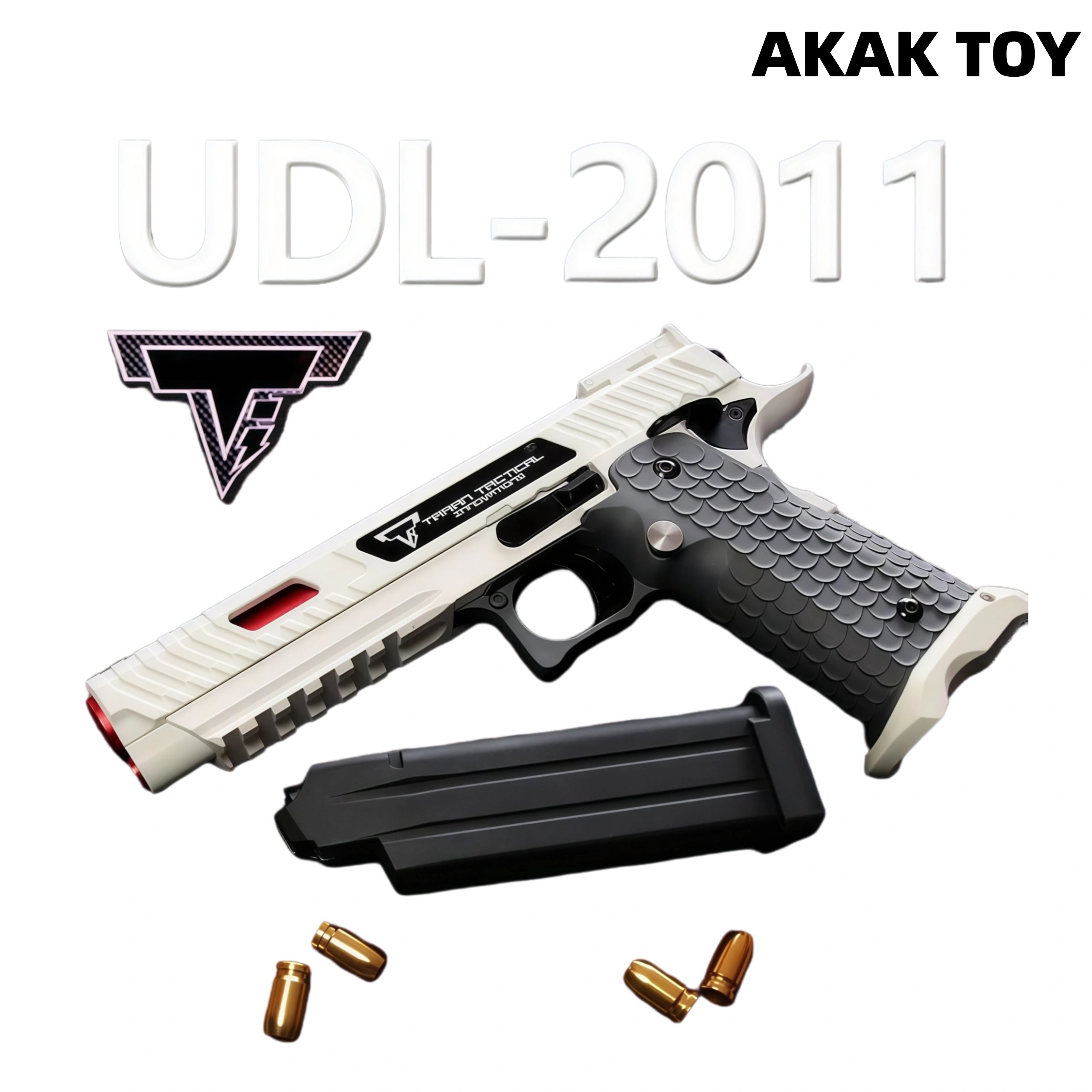 1.Quick-release design: Utilizes a quick-release mechanism, allowing for tool-free disassembly and installation, making maintenance and replacement more efficient. 2.Integrated tactical configuration: Integrates a front-end fiber optic sight for improved aiming clarity; equipped with a standard Picatinny rail at the bottom, compatible with various tactical accessories. 3.Empty position and hang up: Features spent cartridge ejection and bolt hold-open function after the last round is chambered. 4.Metal components: Metal inner barrel, metal safety, metal trigger, metal hammer, metal magazine release button, metal recoil lever, metal slide stop. Features:1. One-click quick release, empty position and hang up2. Pull bolt to eject case, lower magazine supply3. Shooting mode: Manual4. Range: 10-15 meters5. Firepower: 70-80 FPS6. Material: Nylon + Metal7. Ammunition Type: 7mm EVA Soft Bullets8. Size: 25*16cm Packing List:1*UDL Combat Master 2011 Foam Toy Gun1*Magazine16*Cast Shells20*EVA Soft Bullets