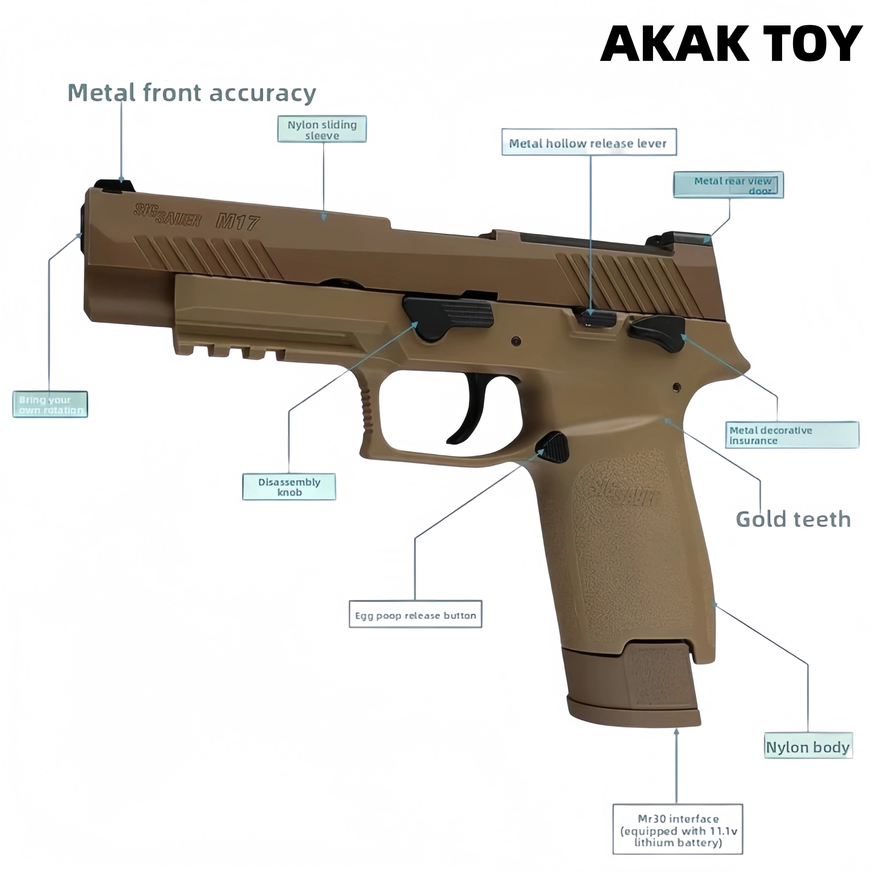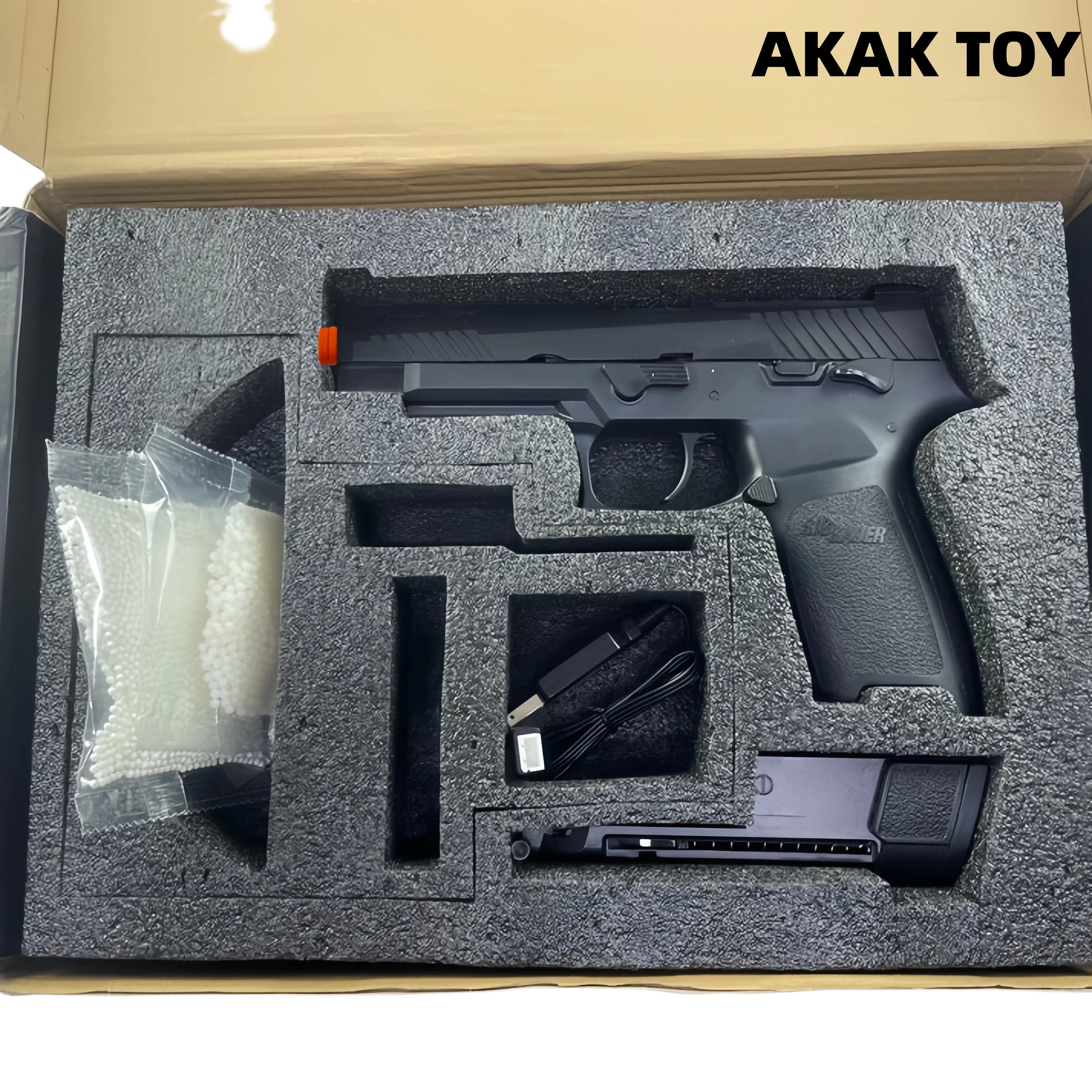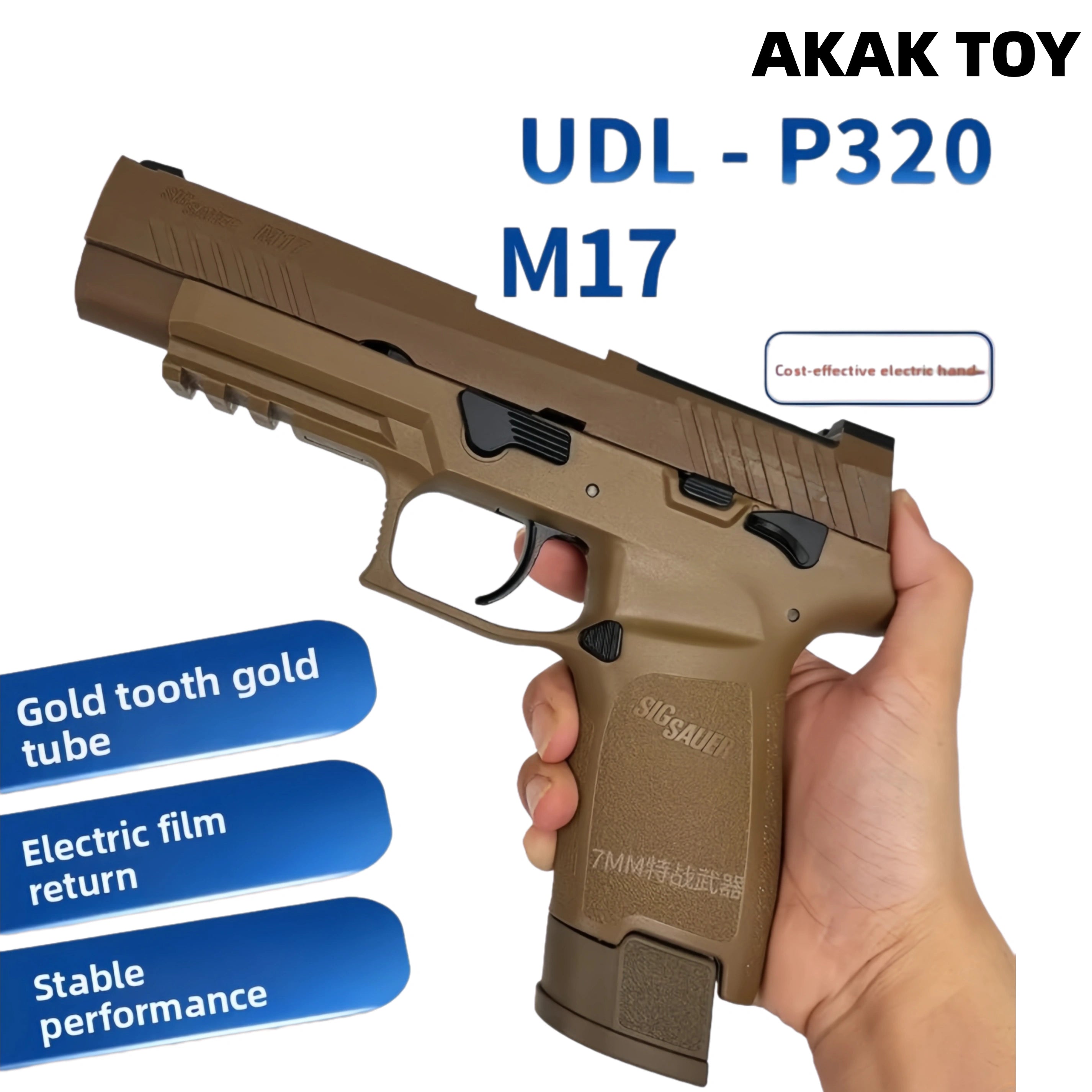 Description:This UDL P320 M17 semi-automatic gun features durable nylon construction and metal gears and a gearbox, ensuring stable and accurate shooting. Through specially designed upgraded components, the UDL gun achieves enhanced power and accuracy, allowing you to easily handle various challenges in games or training. The gun is equipped with a rich variety of metal components, including gold teeth, a gold barrel, a gold ladder, a gold slide, metal functional parts, and a metal magazine base. Every detail has been carefully designed for durability and feel. It supports semi-automatic recoil, empty chamber, and quick release, providing smooth and convenient operation. The lower frame is equipped with a 20mm rail for mounting a variety of tactical accessories to meet your personalized needs. Features:1. Empty chamber stop, recoil2. Electric recoil, gold teeth, and gold barrel3. Frame material: Nylon4. Gearbox material: Metal5. Gear material: Metal6. Shooting mode: Semi-automatic7. Range: 20 meters8. Rate of fire: 190-200 fps (1.1mm spring loaded) 230-240 fps (1.2mm spring loaded)9. Ammunition type: 7-8mm gel balls10. Dimensions: 21 * 3 * 16 cm Packaging Contents:1 * P320 M17 gel ball gun1 * Magazine1 * Safety goggles1 * Gel ball barrel1 * Internal jumper1 * 11.1V lithium battery1 * USB charging cable1 * Gel balls (10,000 pieces) Note: Please fully charge the battery after receiving the gel blaster before using it.