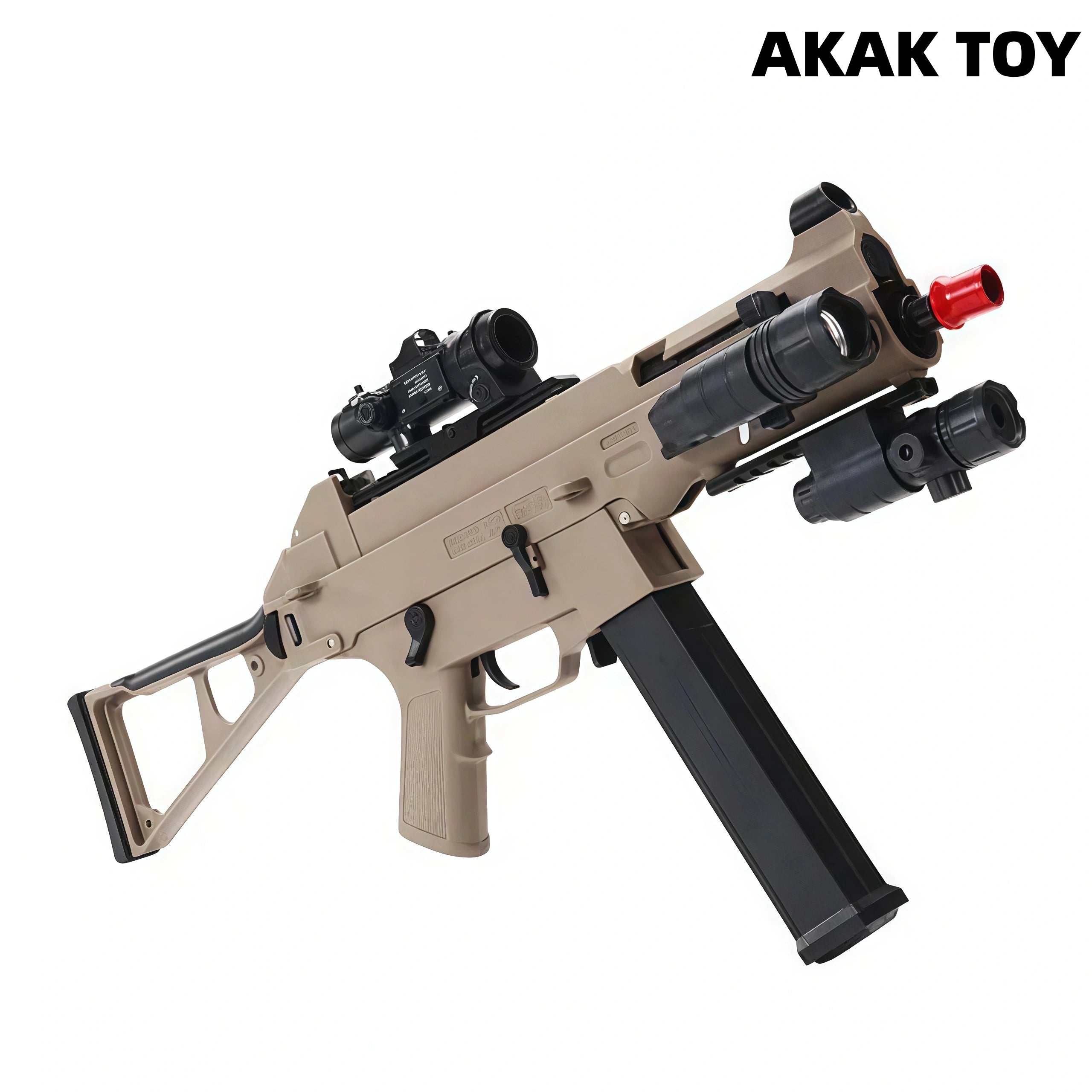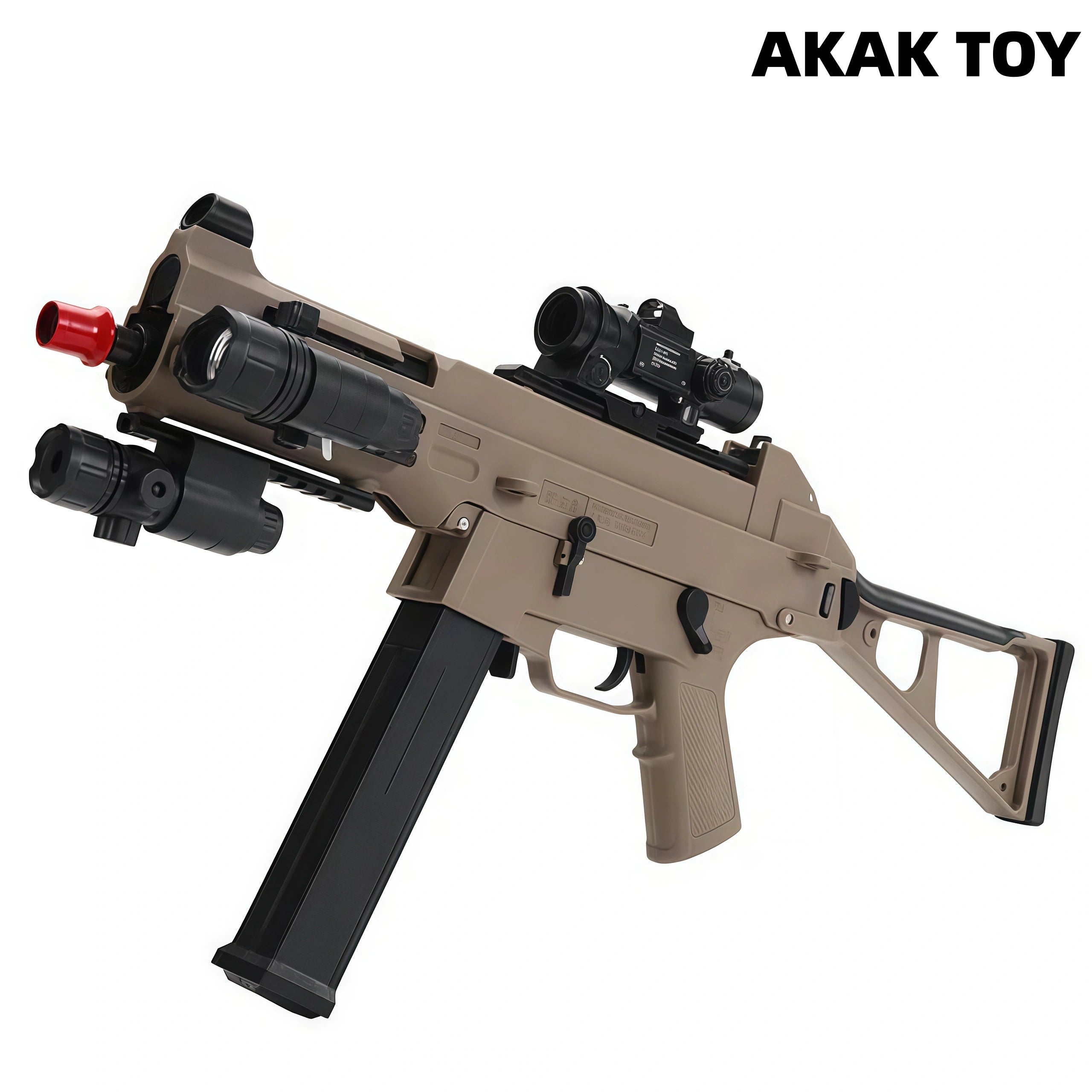 This UMP 45 gel blaster comes with a Gen8 gearbox, foldable stock, scope, flashlight, laser, and even an alloy barrel. Multiple strap attachment points, tactical accessory rails on all four sides, and a rich package of accessories. High-quality surface treatment, strong power and a range of up to 40 meters. Features:1. Removable accessories, lower feed clip2. Foldable stock3. Material: Metal + Nylon4. Shooting mode: Manual/electric5. Battery: 7.4V6. Range: 28 meters+7. Ammunition type: 7-8mm gel ball8. Size: 71 cm Packing list:1*UMP 45 gel gun1*magazine1*scope1*laser1*flashlight1*rechargeable battery1*USB charging cable1*gel ball (10000 pcs)