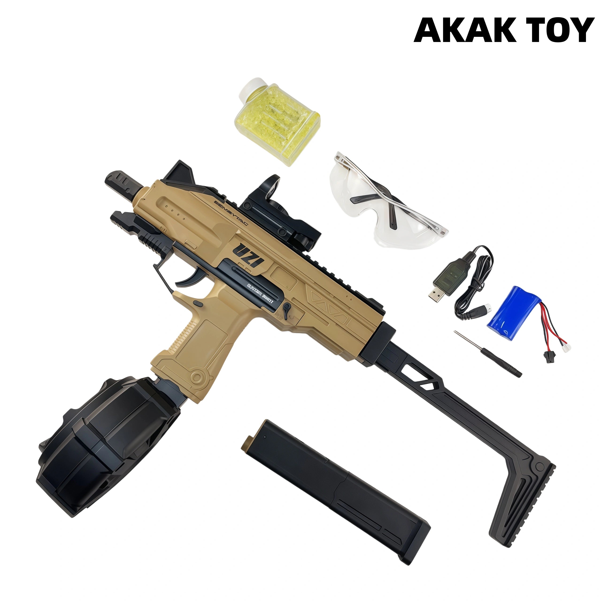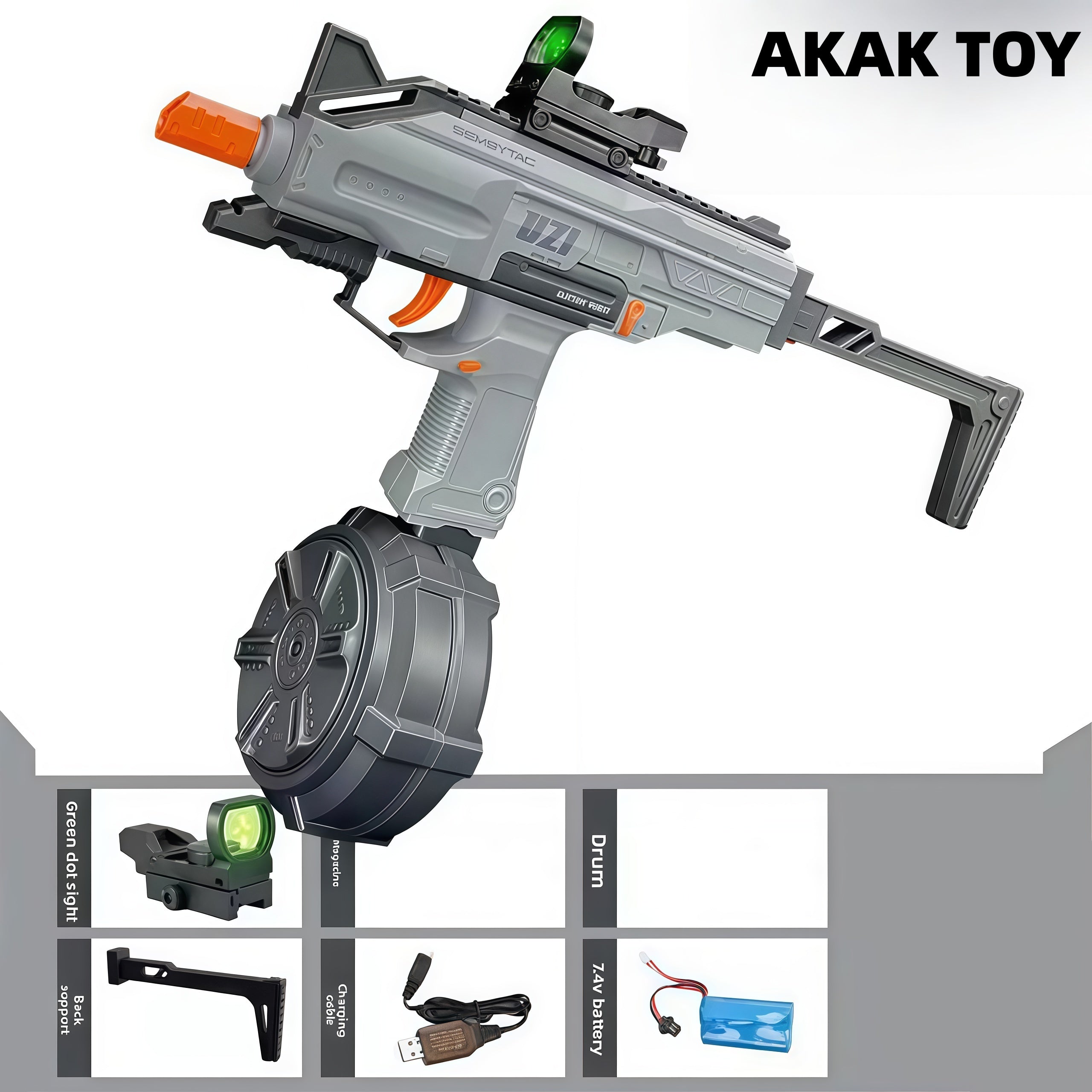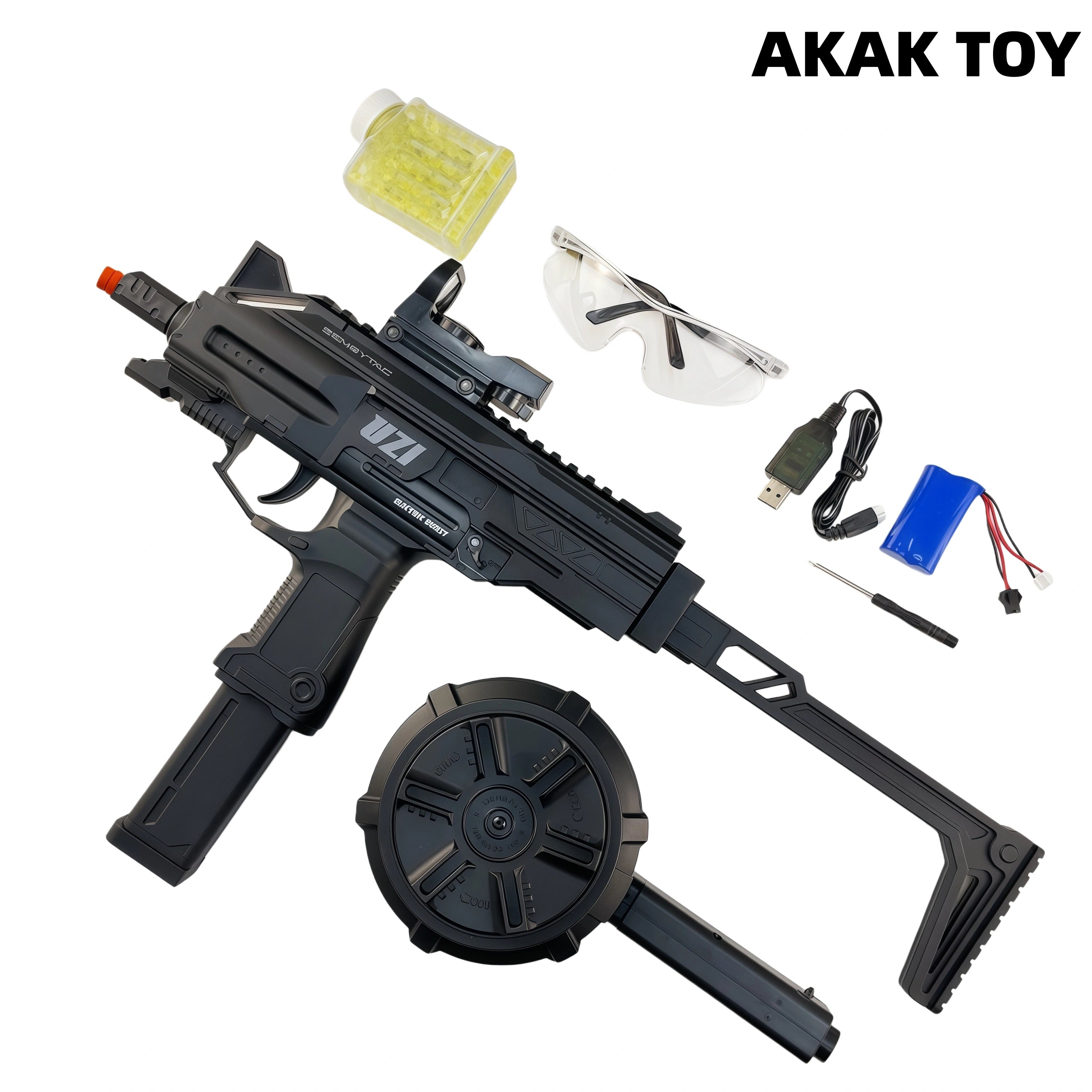 1.Electric burst, powered by lithium battery, long press the trigger for continuous high-speed shooting, bottom-feed magazine, equipped with large-capacity drum magazine. 2.Uzi gel bullet gun adopts a rotating drum magazine design, with continuous fire out put. 3.Equipped with a detachable flash suppressor, Mag focus function, tactical rail and reticle reflex sight, it is both accurate and comfortable. 4.High-performance configuration. Features:1. Removable accessories2. Rotating drum magazine feeding 3. Shooting mode: fully automatic4. Range:15-20 meters5. Material: nylon+metal,6.Firepower:150 FPS6. Ammunition type: 7-8mm gel ball7. Size: 52 cm Packing list:1*UZI gel blaster1*goggles1*long magazine/drum magazine1*buttstock1*green dot sight1*screwdriver1*7.4v rechargeable battery1*USB charging cable1*gel gun (10,000 pieces)