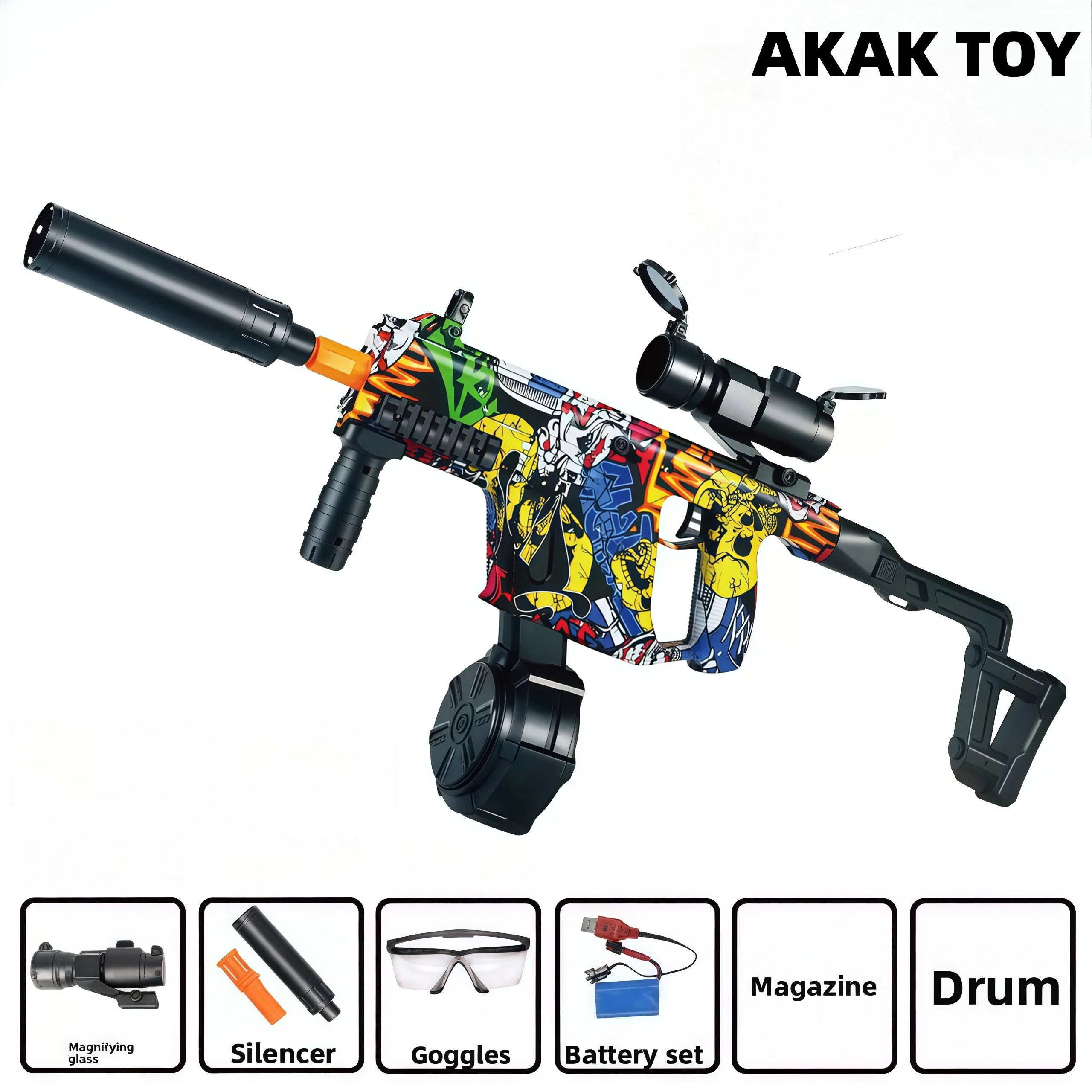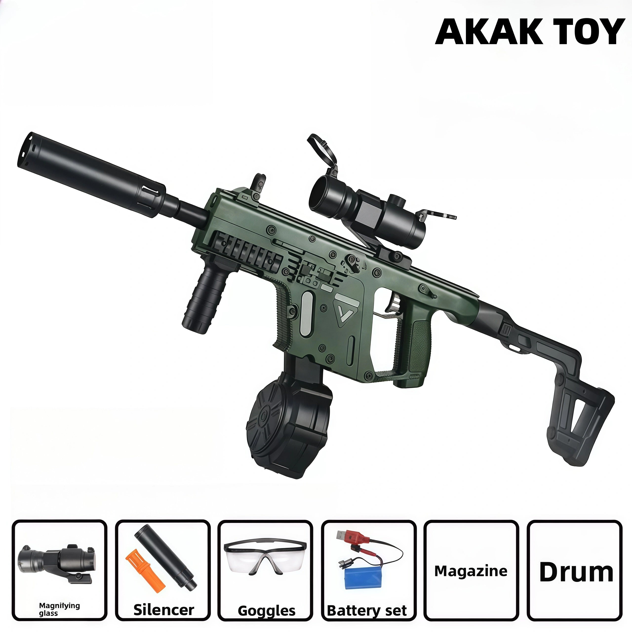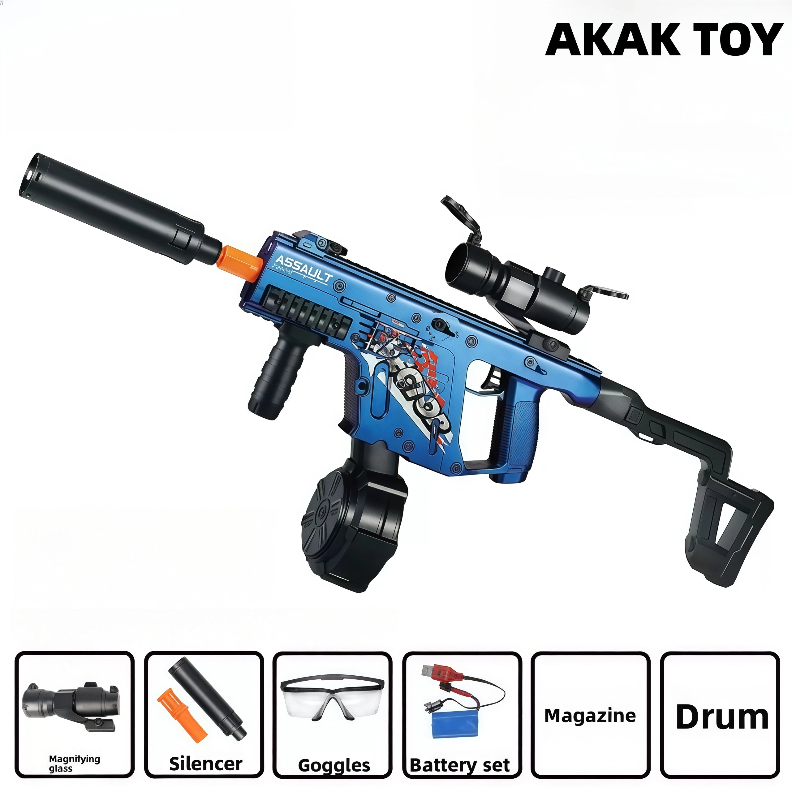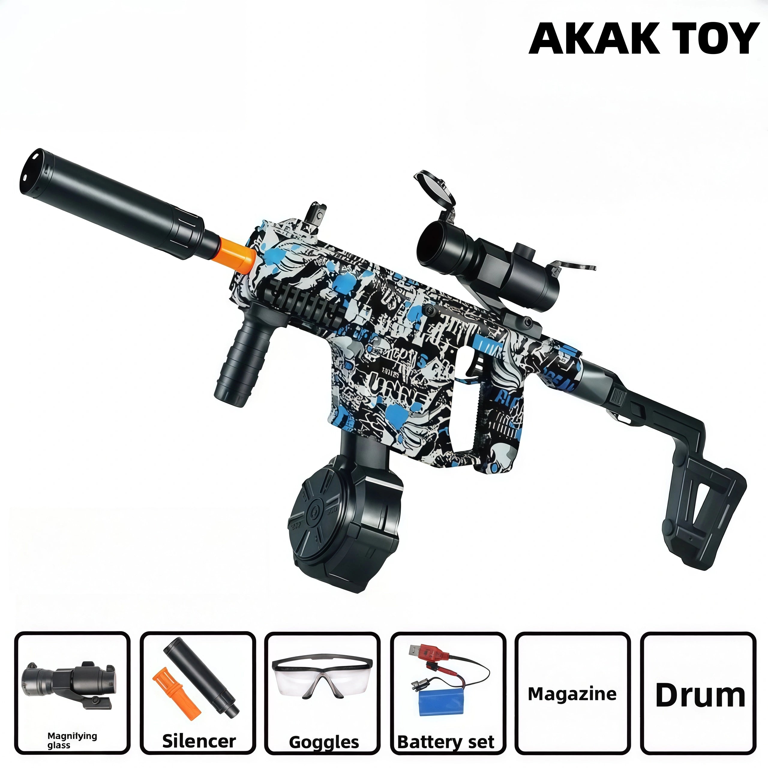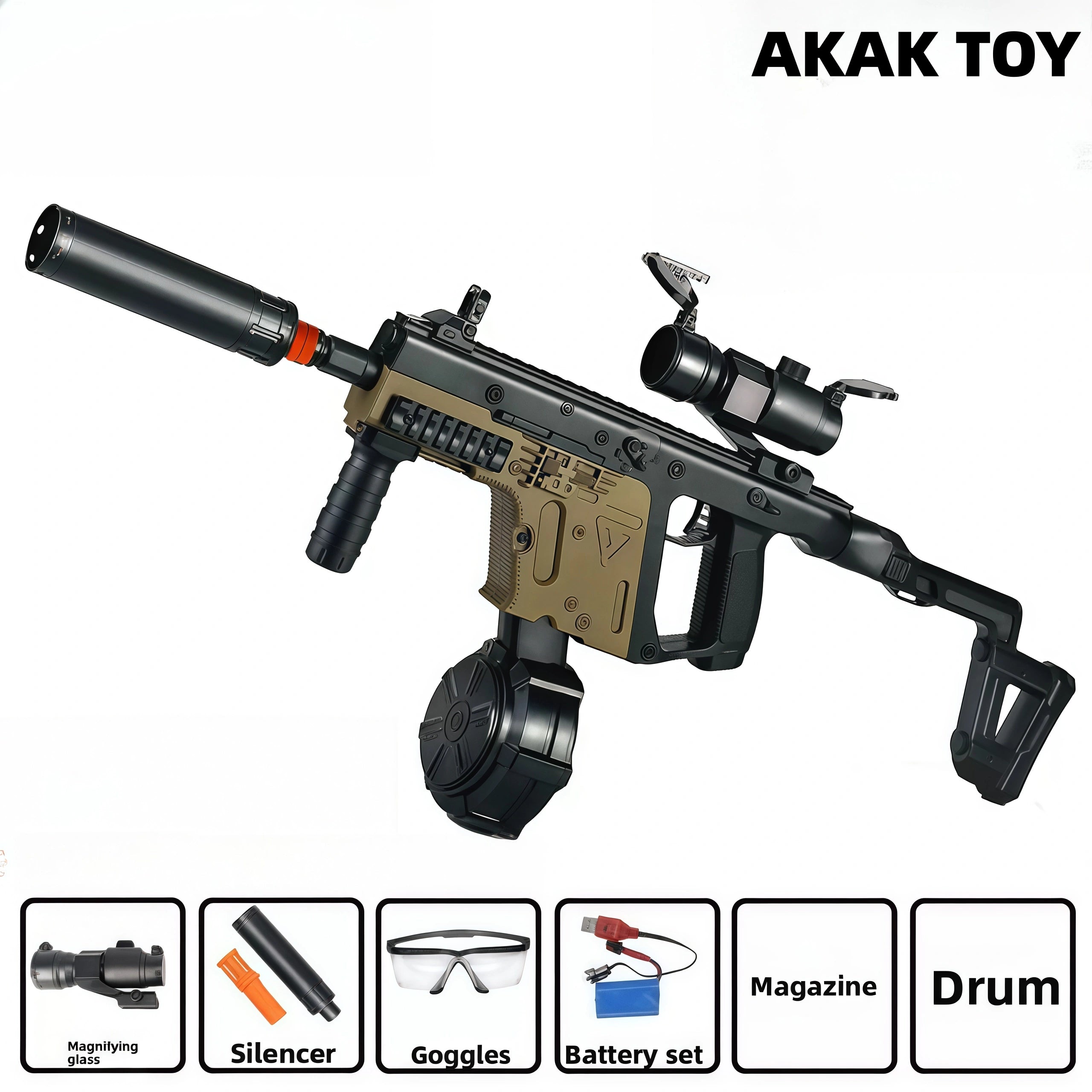 -This Vector toy gun combines the electric burst and manual single-shot modes, which can be switched as needed to bring different experiences to players. -The manual bolt design not only increases the sense of interaction, but also enhances the realism of shooting. -The flip-up lens and foldable buttstock functions are particularly suitable for outdoor activities, increasing convenience and portability. Features:1. Foldable buttstock2. Shooting mode: manual/electric3. Shooting range: 15-20 meters4. Ammunition type: 7-8mm gel ball5. Material: ABS plastic6. Size: 67 cm Packing list:1* Vector gel gun1* magazine1* drum1* lens1* goggles1* orange muzzle1* silencer1* rechargeable battery1* USB charging cable1* gel ball (10,000 pcs)